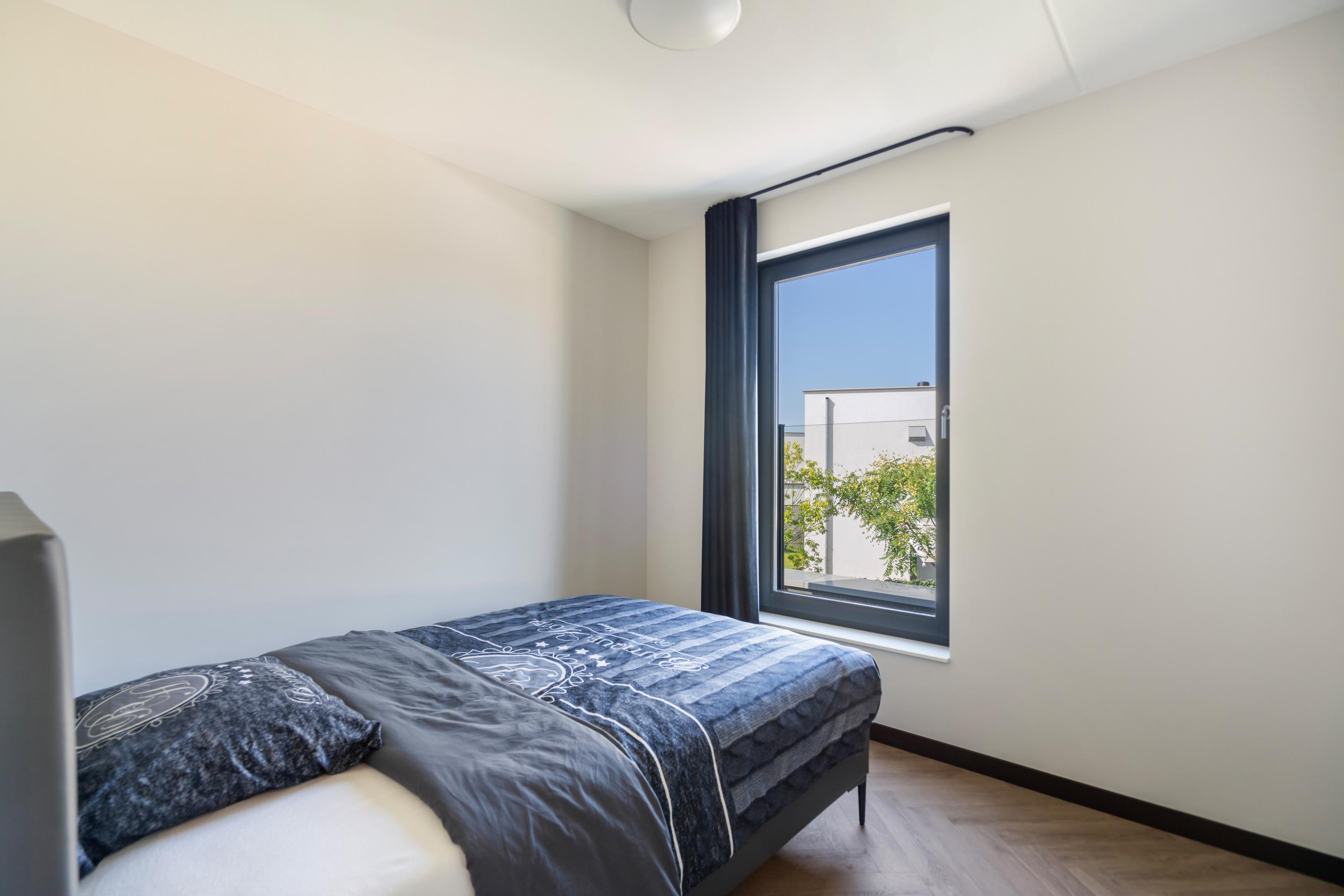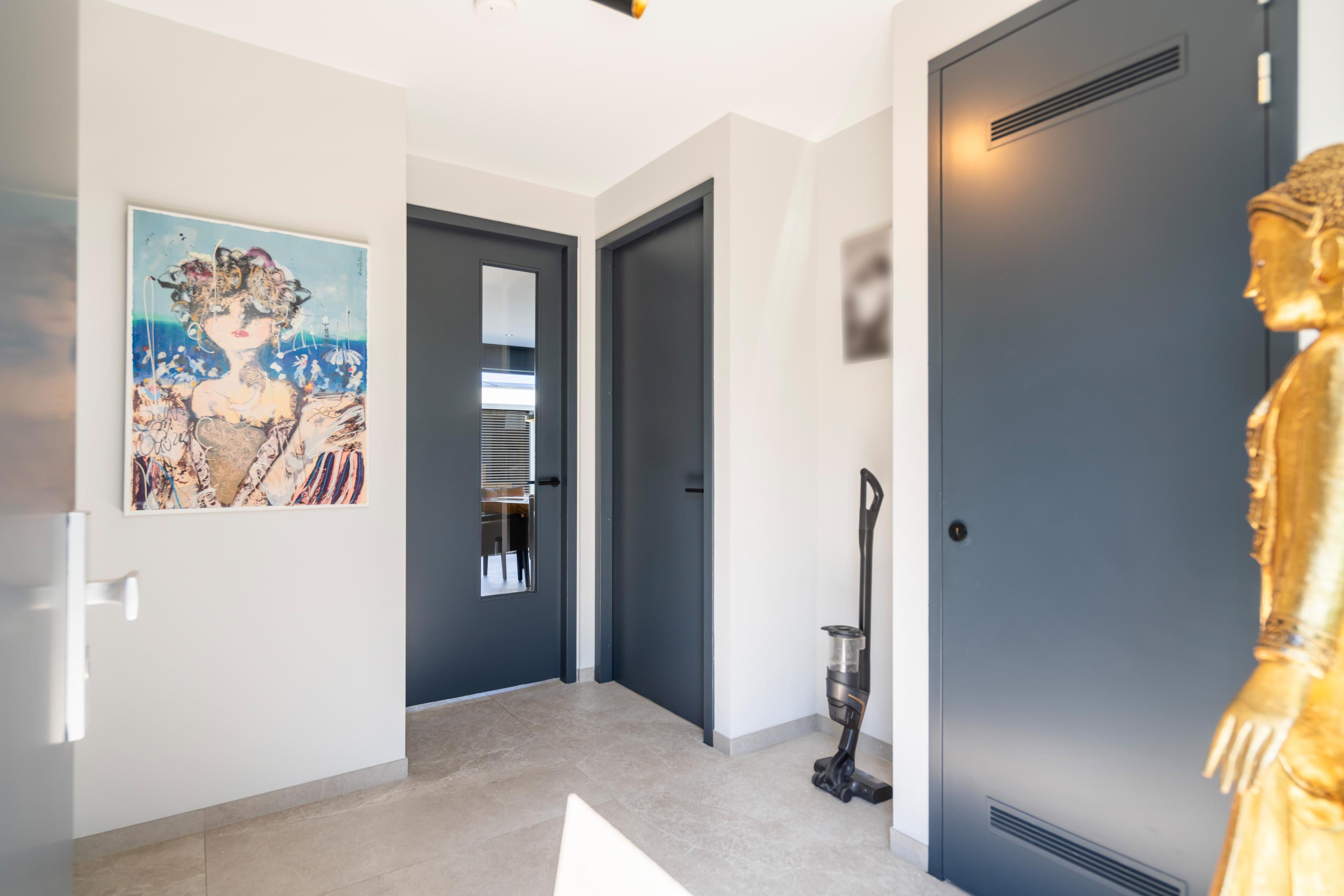 The first floor offers three spacious bedrooms, a luxurious bathroom, and a separate toilet. The bedrooms and landing feature the same modern, threshold?free PVC herringbone floor. Underfloor heating and cooling are also present on this level. One of the bedrooms includes a custom?made wardrobe wall.