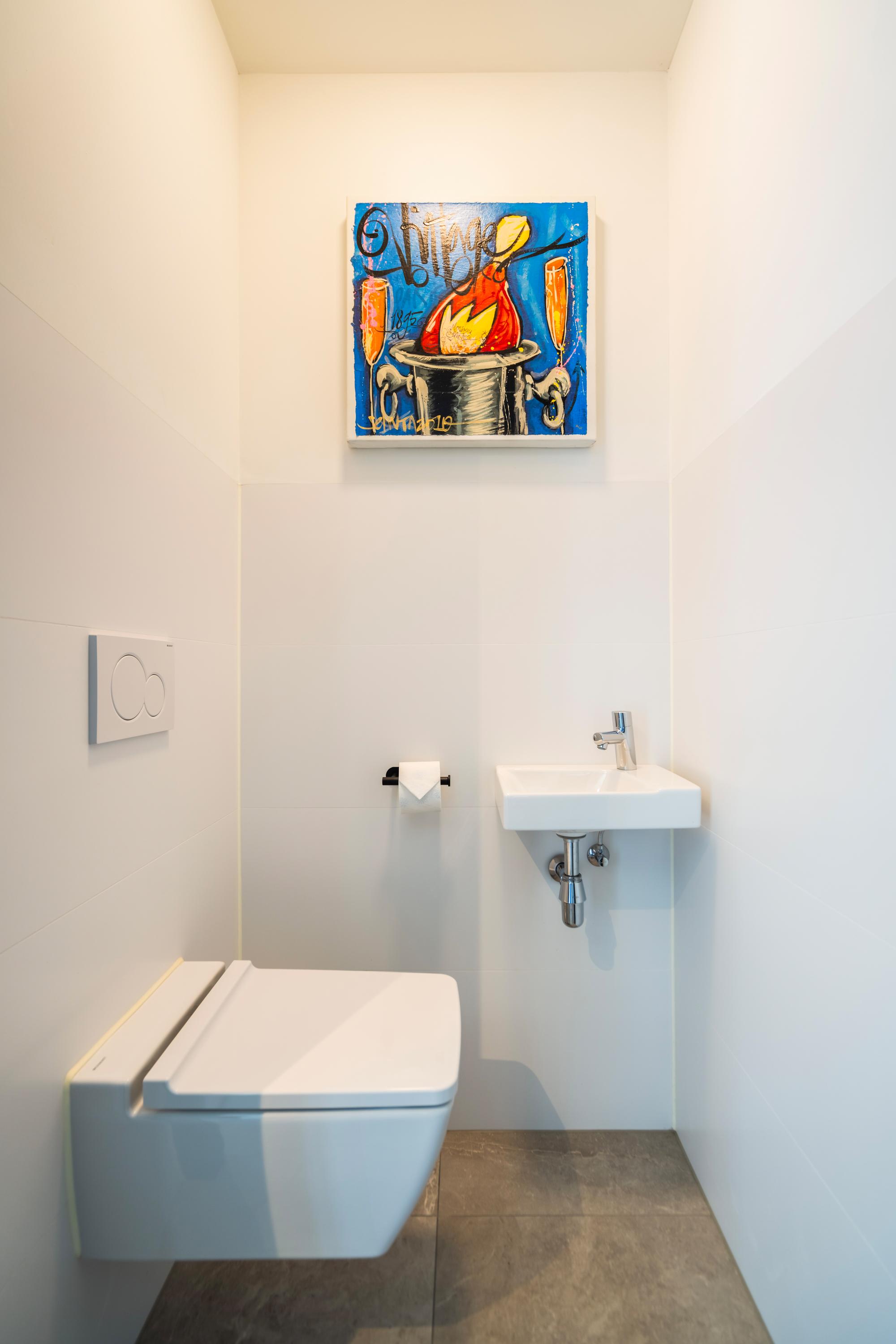 Upon entering the hallway, you will find the meter cupboard and a spacious guest toilet with washbasin. From the generous entrance hall, you have access to the first floor, the living area, and the practical utility room.