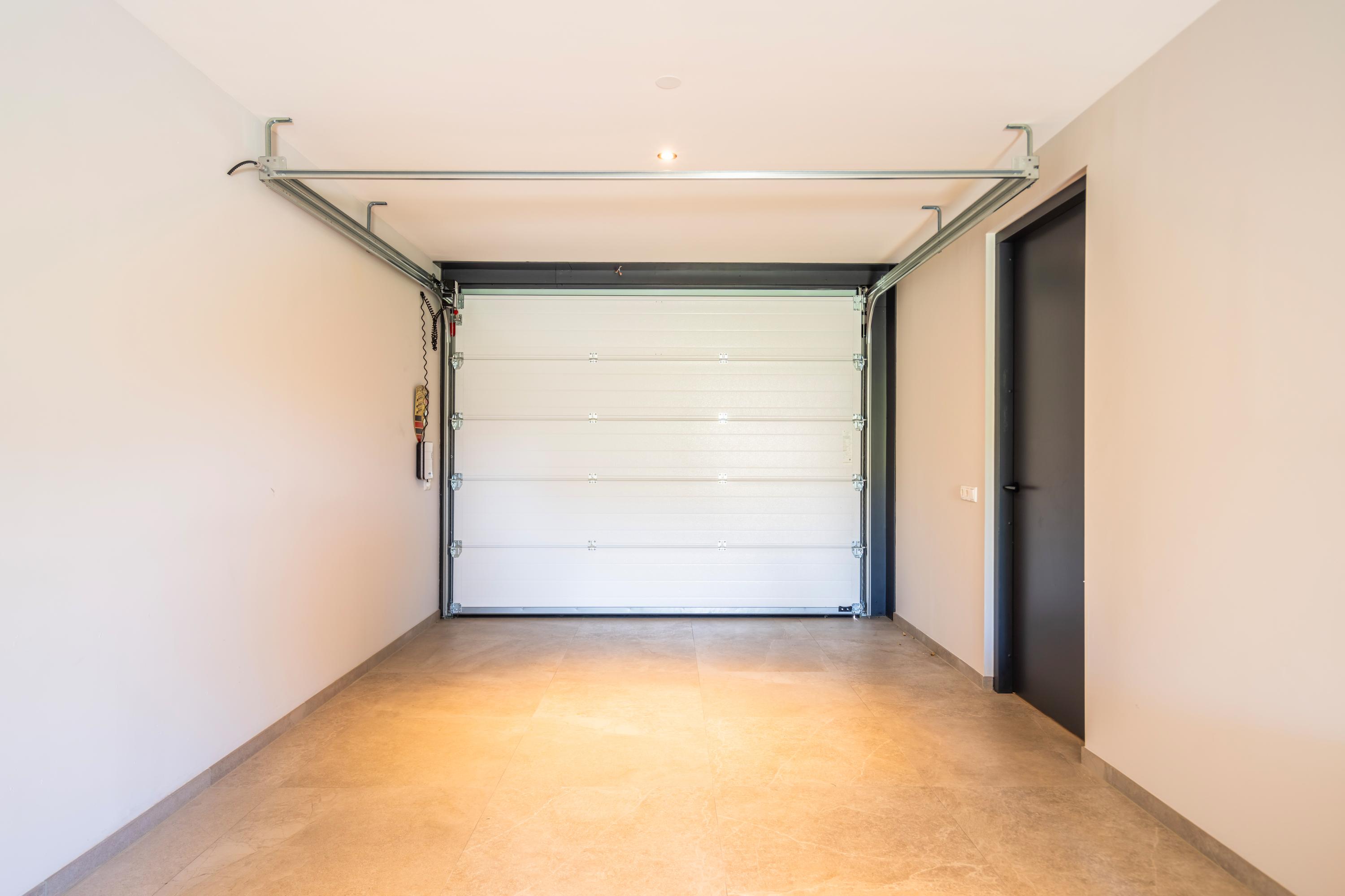 The utility room features a custom?made wall of cabinets, including a refrigerator, storage units, and a raised washing machine setup. From here, you have access to the spacious integrated garage of approx. 38 m². This garage is fully finished with plastered and painted walls and ceilings, the same large tiled floor with underfloor heating and cooling. Due to its size and finish, it can be arranged entirely to your own wishes: