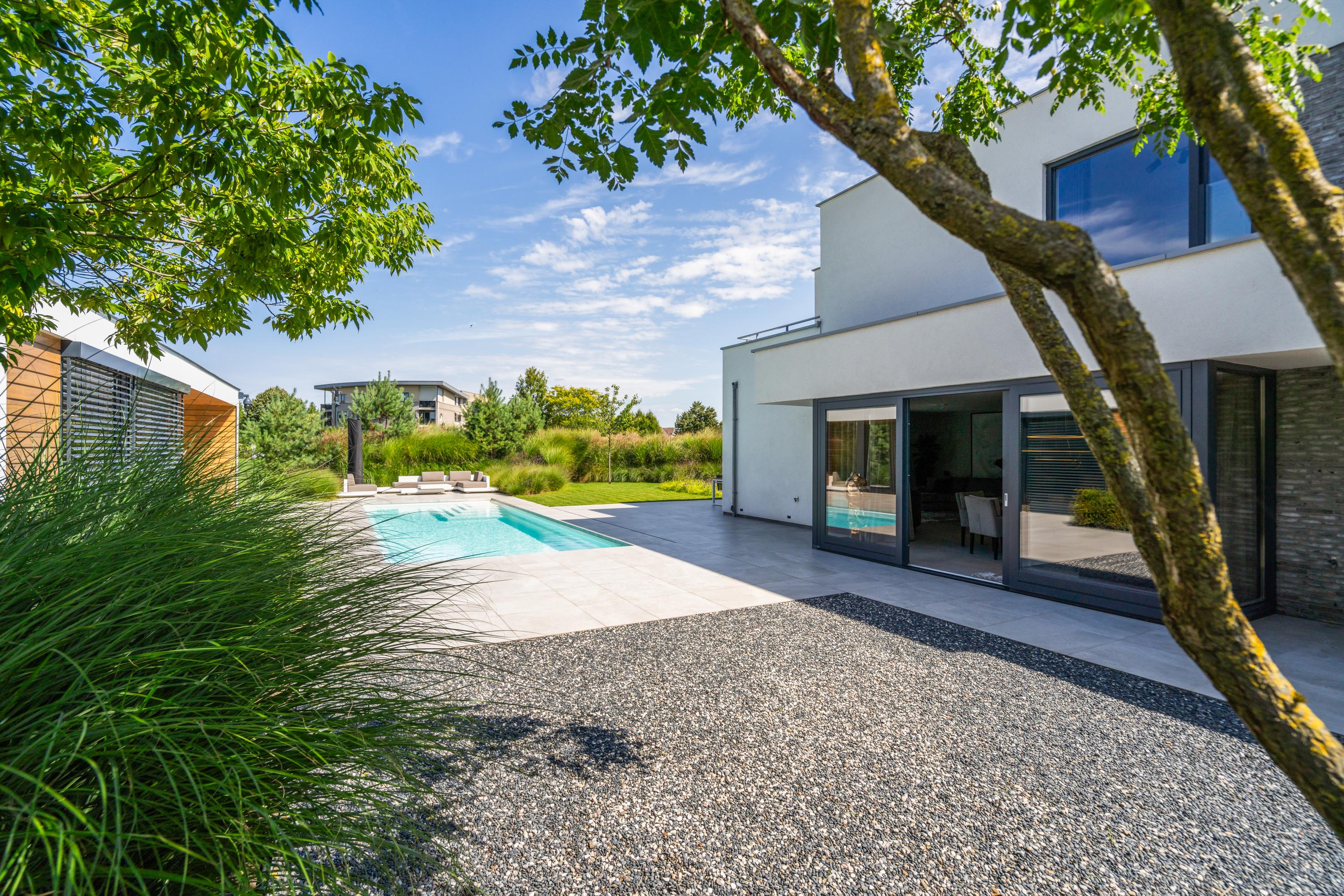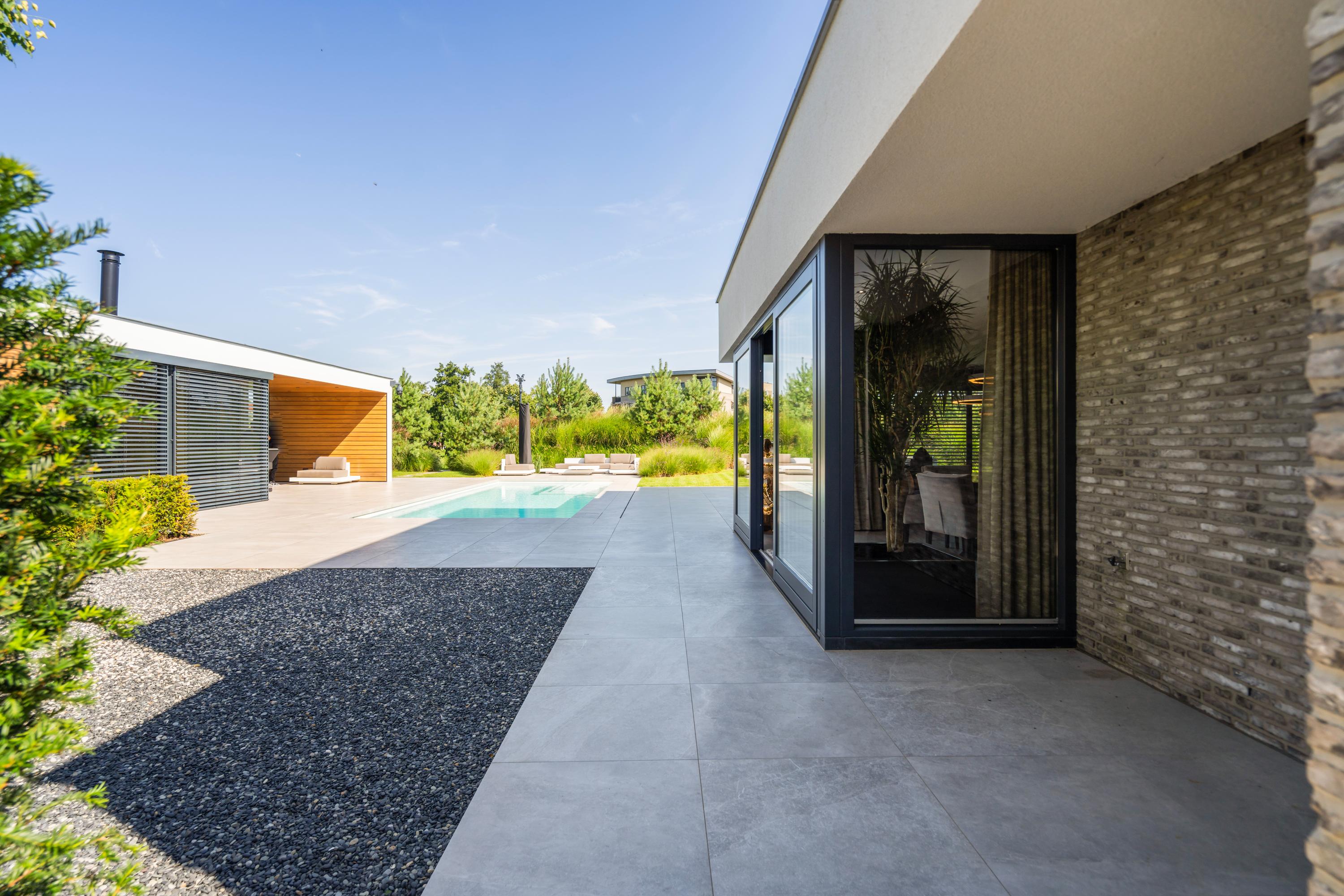 Multiple terraces invite you to enjoy long dinners, drinks, or peaceful moments in the sun. The garden features lawn, gravel, and various plantings — a perfect balance between greenery and the modern character of the home.