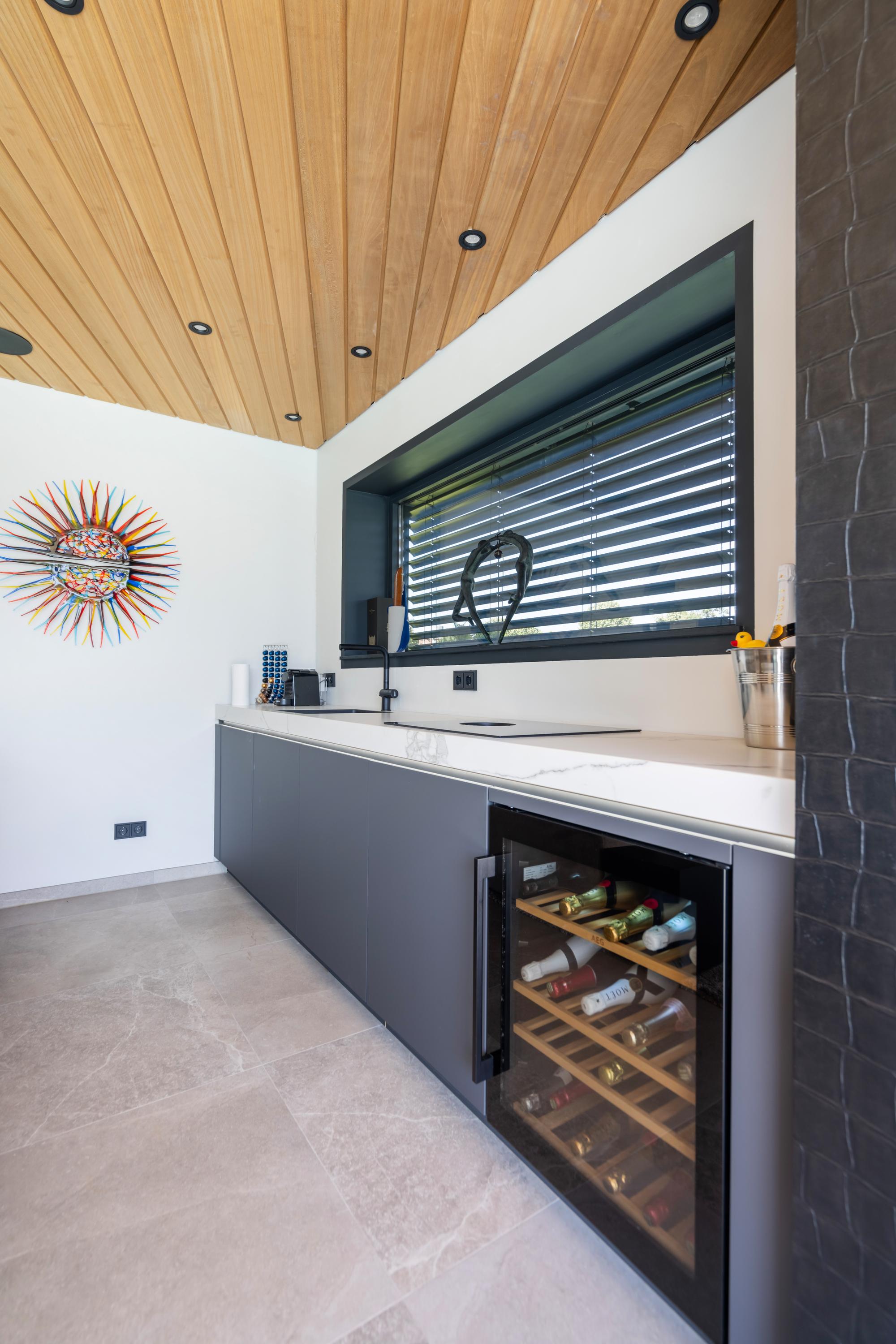 The pool house is equipped with a kitchenette with sink, wine climate cabinet, refrigerator, induction hob with Bora extraction, and various storage cabinets. Built?in speakers and lighting are also present. Outside, you will find an outdoor shower with thermostatic tap. A separate room houses all technical installations.