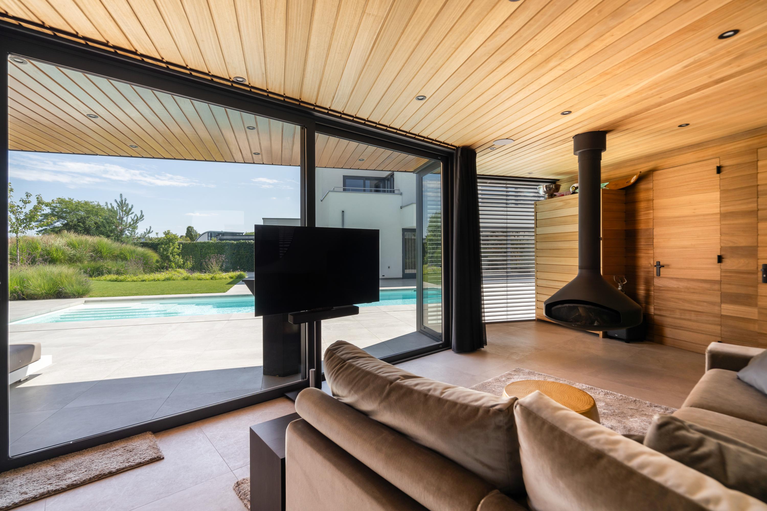 The spacious side and rear gardens are finished to the same high standard. A true highlight is the luxurious pool house, complete with sauna and swimming pool. The carefully selected Finnish wooden interior creates an ultimate wellness atmosphere. Upon entering, the rotating wood?burning stove immediately catches the eye — a real statement piece.