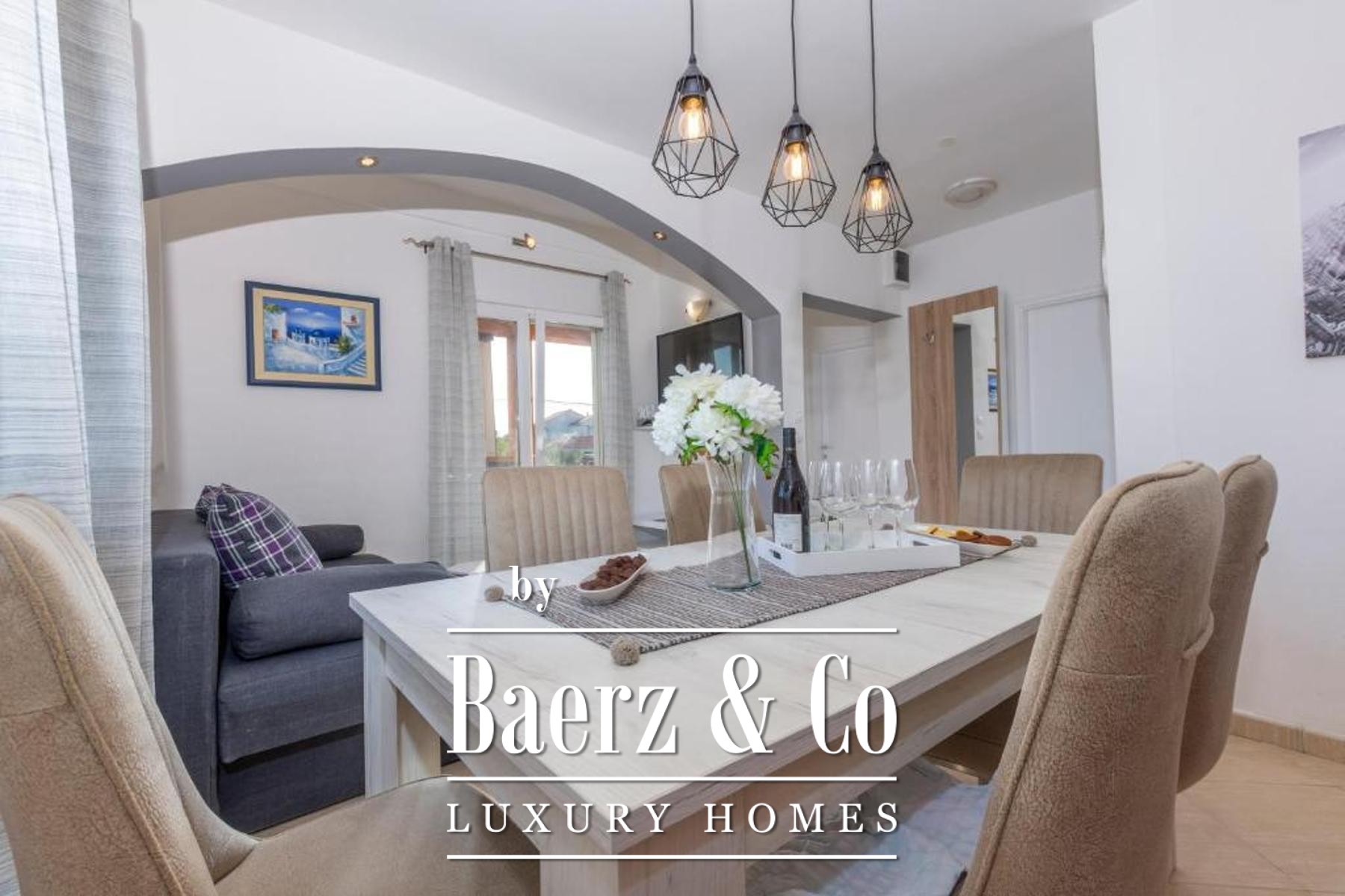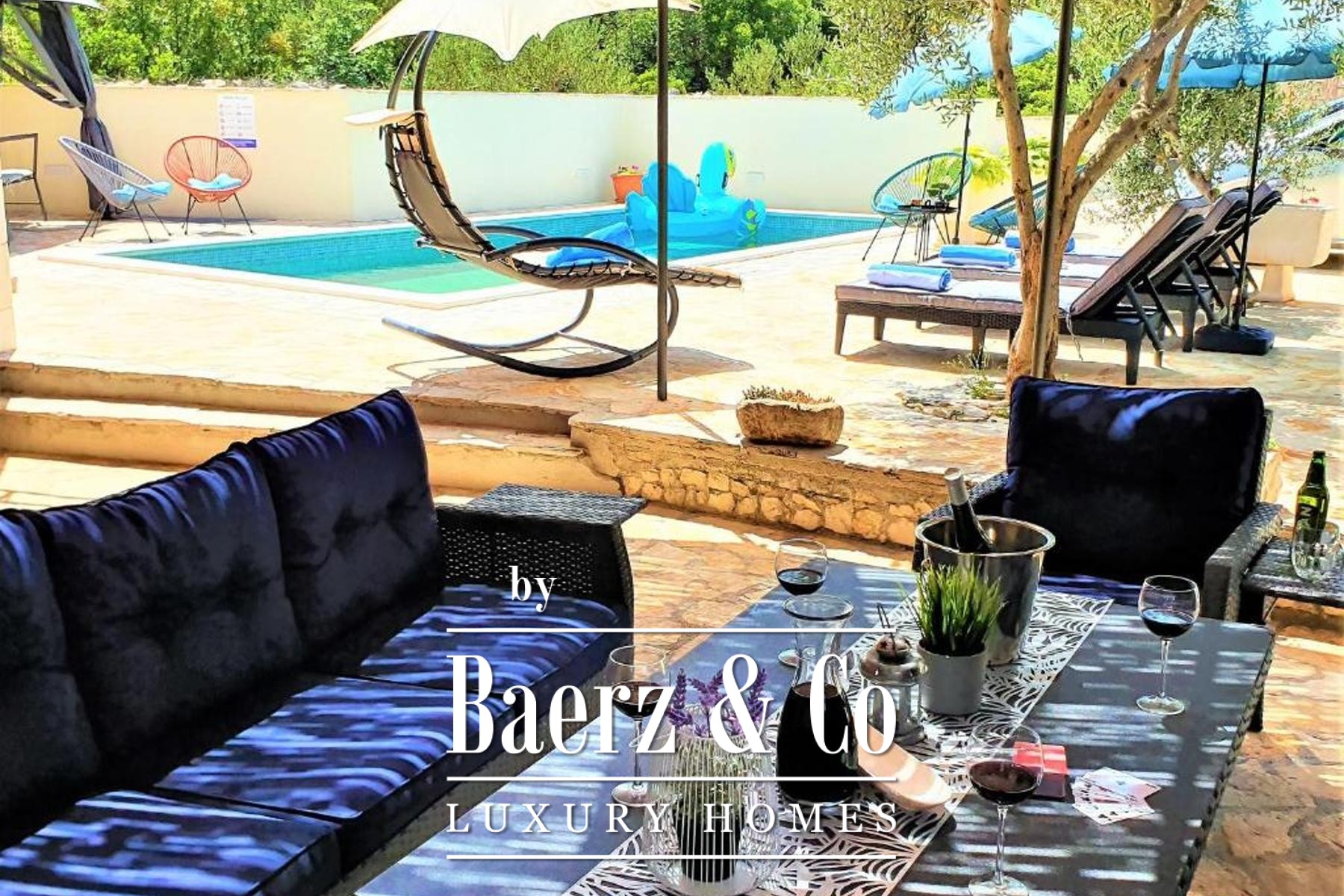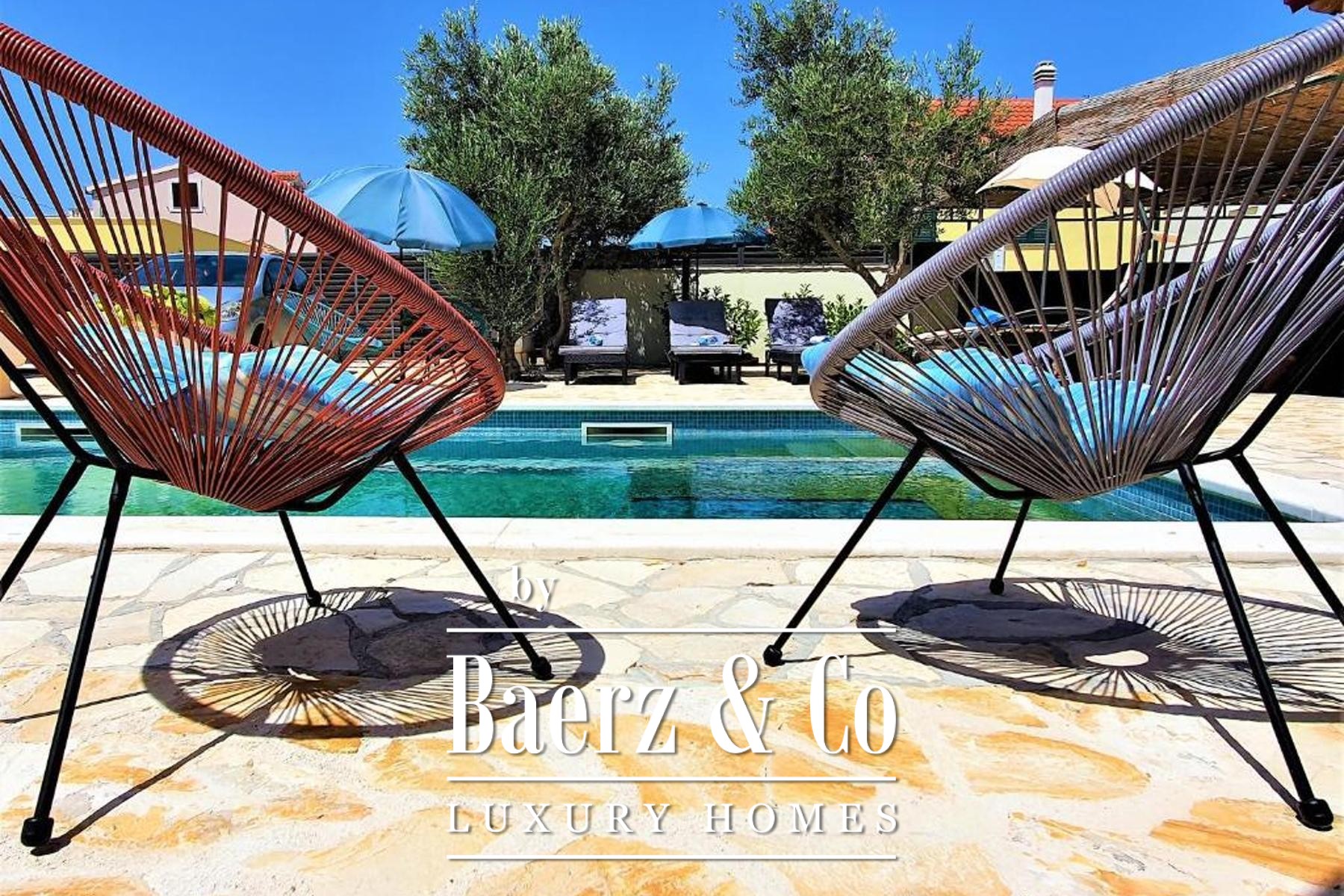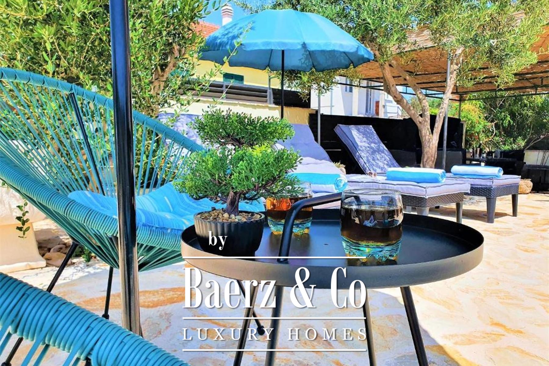 of which has a private bathroom, one separate bathroom, and a living room with kitchen and dining area. The living room opens onto a spacious covered terrace. On the second floor there are two more studio apartments, each of which consists of a living room with kitchen and dining area, a bathroom and a terrace with a sea view.Around the house there is a beautiful garden with a grill, a large swimming pool and a sunbathing area. The house has 6 parking spaces, two of which are covered. The microlocation of the house is excellent, in a very quiet place, yet only 500 meters from the sea.All other information on request.