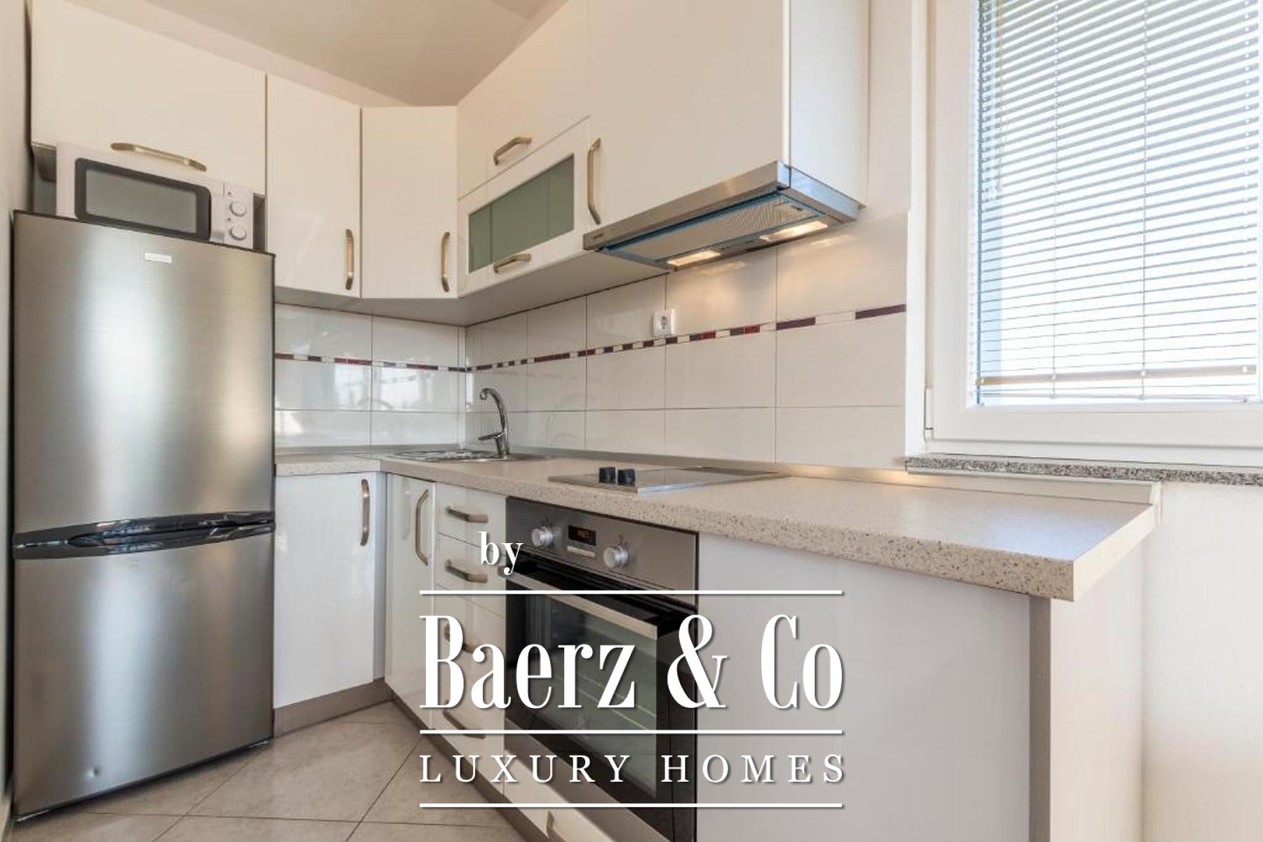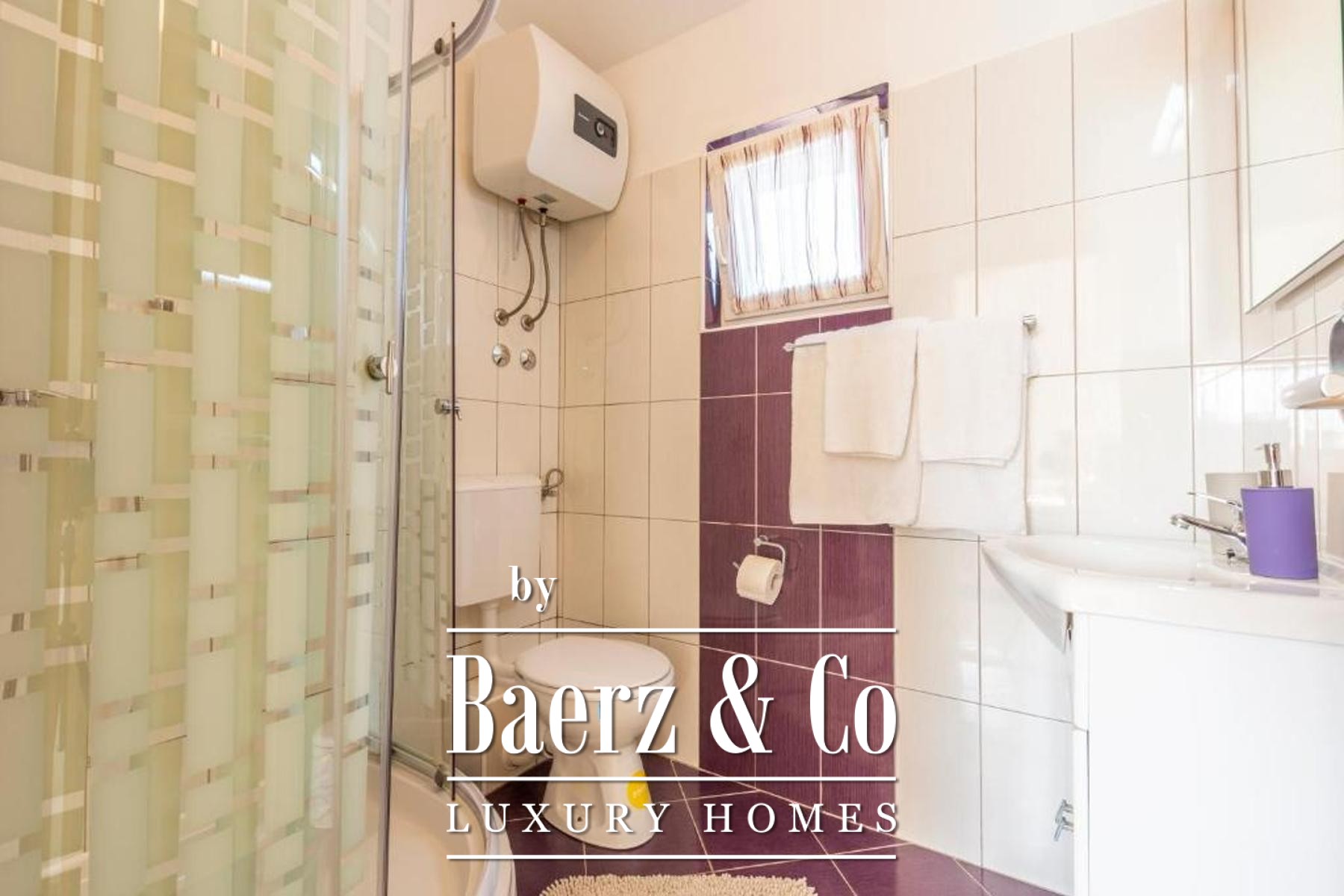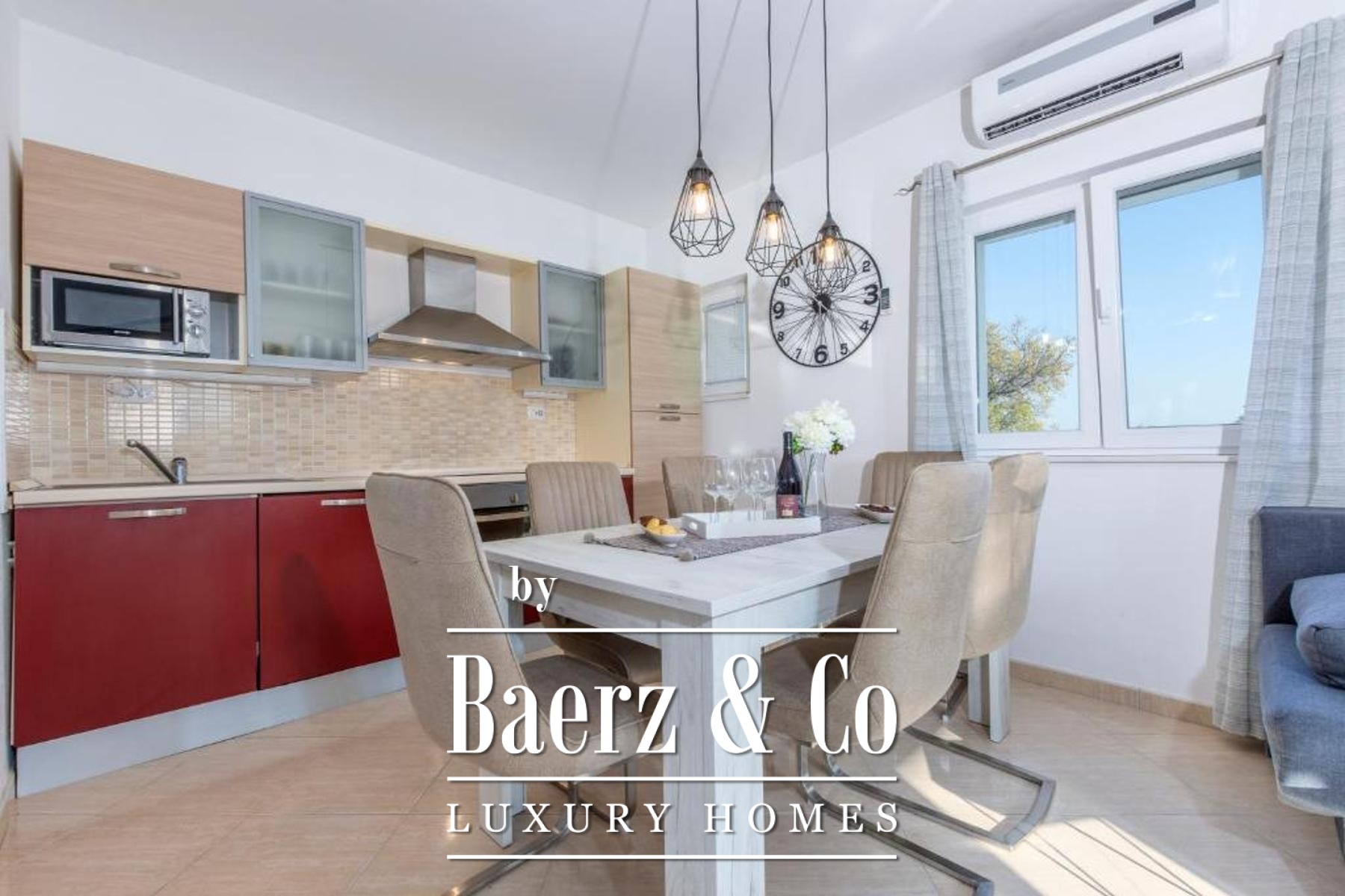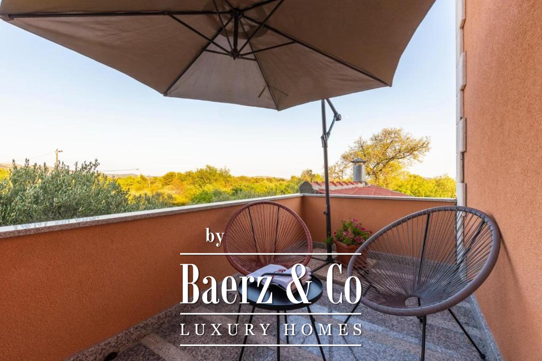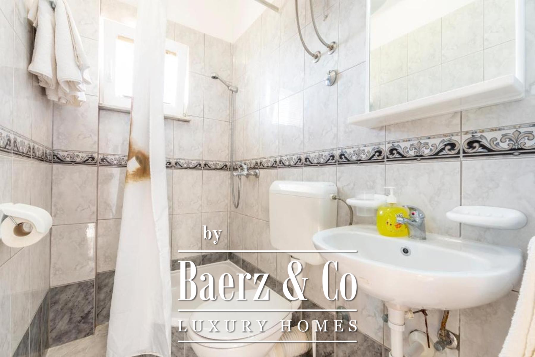 of which has a private bathroom, one separate bathroom, and a living room with kitchen and dining area. The living room opens onto a spacious covered terrace. On the second floor there are two more studio apartments, each of which consists of a living room with kitchen and dining area, a bathroom and a terrace with a sea view.Around the house there is a beautiful garden with a grill, a large swimming pool and a sunbathing area. The house has 6 parking spaces, two of which are covered. The microlocation of the house is excellent, in a very quiet place, yet only 500 meters from the sea.All other information on request.