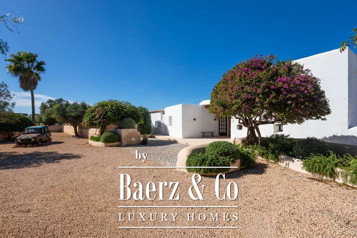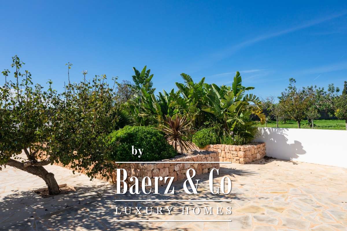 The casita is located about 50 meters in front of the main house, ensuring optimal privacy and providing an ideal space for renting out or hosting guests. Both the main house and the casita feature underfloor heating as well as air conditioning systems in each room, ensuring a pleasant temperature all year round. Both residences offer fiber optic high-speed internet and are equipped with modern alarm systems, guaranteeing a perfect connection and optimal security. On top of that, all inventory is included with this magnificent finca, making it a turnkey retreat, ready for you to move into.The outdoor spacesStepping into the garden, you will find several spacious terraces, a wonderful shaded al fresco dining area, and a sun-drenched swimming pool of over 90m², accompanied by comfortable loungers. The modern fence provides the privacy you desire, while the luxurious Ibicenco atmosphere is accentuated by the white-painted property and wooden garden furniture and decorations. The spacious land extending between the main house and the guest house is ideal for landscaping and surrounds both houses. In the garden of the main residence is an original monumental Ibicencan tower, which adds a historical touch to this beautiful property. Another special detail is the lighting design of the gardens. The path to the casita, for example, has discreet spotlights on the ground, showing you the way to this separate residence. This property offers traditional Ibiza allure combined with a modern luxury lifestyle.