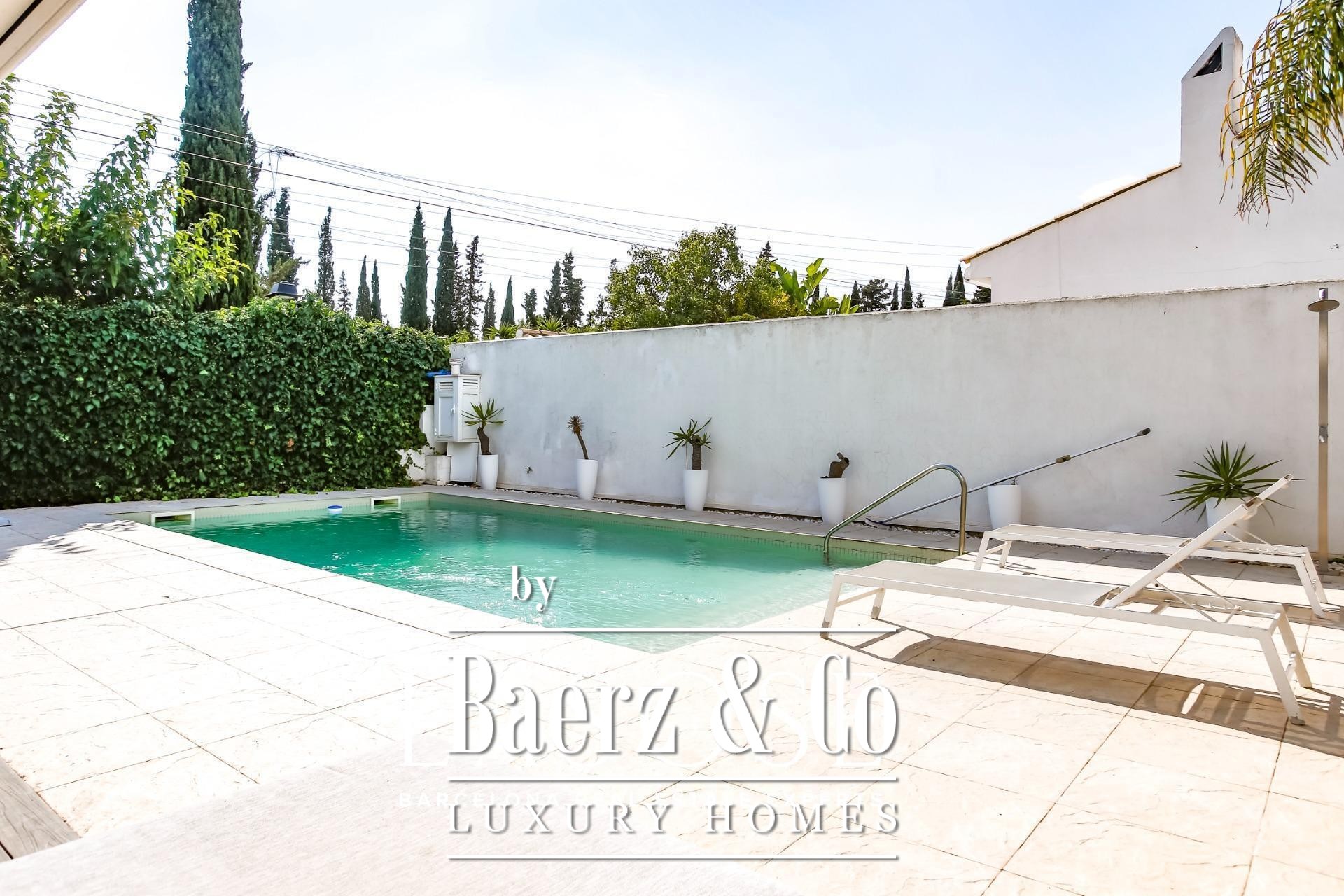 Beyond the landscape, interiors unfold in a harmonious rhythm. An elegant living area with fireplace opens to the garden, while a fully equipped kitchen with central workspace adjoins a private patio and parking. On the ground floor, a guest suite or study complements flexible living, while the upper level features three bright double bedrooms, each with garden views, enhanced by double-height ceilings. Throughout, refined finishes and neutral tones accentuate the architecture’s natural elegance.