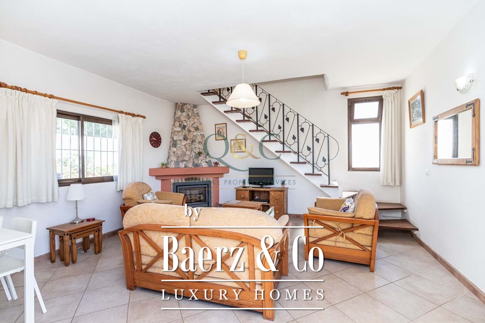 The main house offers two generous suites, a comfortable third bedroom, and an additional guest bathroom. A large rooftop terrace provides panoramic views of the countryside and the sea.