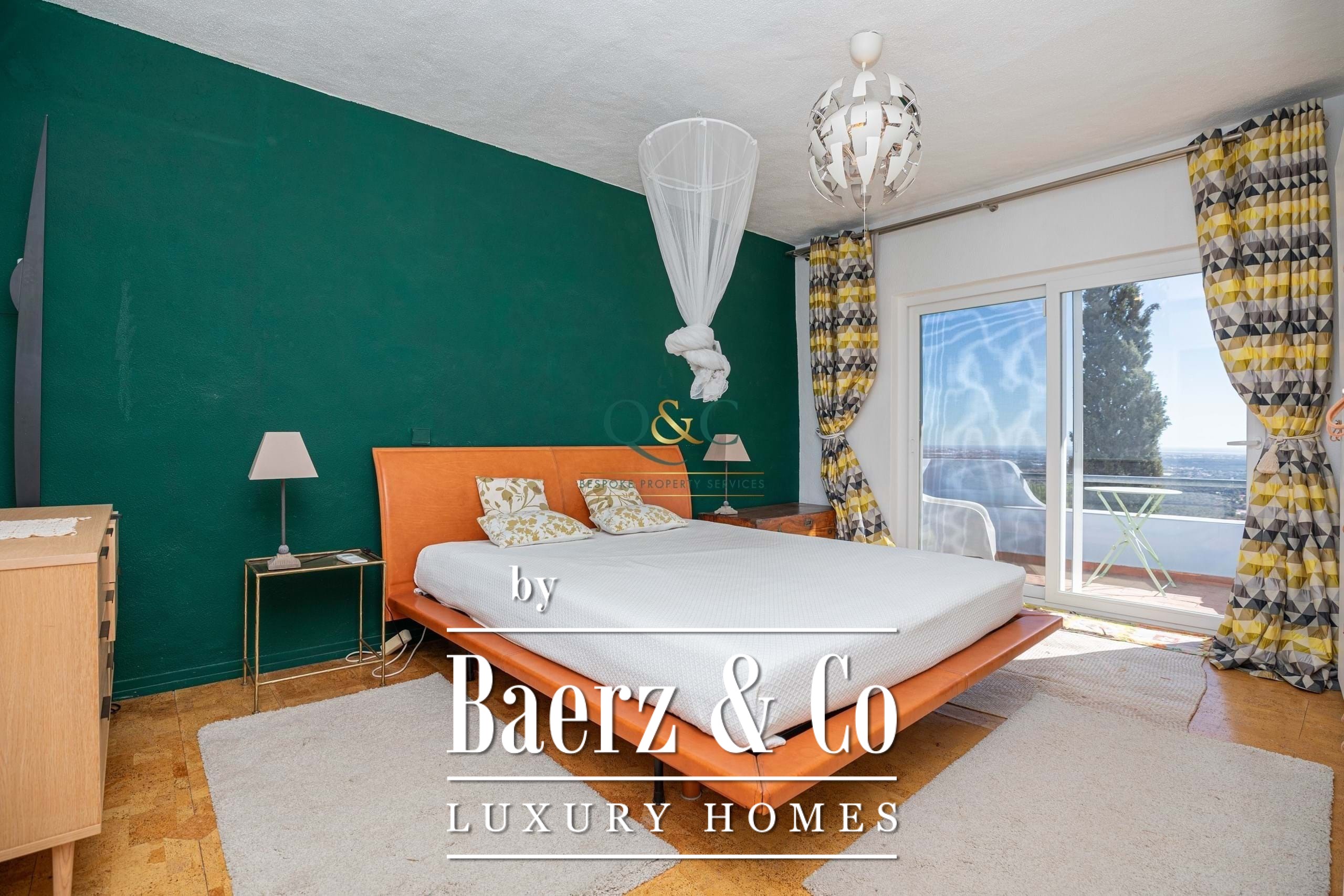 On the main level, the master suite is exceptionally spacious, featuring a newly refurbished bathroom and sliding doors opening directly onto the terrace. A sweeping staircase rises to the second double bedroom, also with a refurbished bathroom and private balcony, both enjoying the spectacular views.