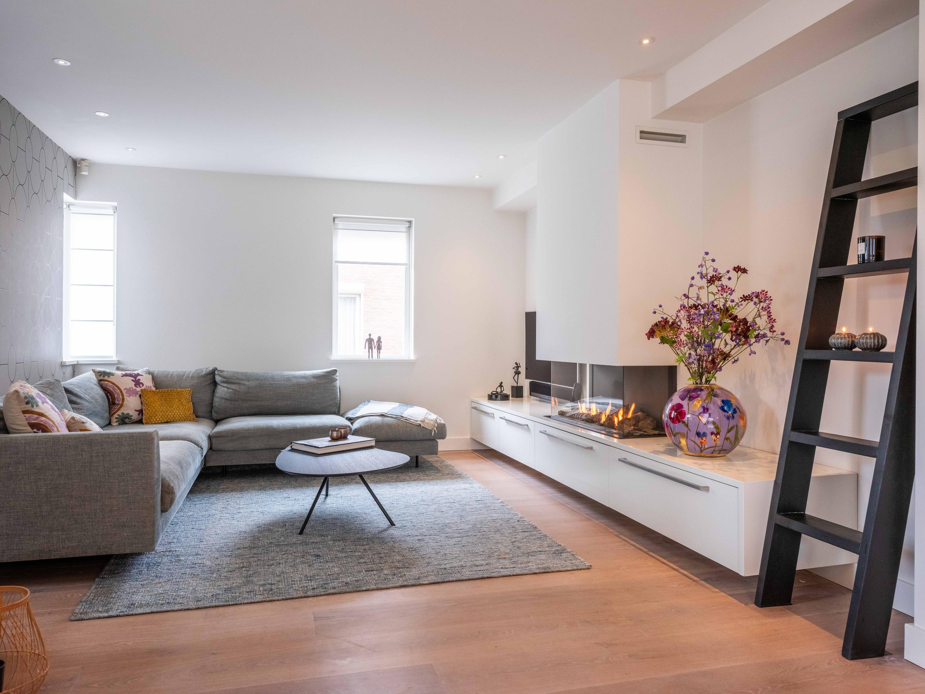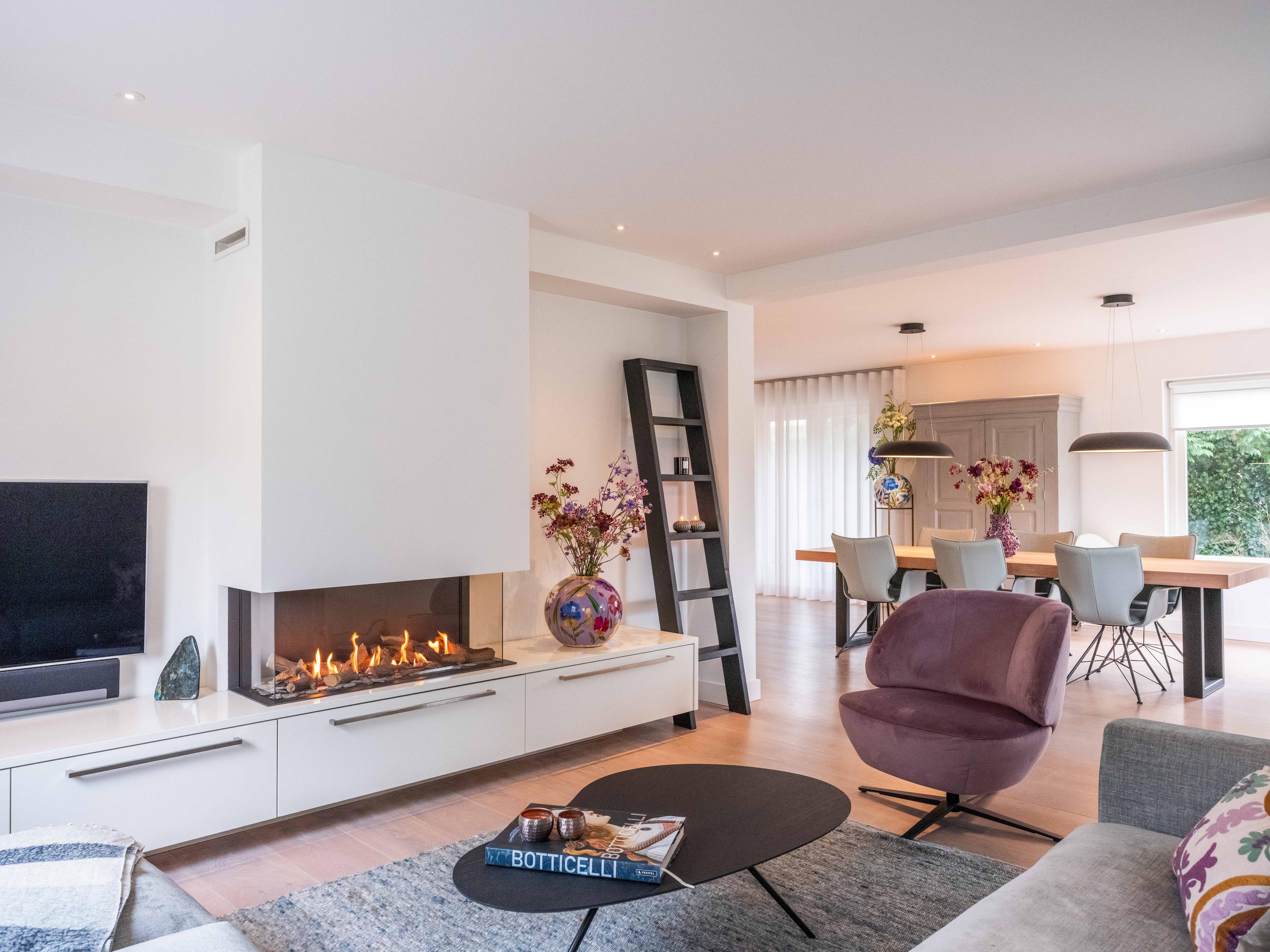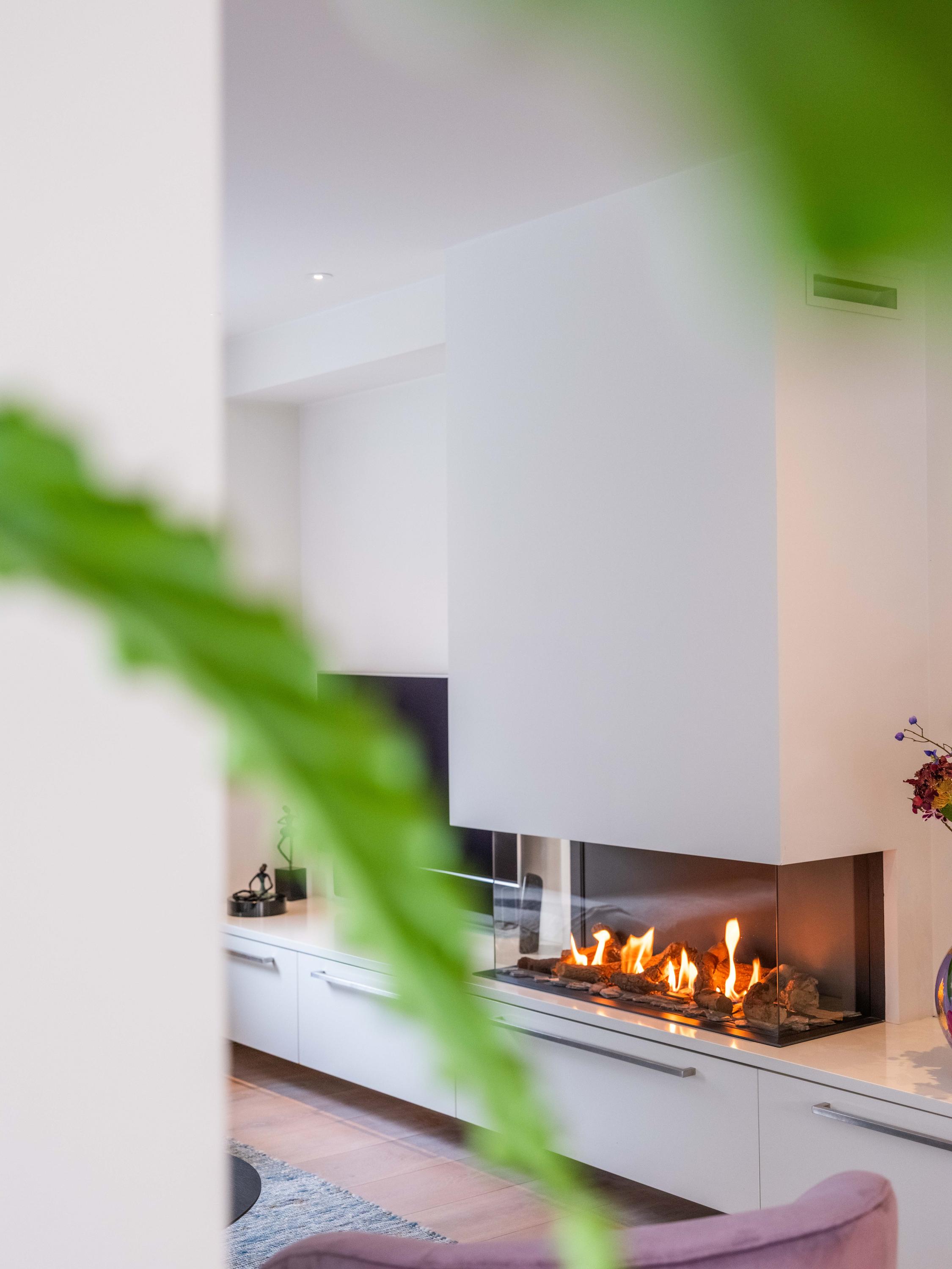 Double doors give access to the spacious L-shaped living room, where you are immediately welcomed by lots of light thanks to the large windows. In the corner is a cosy sitting area with an attractive gas fireplace. The oak laminate flooring in combination with underfloor heating throughout the ground floor creates a warm and comfortable atmosphere.