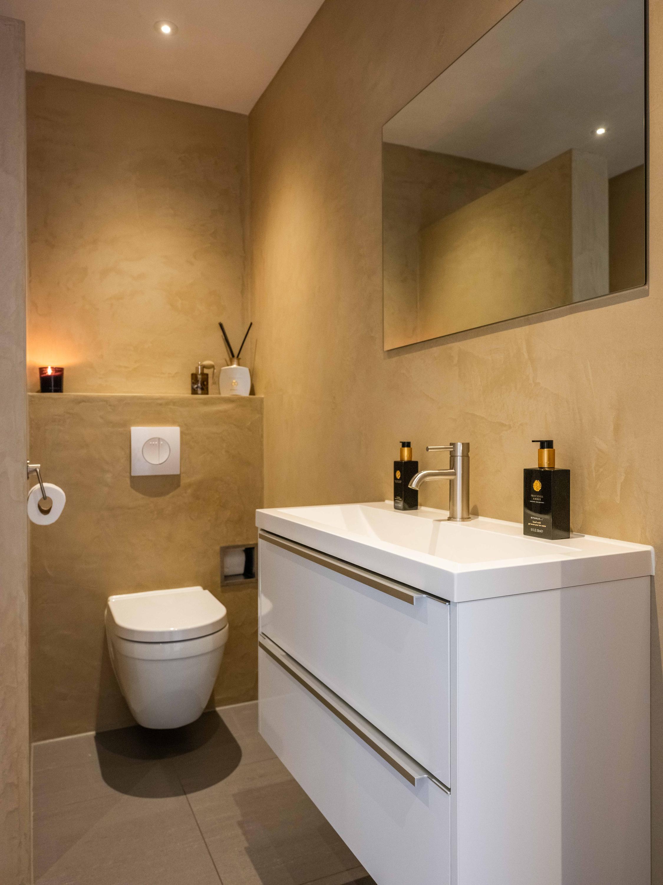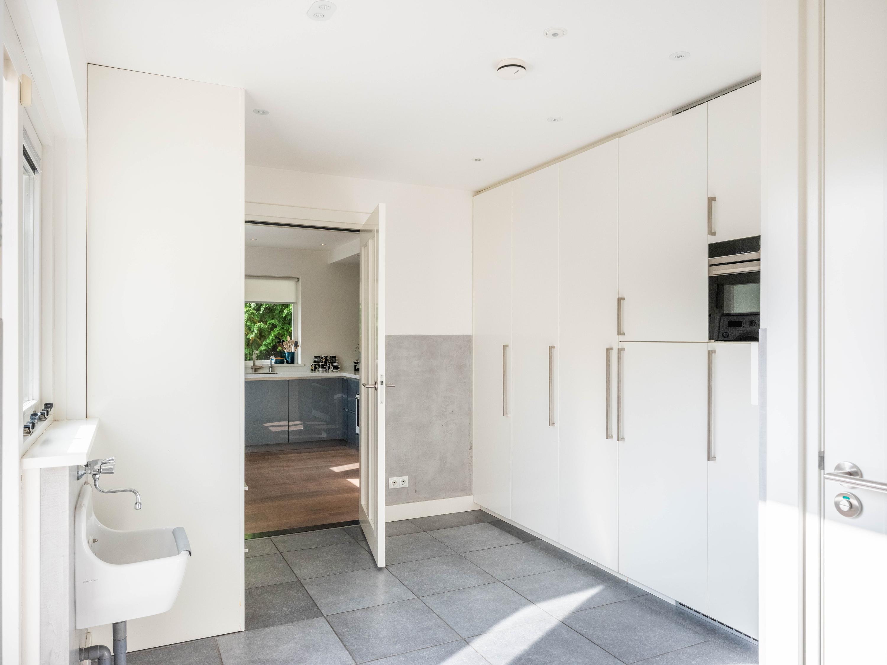 Adjacent to the kitchen is the spacious utility room with built-in cupboards and connections for a washing machine and dryer. The utility room also has an additional toilet and a door to the garden and terrace.