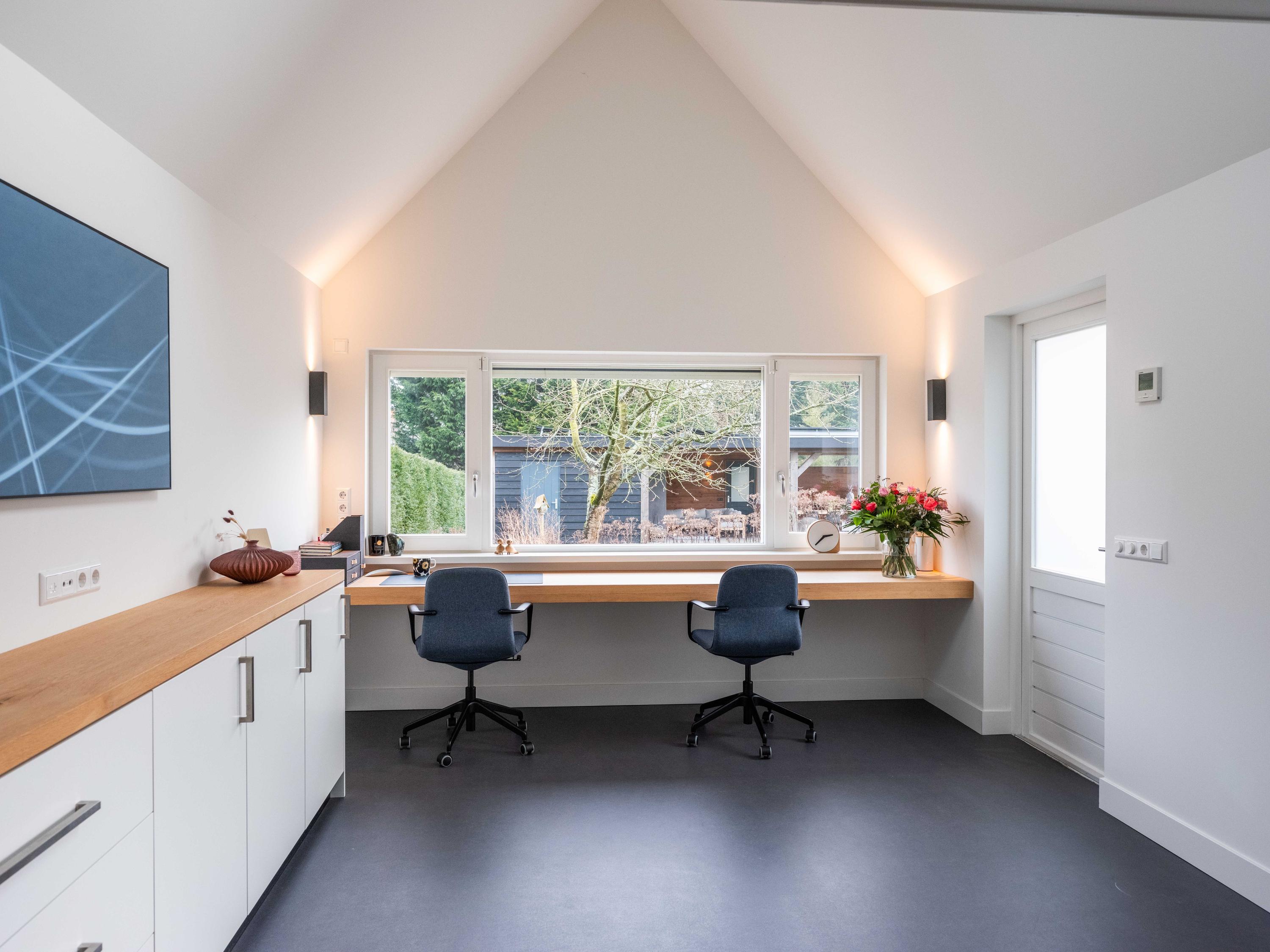 The open kitchen is attractively decorated and equipped with a cosy bar with seating. From the kitchen, you can enjoy a beautiful view of the garden and there is a direct connection to the living room. Thanks to the open layout and abundant light, everything feels spacious, fresh and inviting.