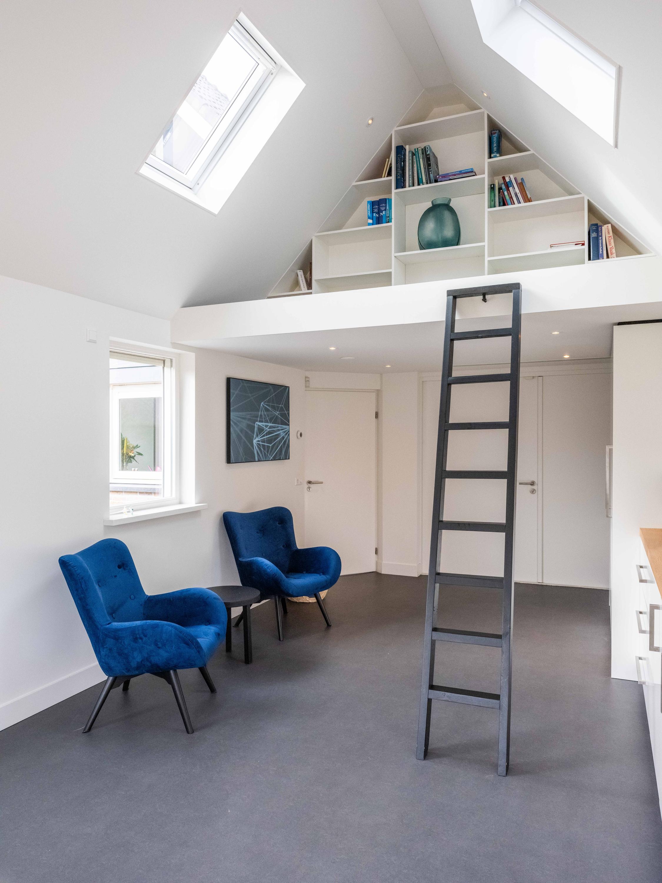 From the utility room, there is access to an additional room with air conditioning, built-in cupboards and a loft. This room is currently used as an office but could also serve as a bedroom or hobby room. The loft offers additional storage space.
