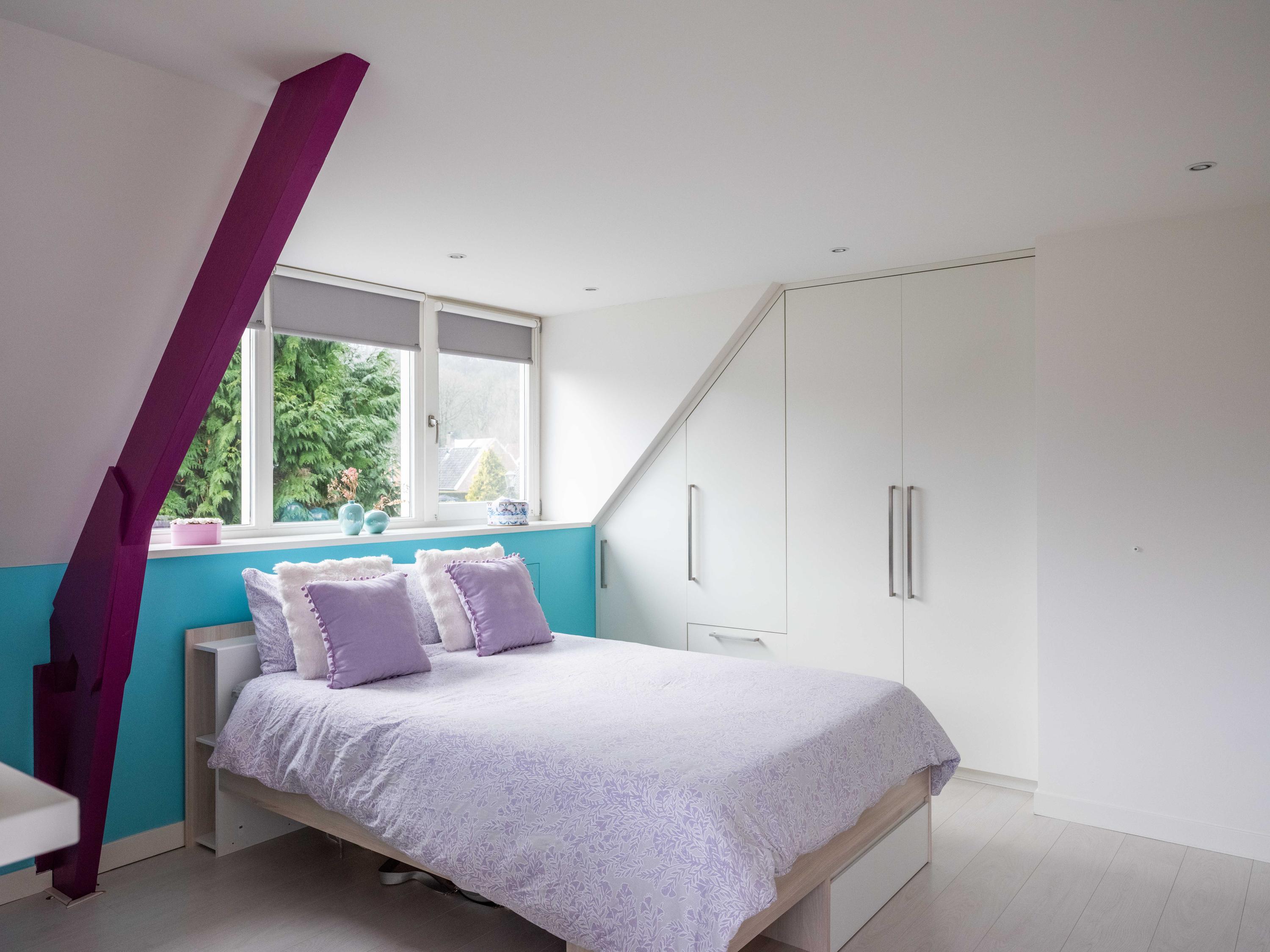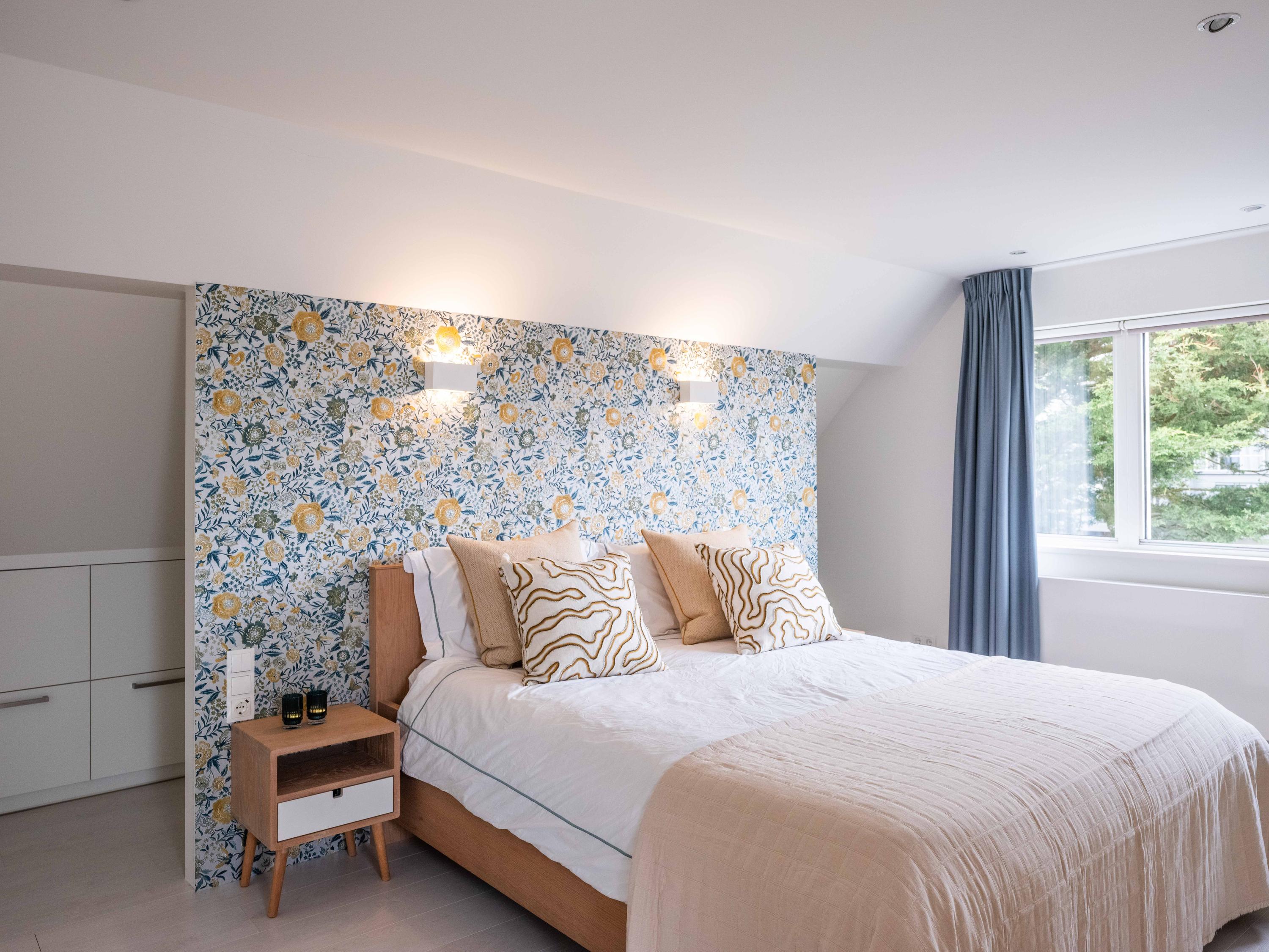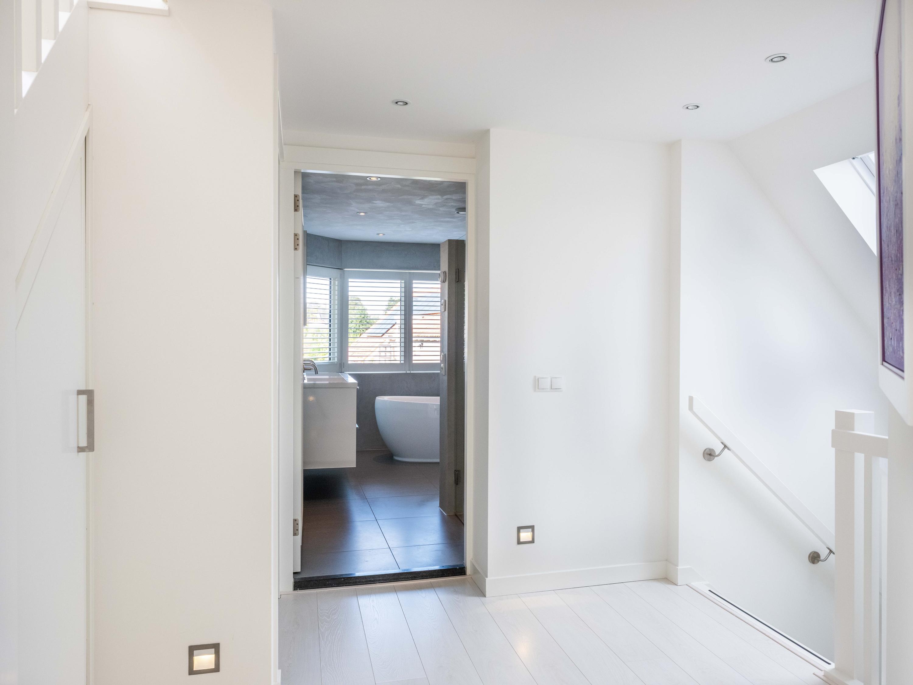 On the first floor, there are three bedrooms and a spacious bathroom with double sink, toilet, bathtub and a generous double walk-in shower. Underfloor heating is also present here, as well as a radiator. The master bedroom is spacious and has plenty of built-in cupboard space. There are two additional bright bedrooms, both with built-in cupboards and access to a private balcony. There is a handy storage cupboard under the stairs to the attic.