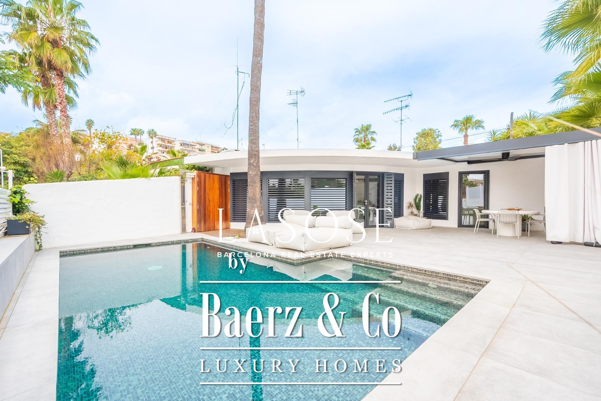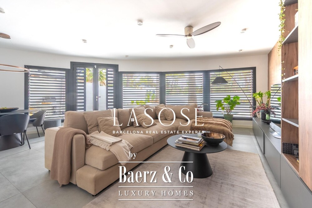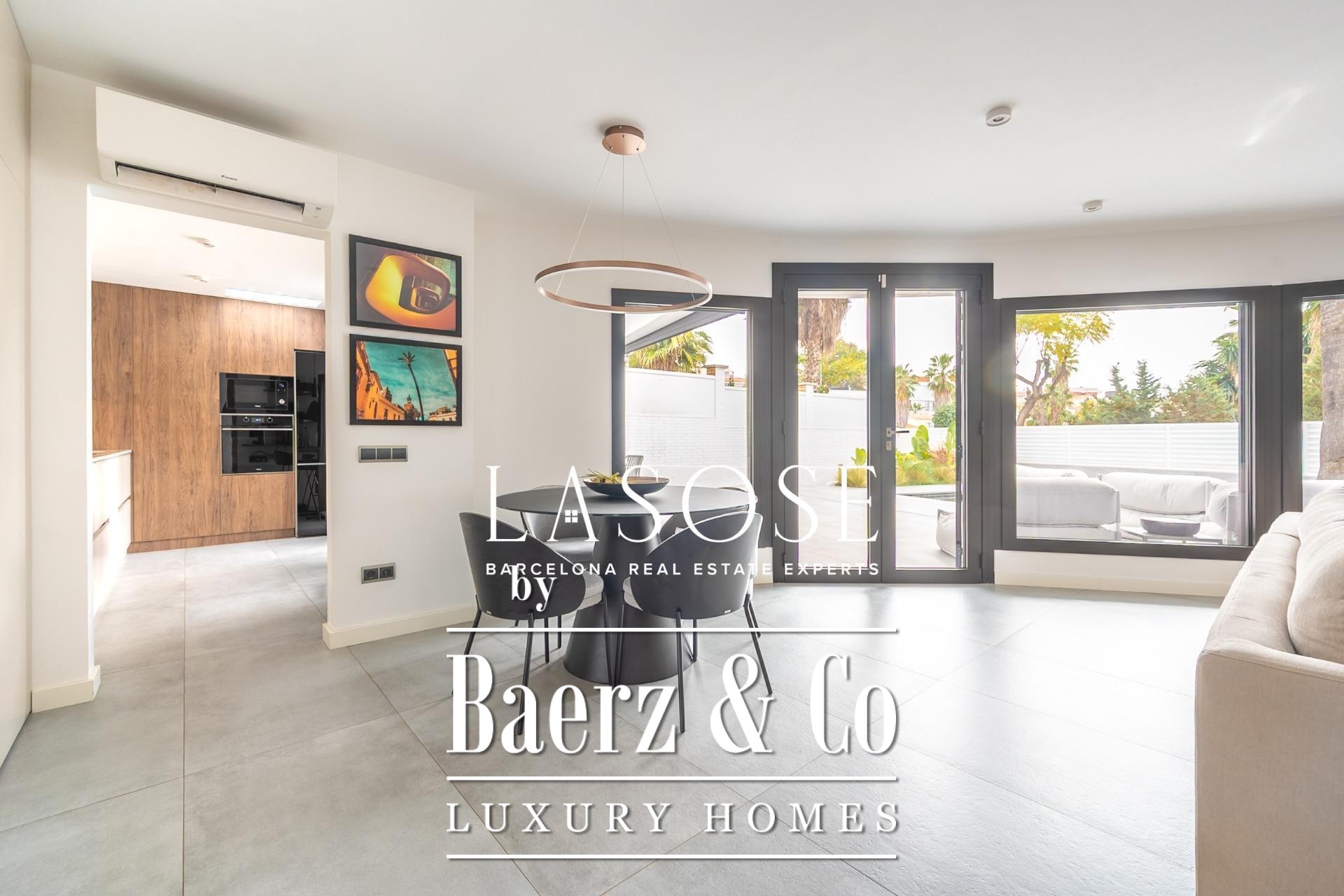Villa Sitges Vallpineda introduces elevated Mediterranean living in a discreet residential setting. This 100 m² single-storey villa has been fully renovated to precise contemporary standards, offering two bedrooms and two bathrooms that flow seamlessly into generous living spaces. The property stands on a 278 m² plot, framed by stately palm trees and enhanced by open views, where tranquil indoor and outdoor environments merge. Floor-to-ceiling windows illuminate the main living and dining area, integrating naturally with the terrace and private pool—ideal for family gatherings or quiet reflection.