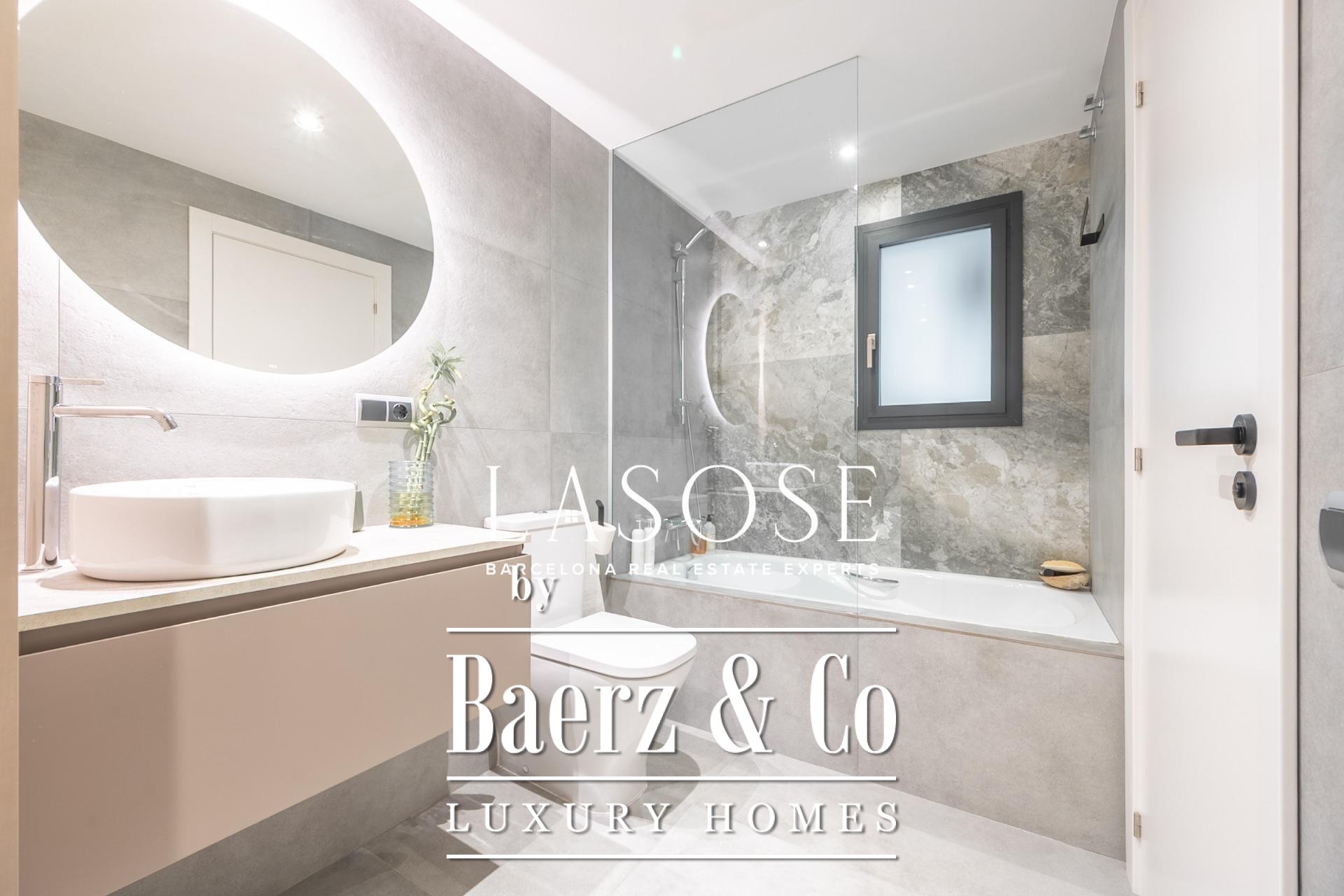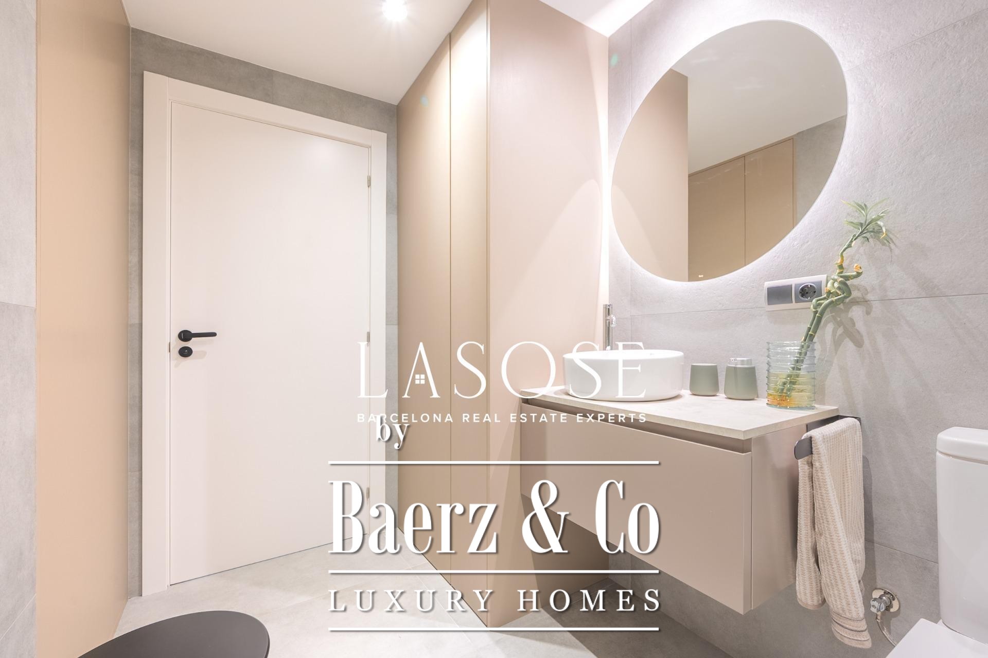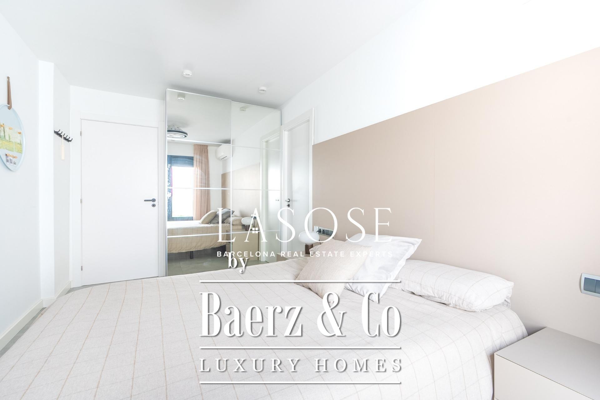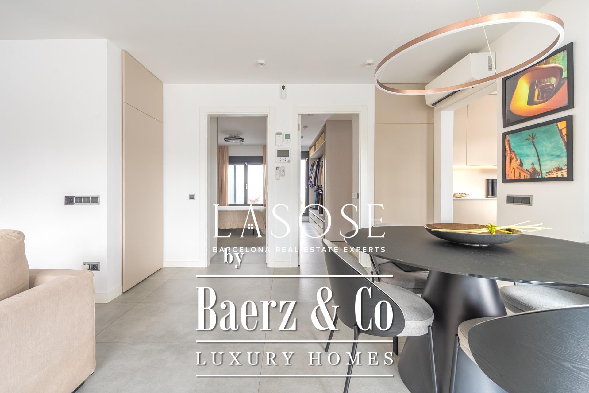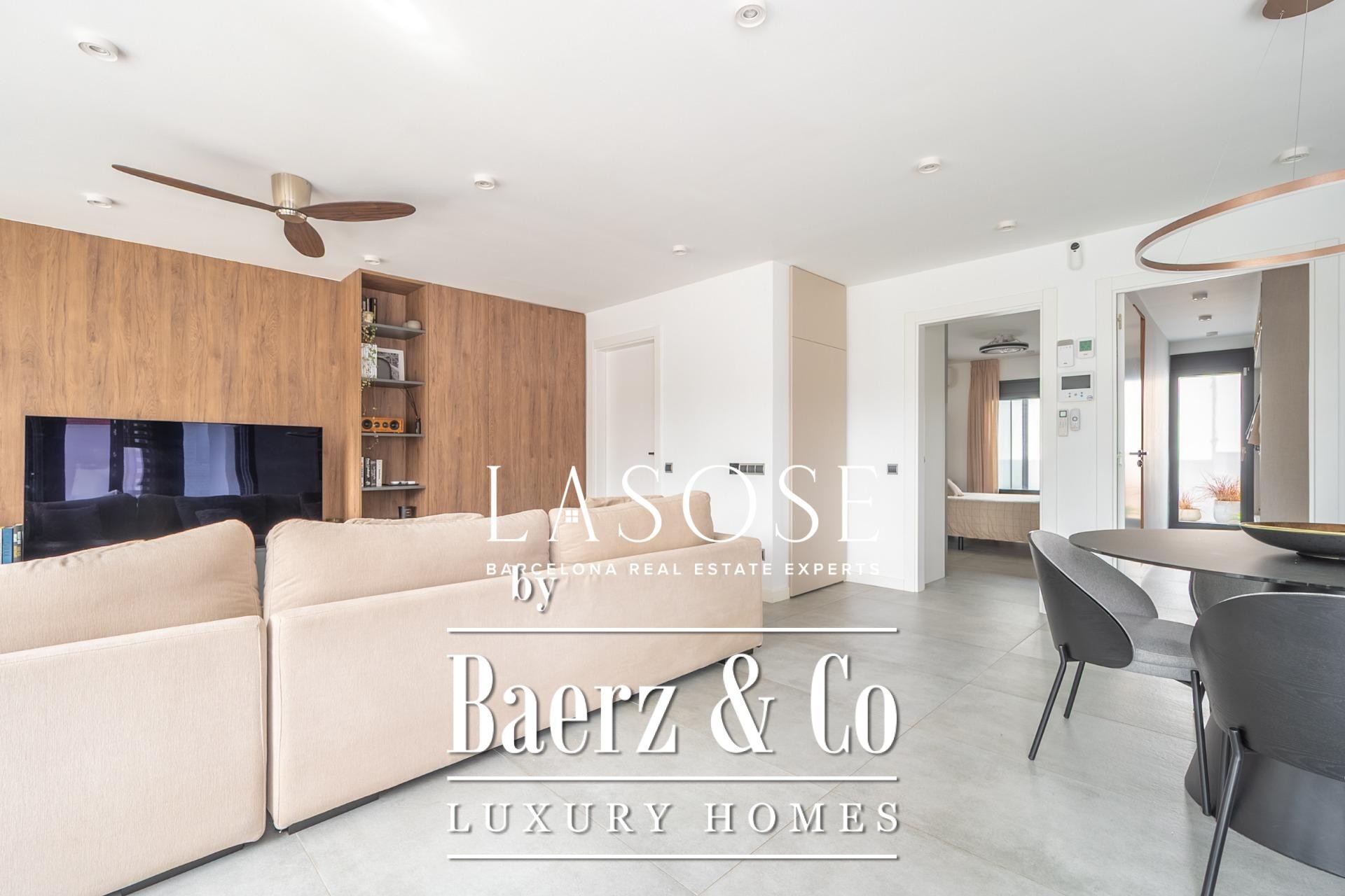 A modern kitchen, finished with premium materials and appliances, connects both to the heart of the home and to an inviting covered dining terrace for effortless alfresco entertaining. The primary suite features a designer bathroom and a spacious dressing area, while the second bedroom offers direct access to a full bath—balancing comfort with elegant privacy. Year-round climate control is ensured by hot and cold air pumps in every room; double-glazed windows and adjustable blinds reinforce thermal and acoustic insulation. Details from lighting to finishes embody timeless restraint.