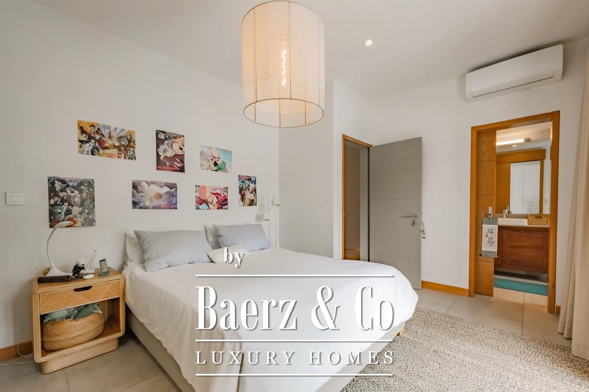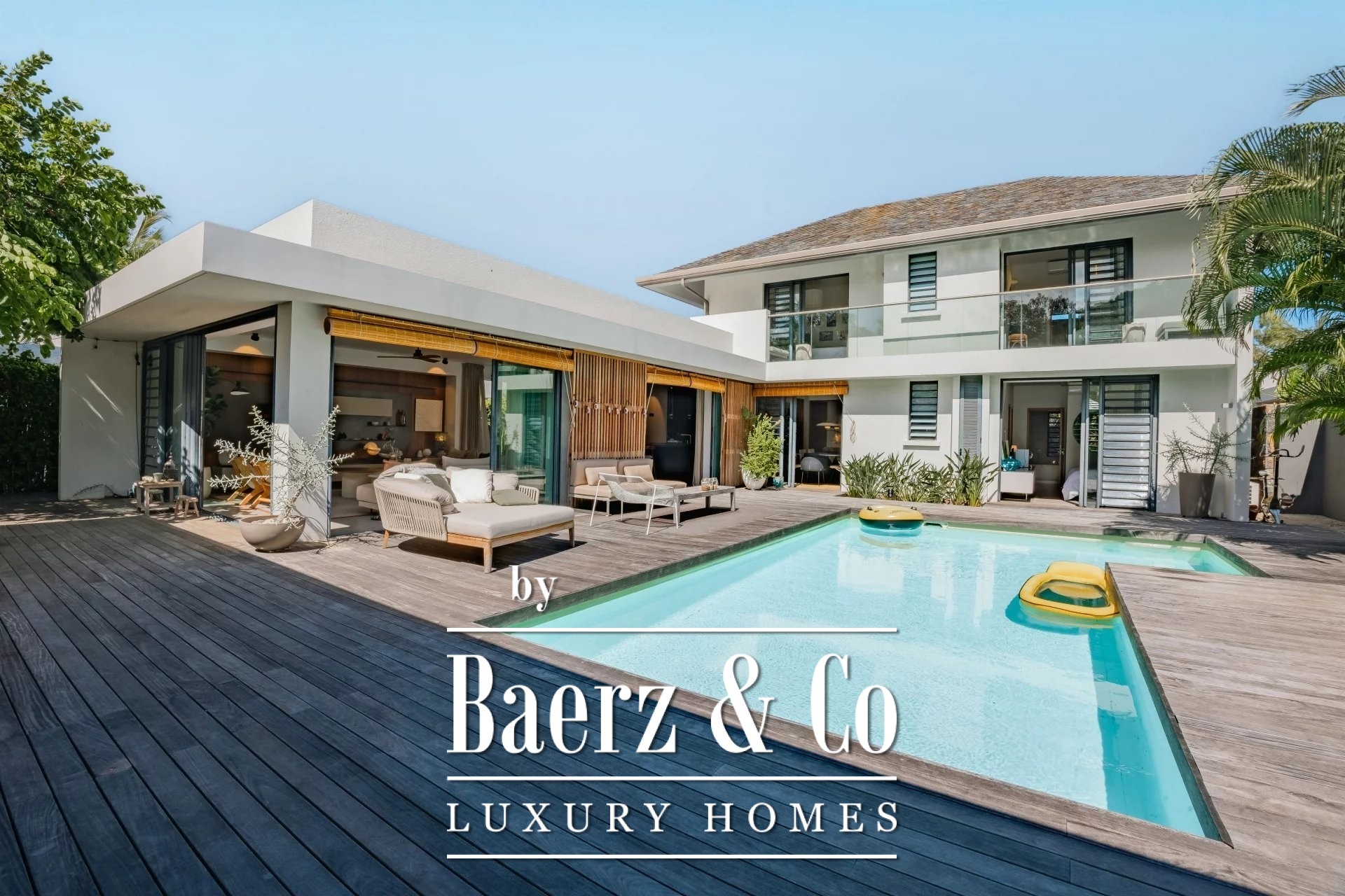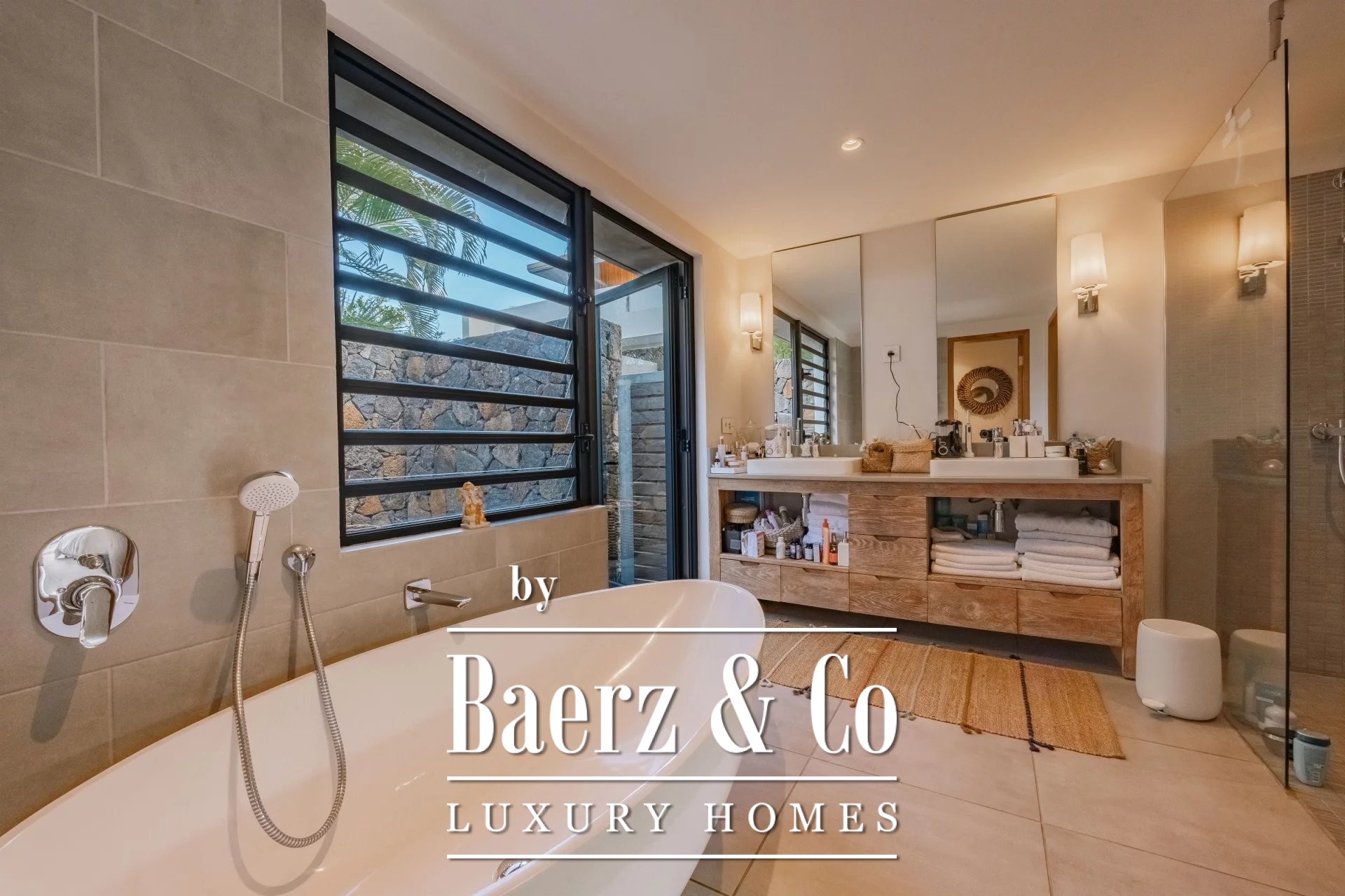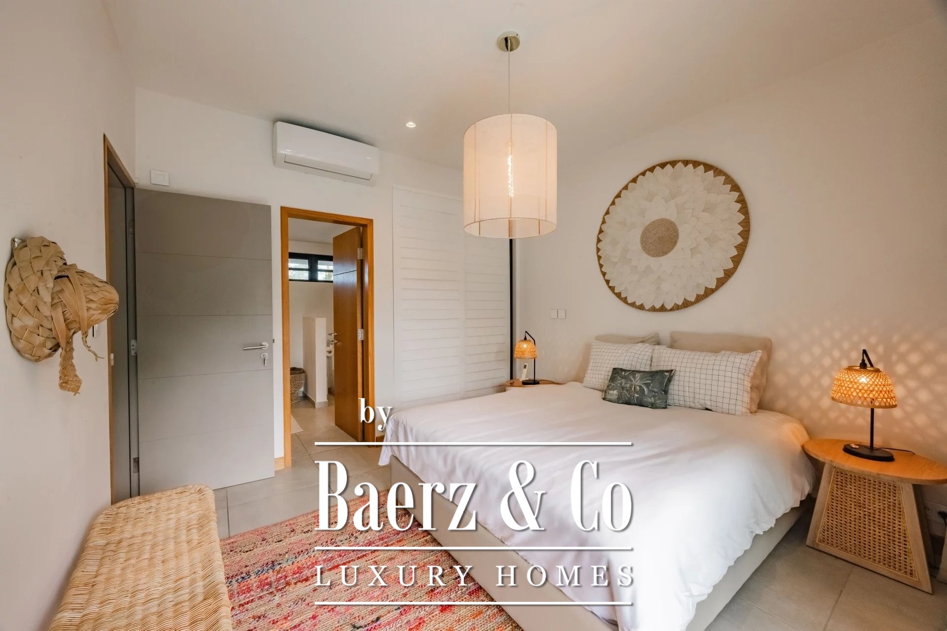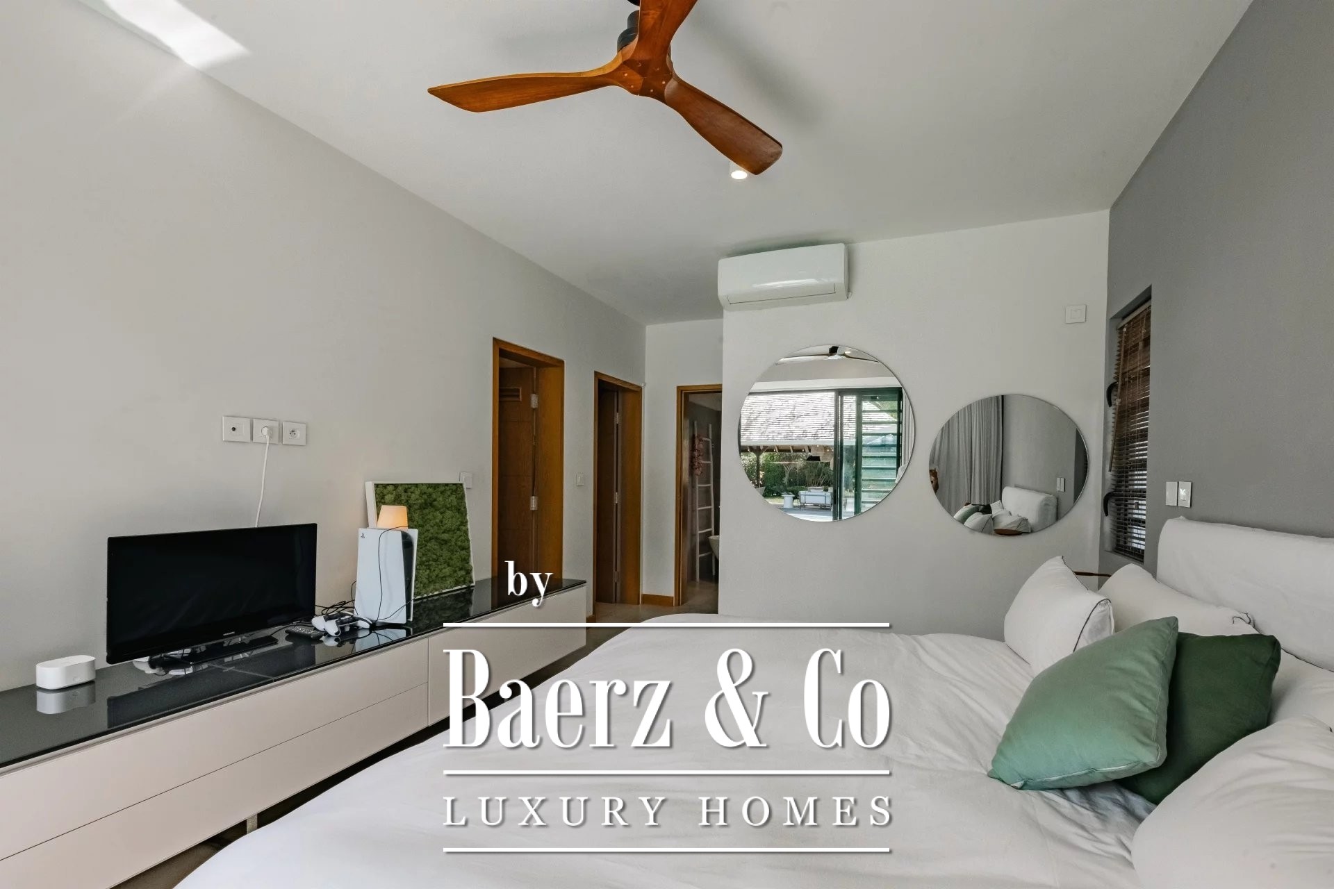 Within the secure residence, amenities include a fully equipped gym, communal swimming pool, on-site restaurant, 24/7 security, and a kids club. Immediate access to beaches and local shops underscores convenience without compromise. This luxury villa for sale in Tamarin offers a sophisticated setting where every detail speaks to comfort, privacy, and design.