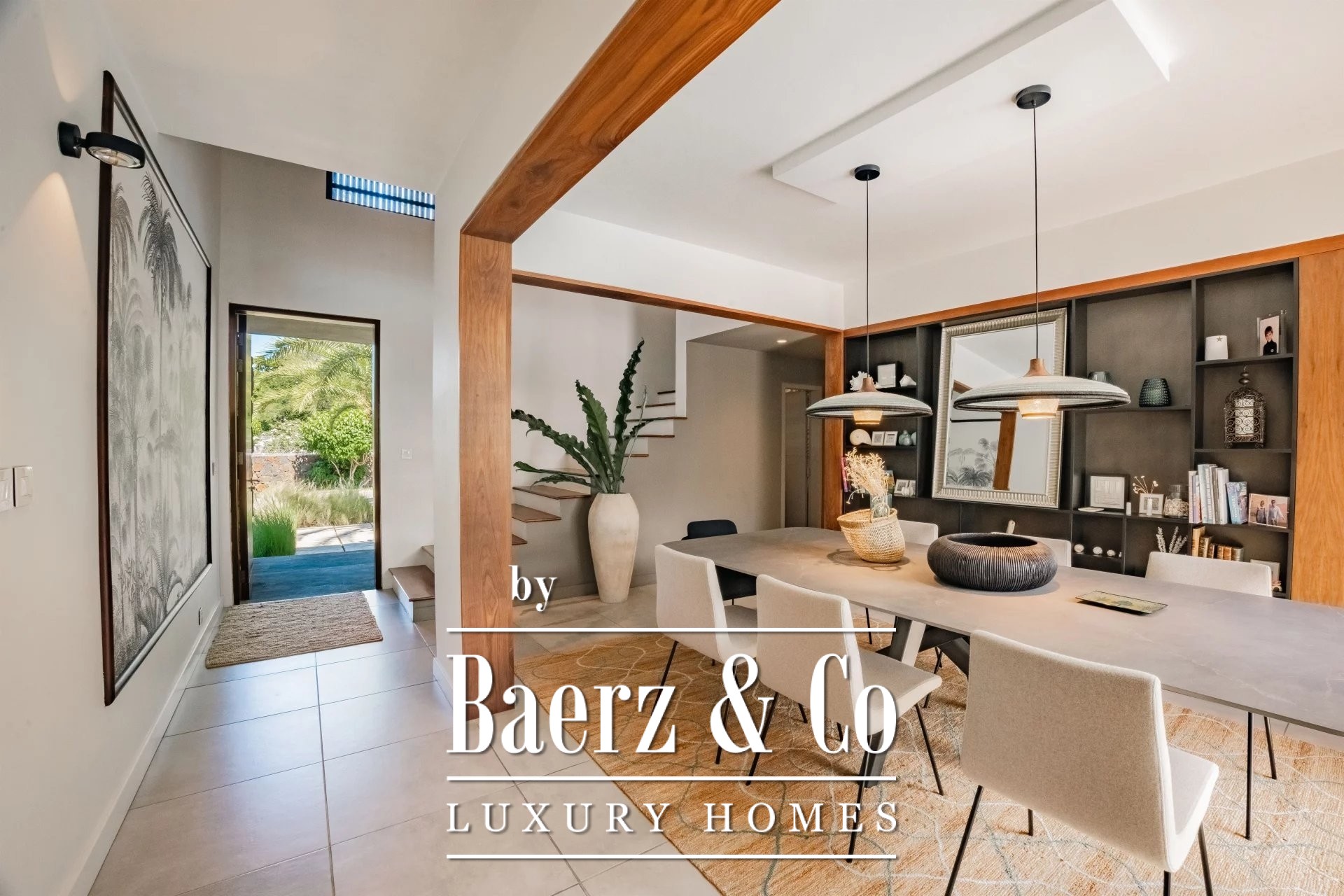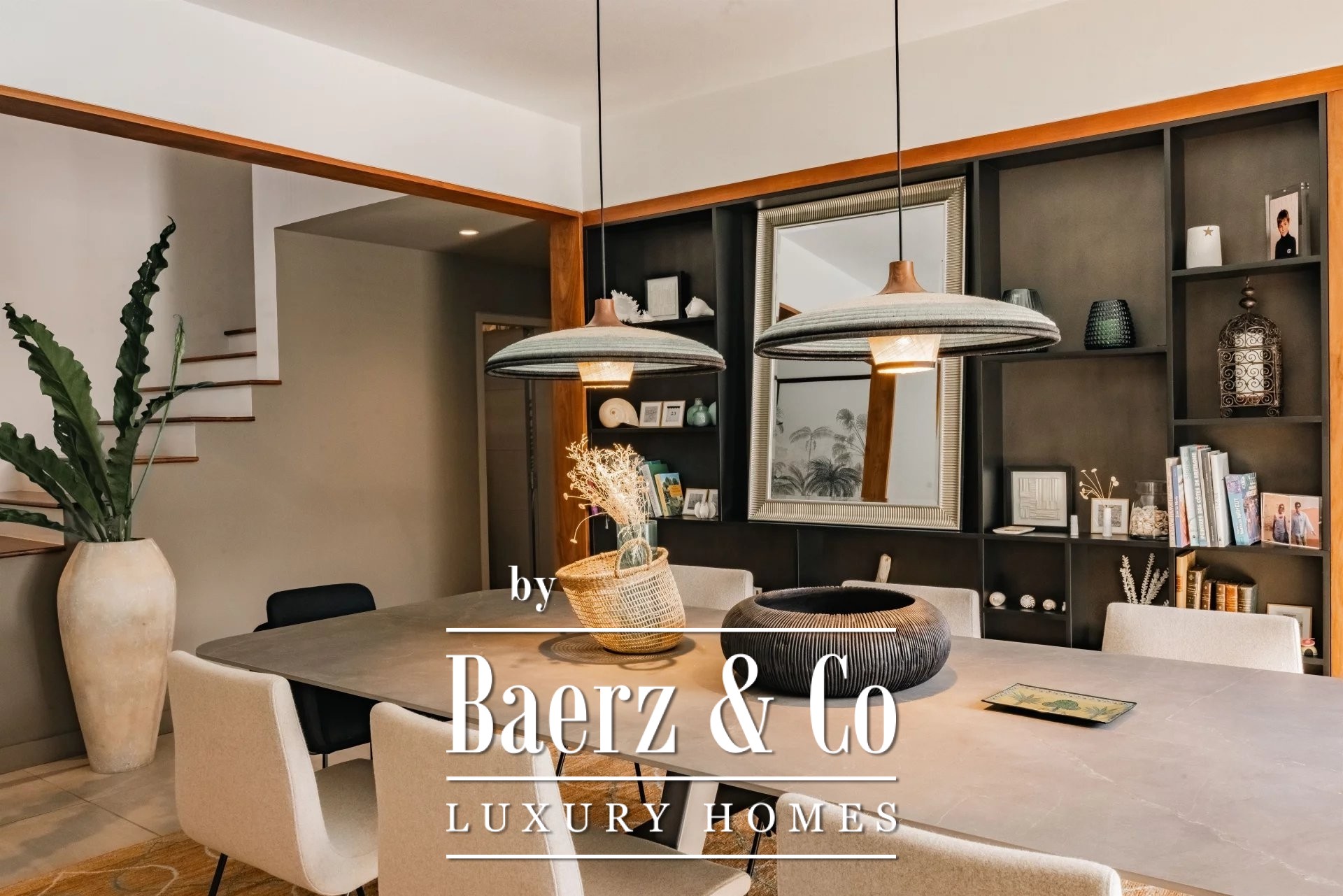 The open-plan living area is anchored by natural light and smart lighting automation, enhancing both volume and serenity. An advanced home automation system manages multimedia and ambiance, supported by an automatic generator and a solar water heater for energy efficiency. A private heated swimming pool forms an intimate retreat, heightened by a soft pavilion for all-day relaxation. Dining, lounging, and entertaining flow easily between spaces, matched by 2 private parking spots and 3 for visitors.