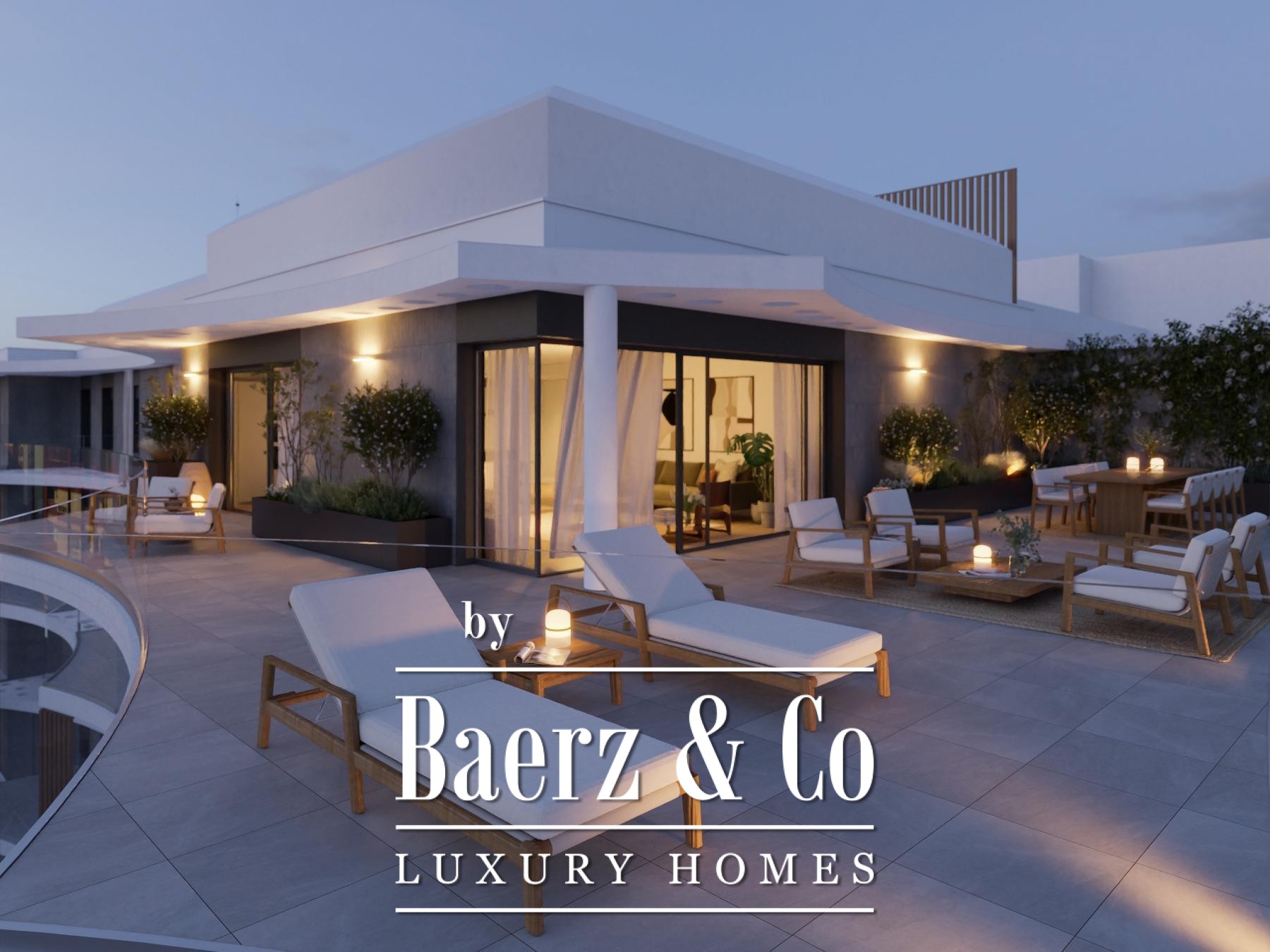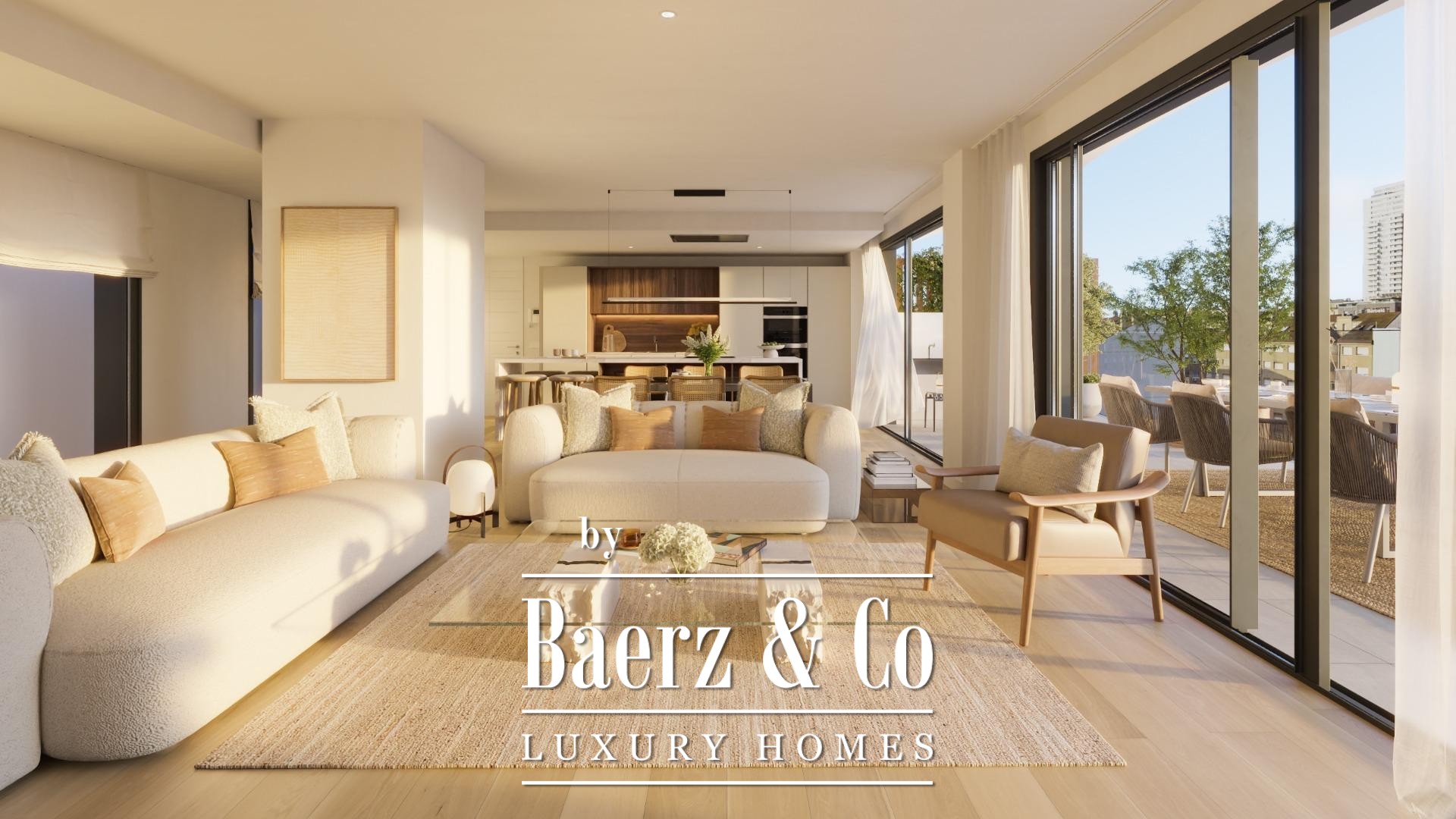 The penthouse layout presents three serene bedrooms, each with built-in wardrobes, with the master suite featuring an en-suite bathroom. The fluid living and dining area is designed as an open plan, integrating a modern kitchen that invites natural light and seamless access to the terrace. From here, panoramic views frame every gathering and quiet moment, and a dedicated laundry area supports effortless daily living.