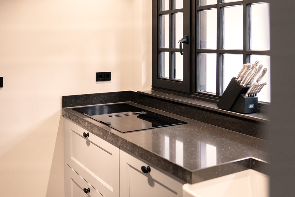 The villa comprises four bedrooms and one bathroom, balancing historical details with modernised elements like air conditioning in the main bedroom and recent updates including a renewed kitchen and updated façade paintwork. Each space is finished to a high standard with considered materials, including new tiling, double glazing, and a harmonious blend of wood and steel accents in the windows.