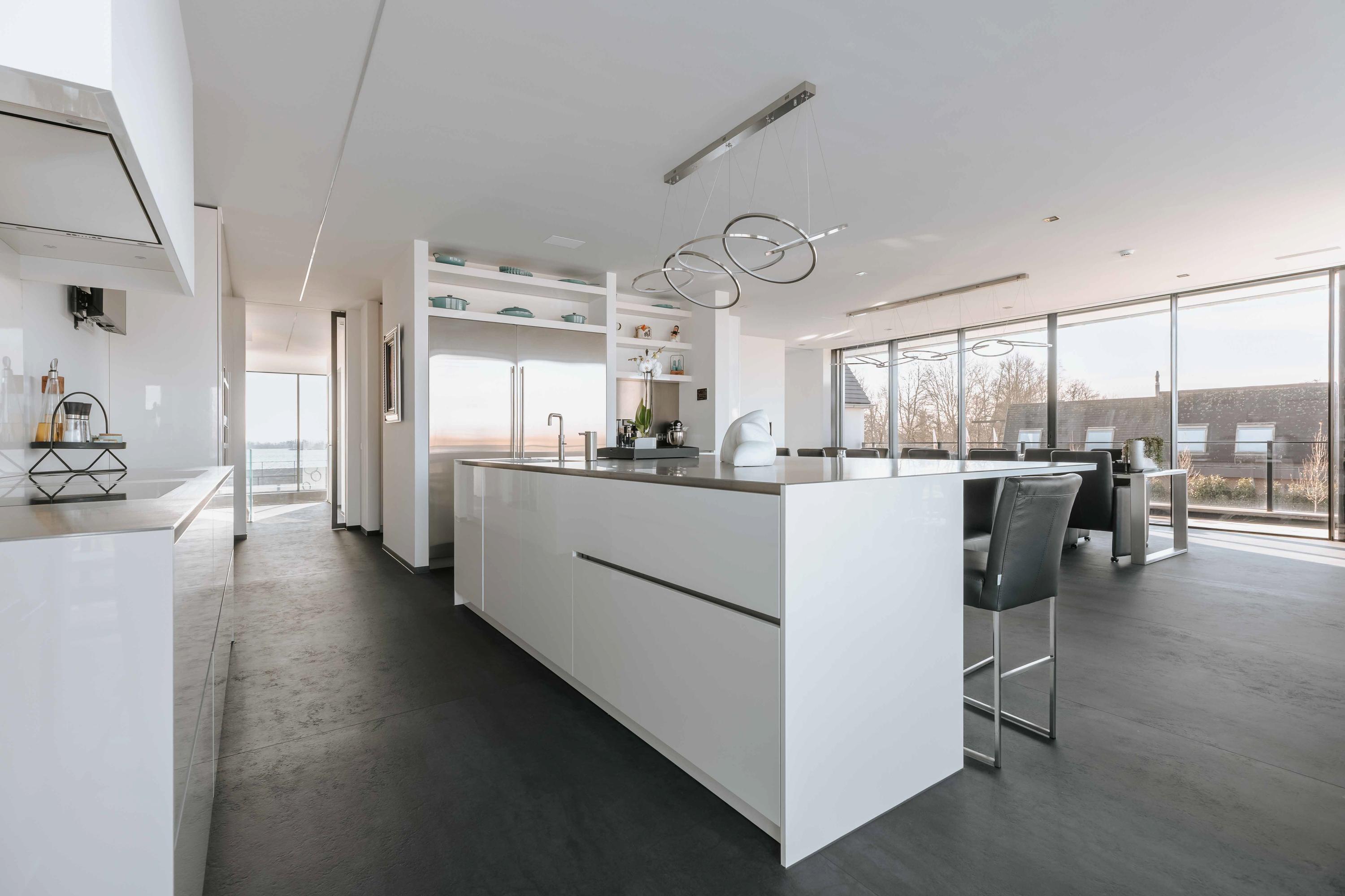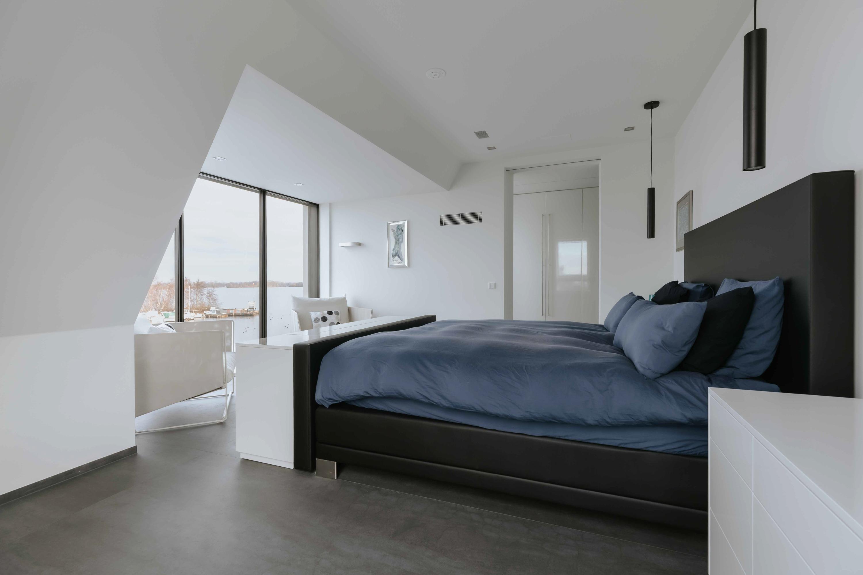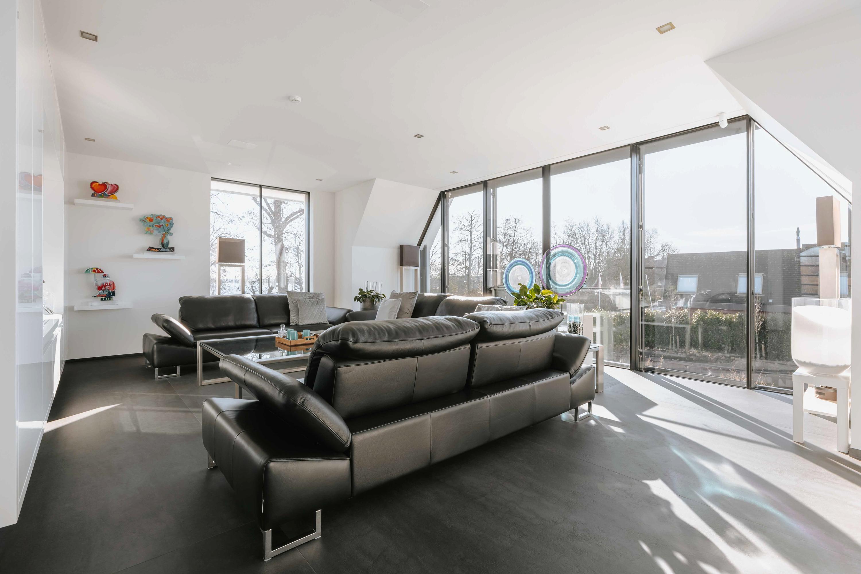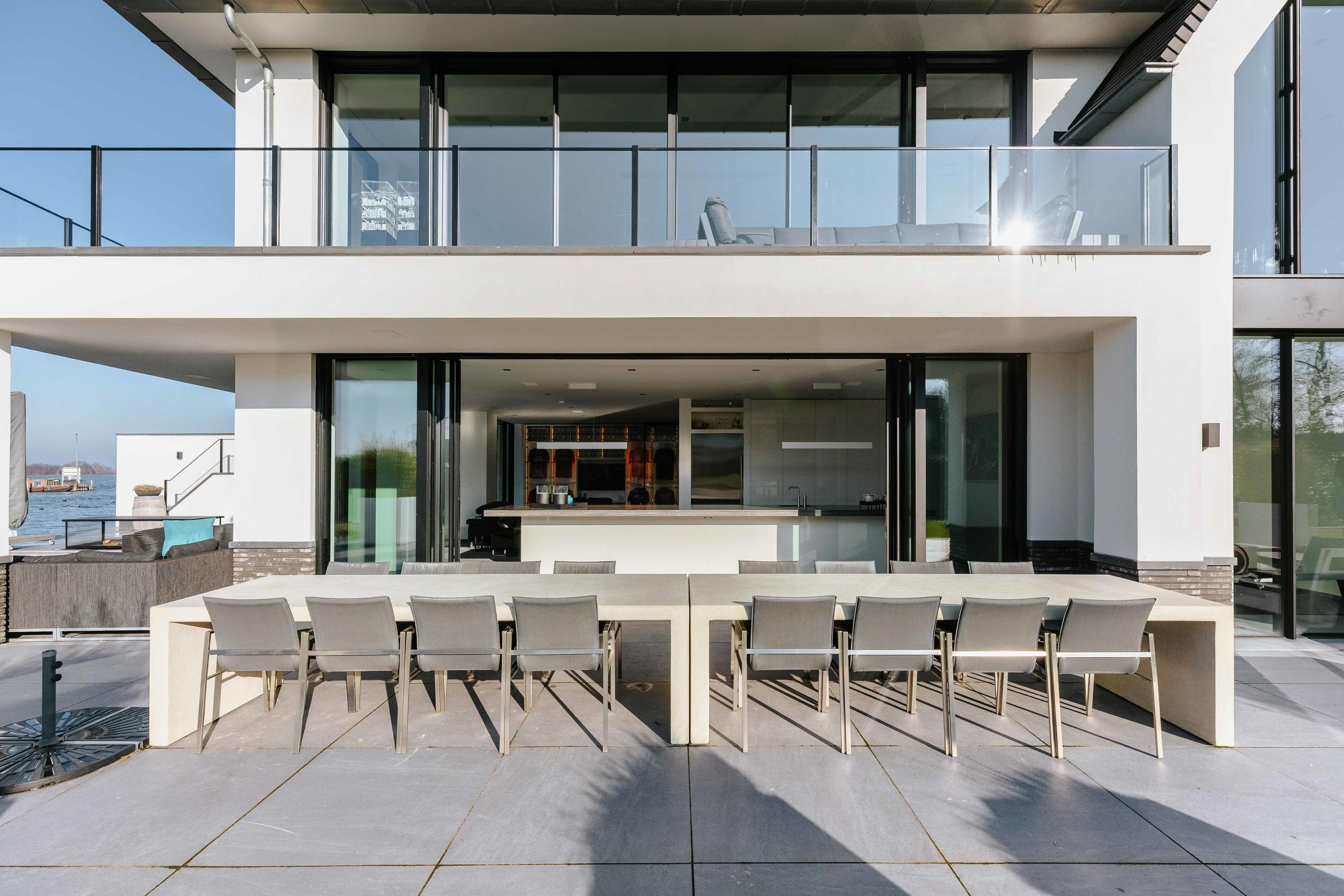 The villa is spread over several levels and has a passenger lift that can reach all levels. The spacious living area is located on the first floor and is characterized by impressive light thanks to floor-to-ceiling windows all around. Inside and outside flow seamlessly into each other here. The luxurious designer kitchen (Lodder) with high-quality built-in appliances forms the heart of the floor, flanked by a spacious dining room and living room with gas fireplaces and stylish, silently sliding steel/glass doors. From the kitchen, you can enjoy phenomenal views of both the harbor and the Vinkeveense Plassen lakes.