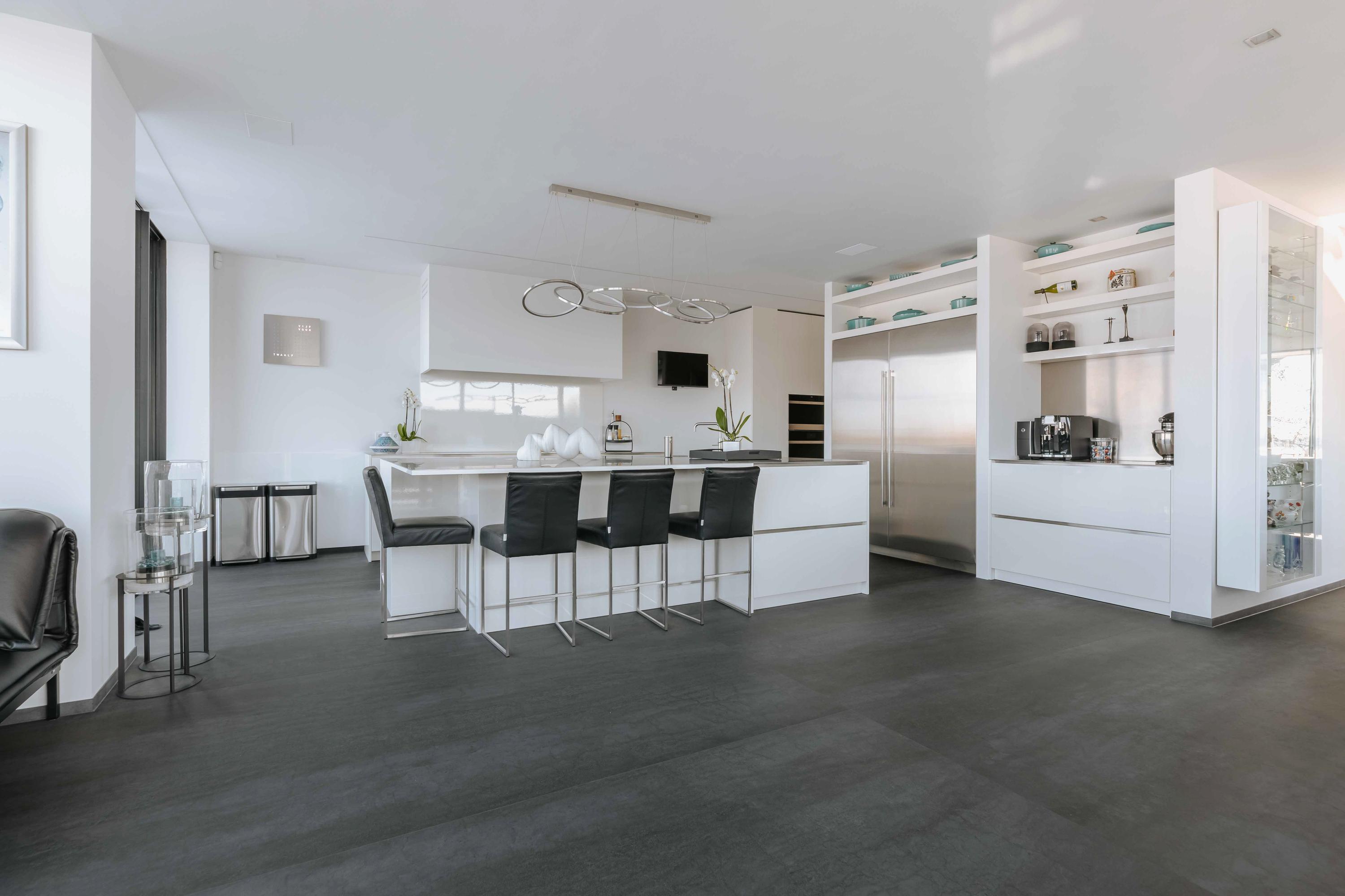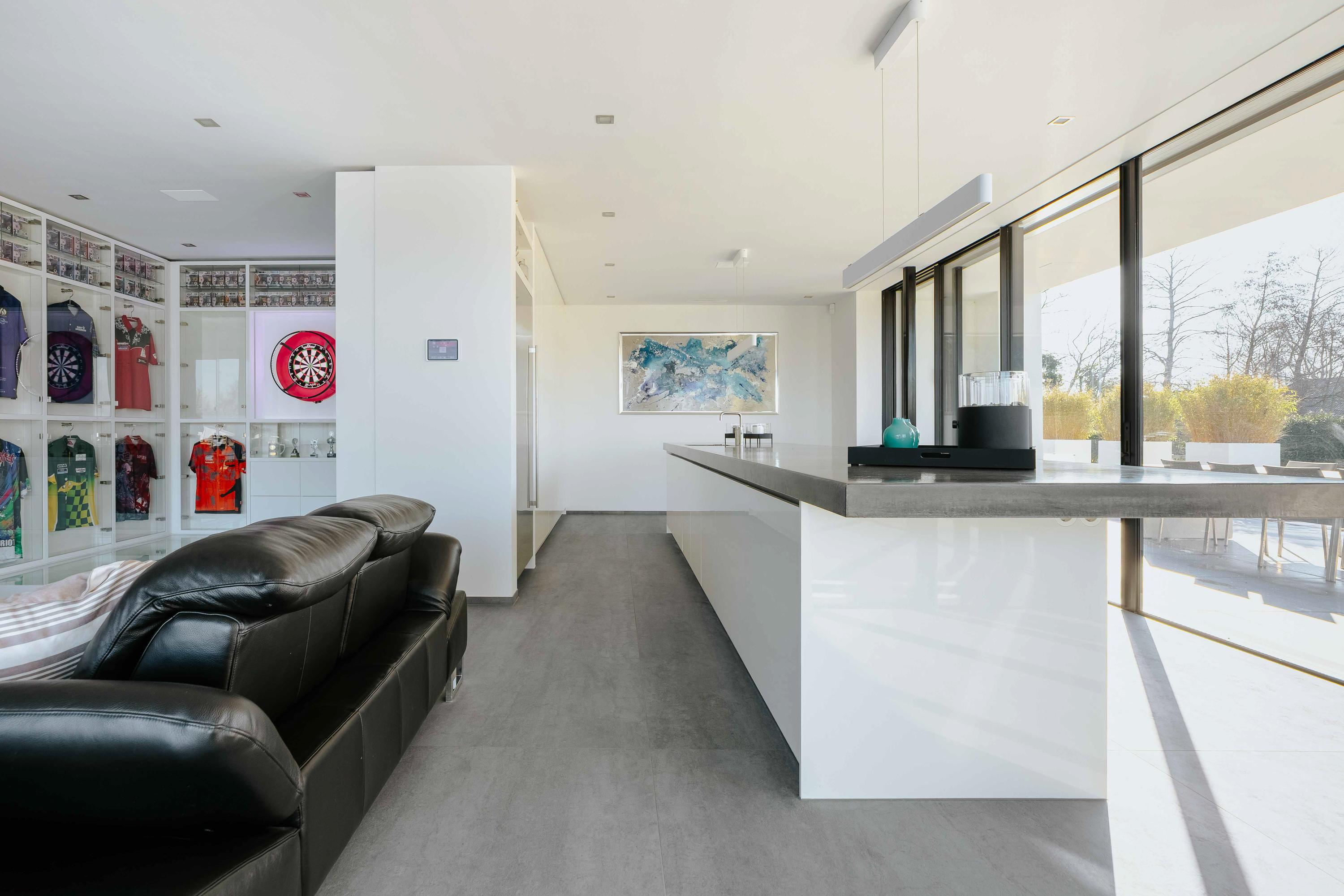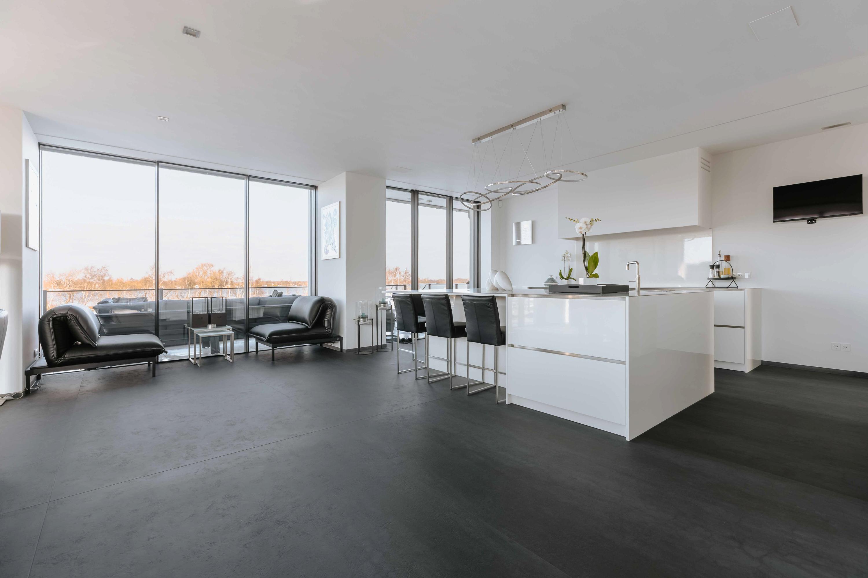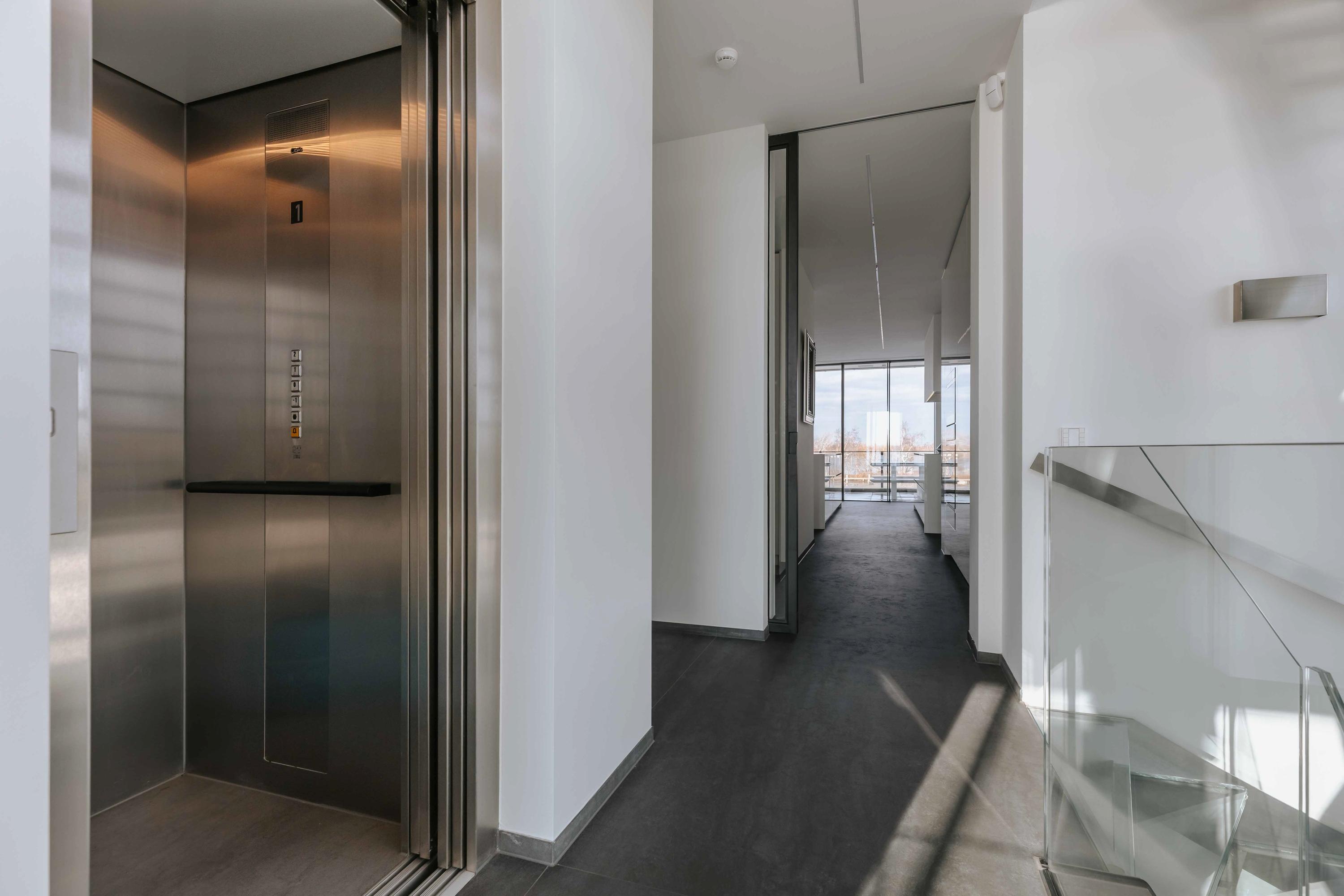 The villa is spread over several levels and has a passenger lift that can reach all levels. The spacious living area is located on the first floor and is characterized by impressive light thanks to floor-to-ceiling windows all around. Inside and outside flow seamlessly into each other here. The luxurious designer kitchen (Lodder) with high-quality built-in appliances forms the heart of the floor, flanked by a spacious dining room and living room with gas fireplaces and stylish, silently sliding steel/glass doors. From the kitchen, you can enjoy phenomenal views of both the harbor and the Vinkeveense Plassen lakes.