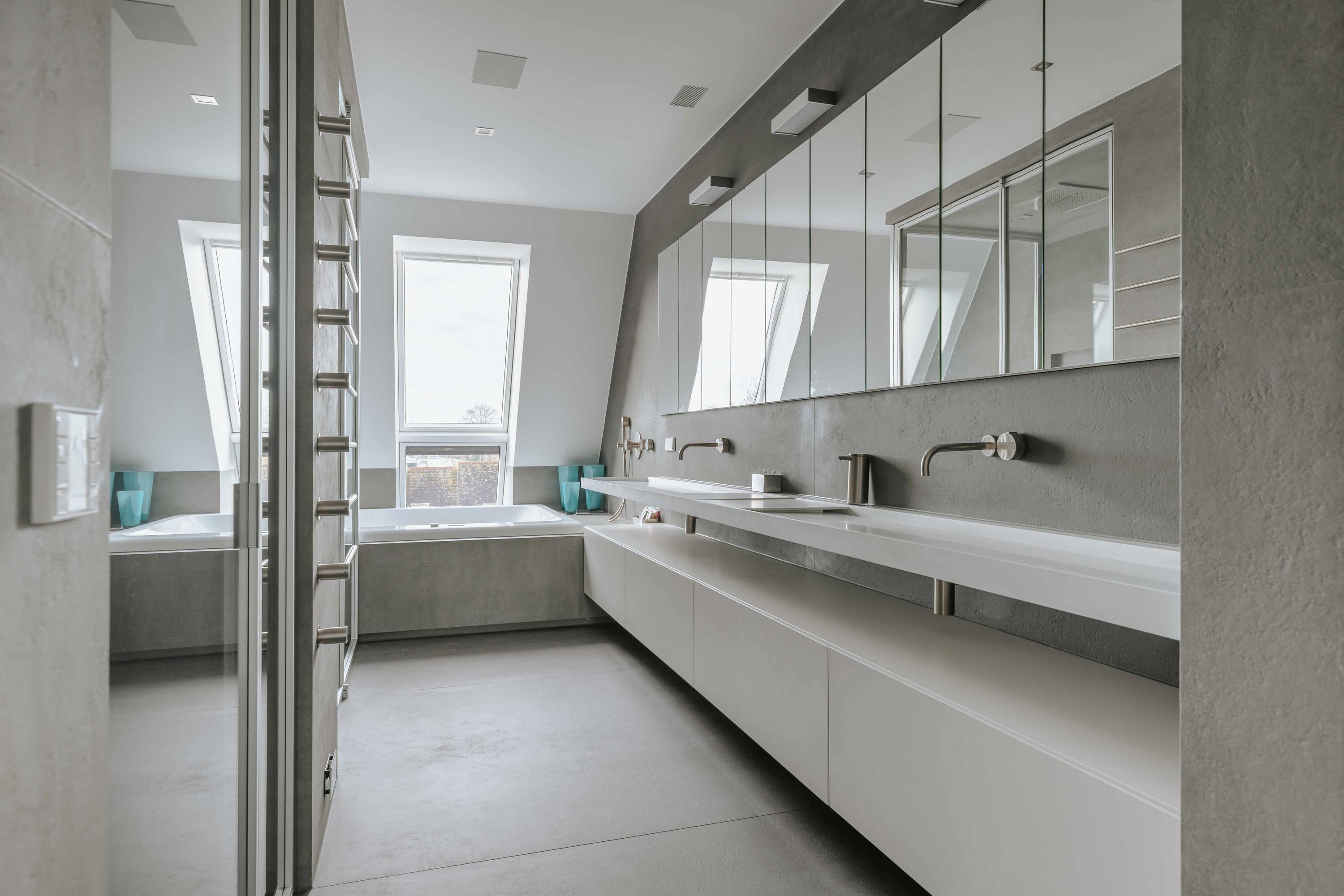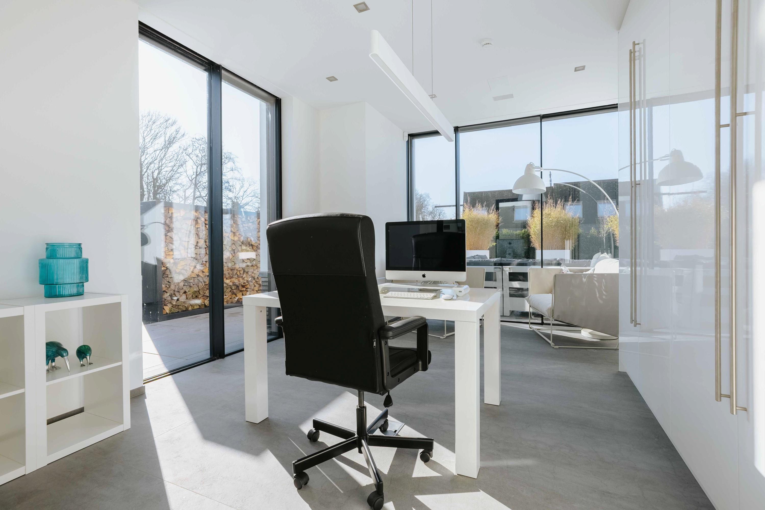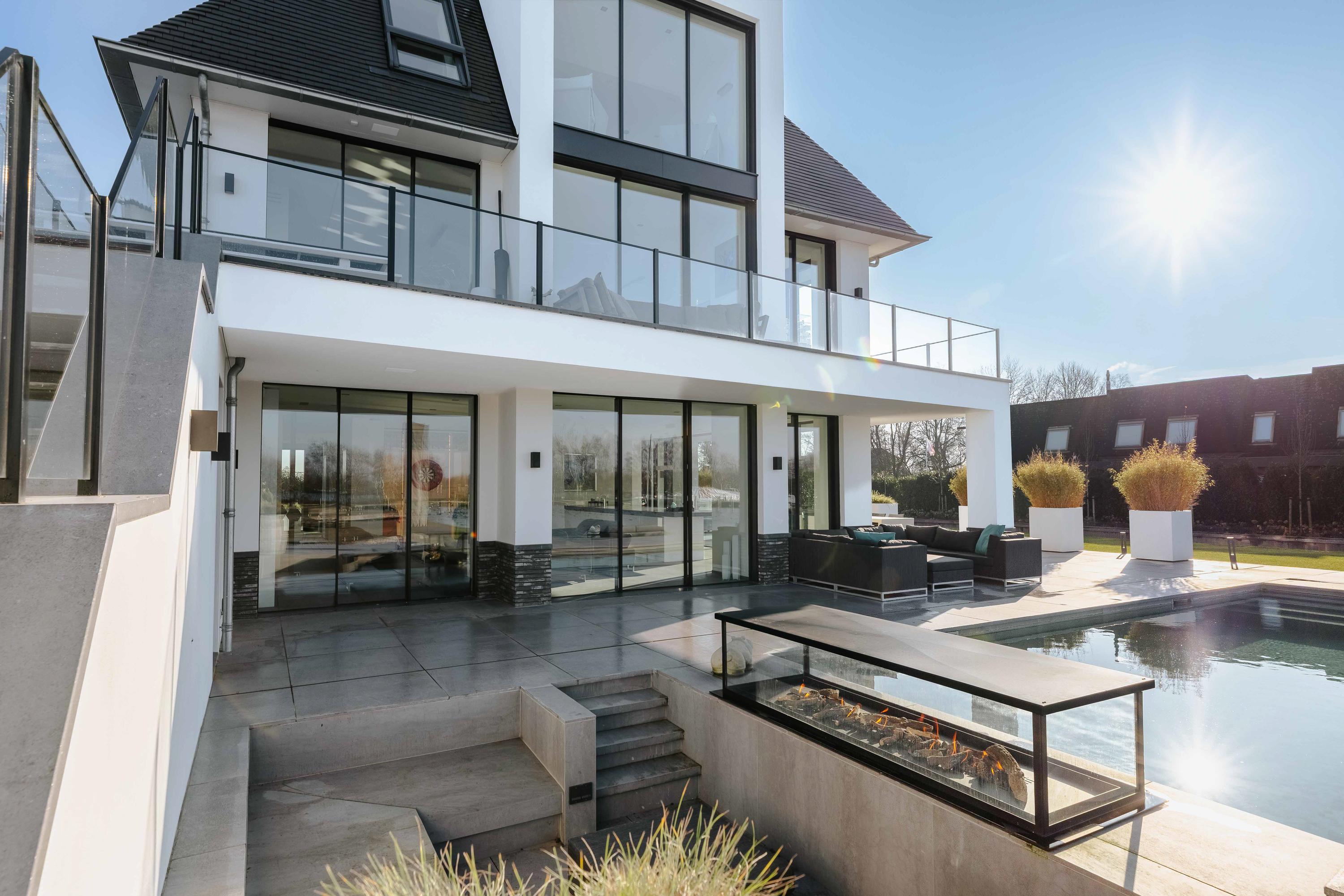 The second floor features three comfortable bedrooms and two luxurious bathrooms. The impressive master suite has a walk-in closet, air conditioning, and a fully equipped wellness bathroom with a sun shower, steam shower, and bathtub. All rooms have been finished with an eye for detail and feature custom cabinets and luxurious sanitary ware.