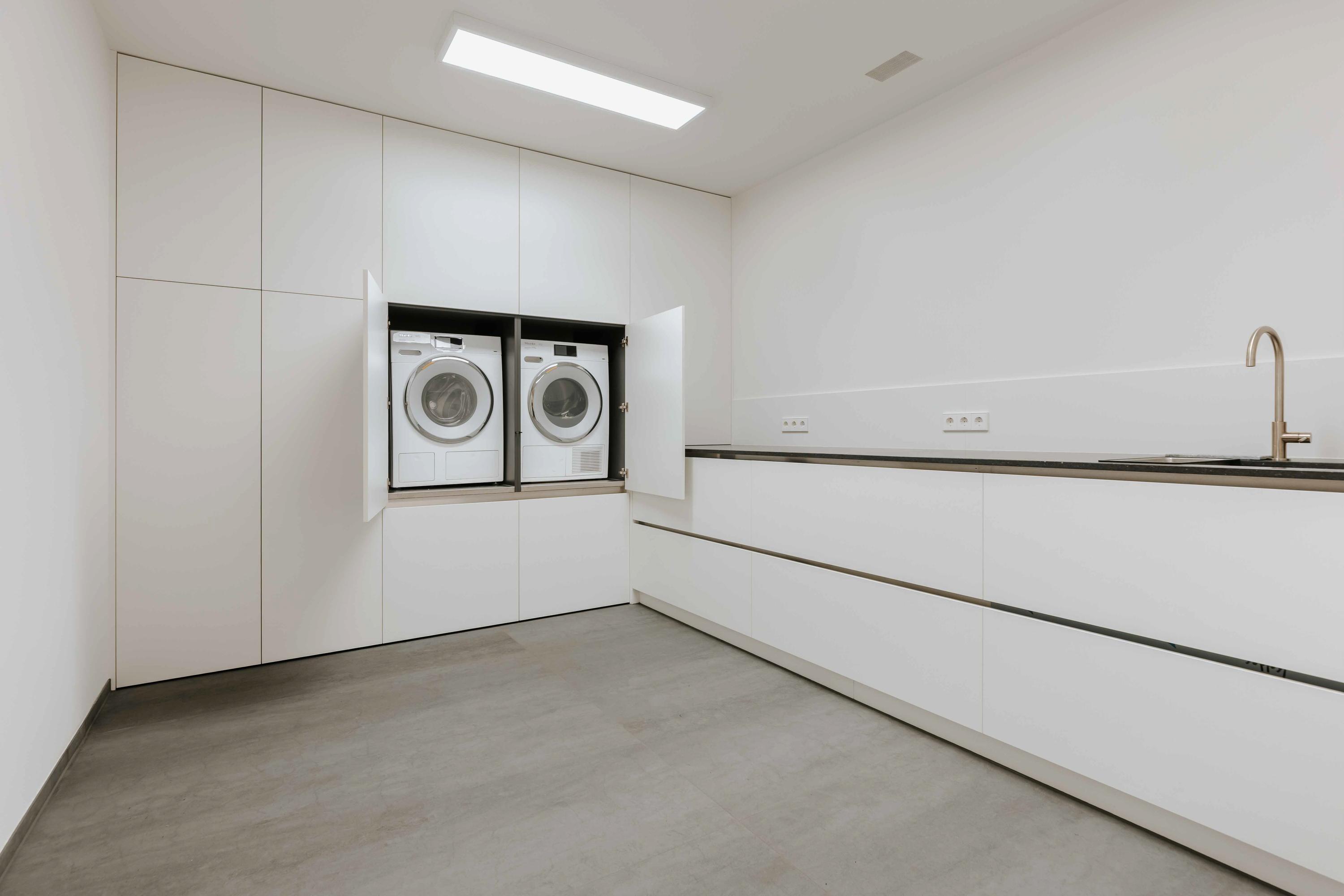 Here you will find a spacious laundry room with kitchenette, plenty of cupboard and storage space.