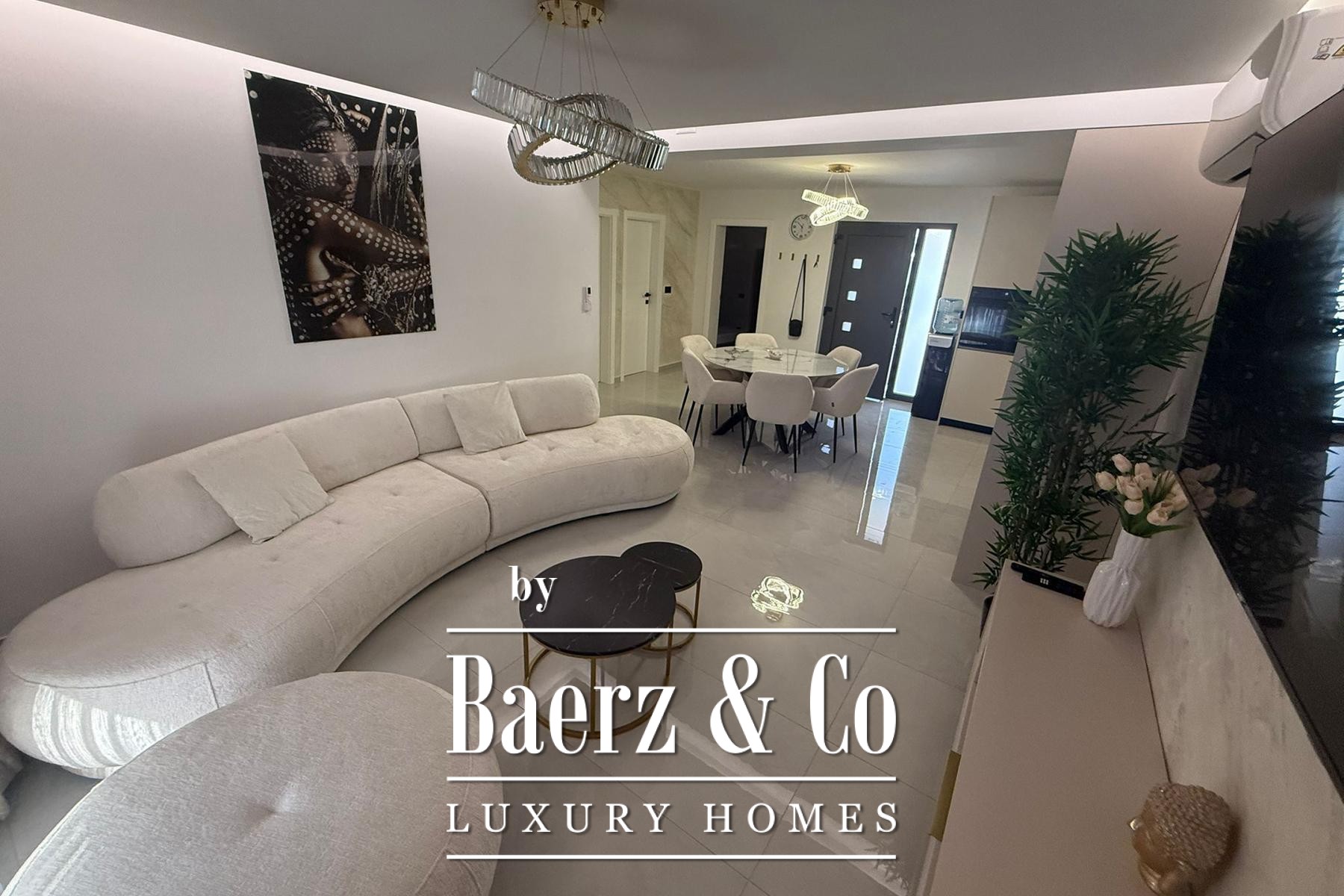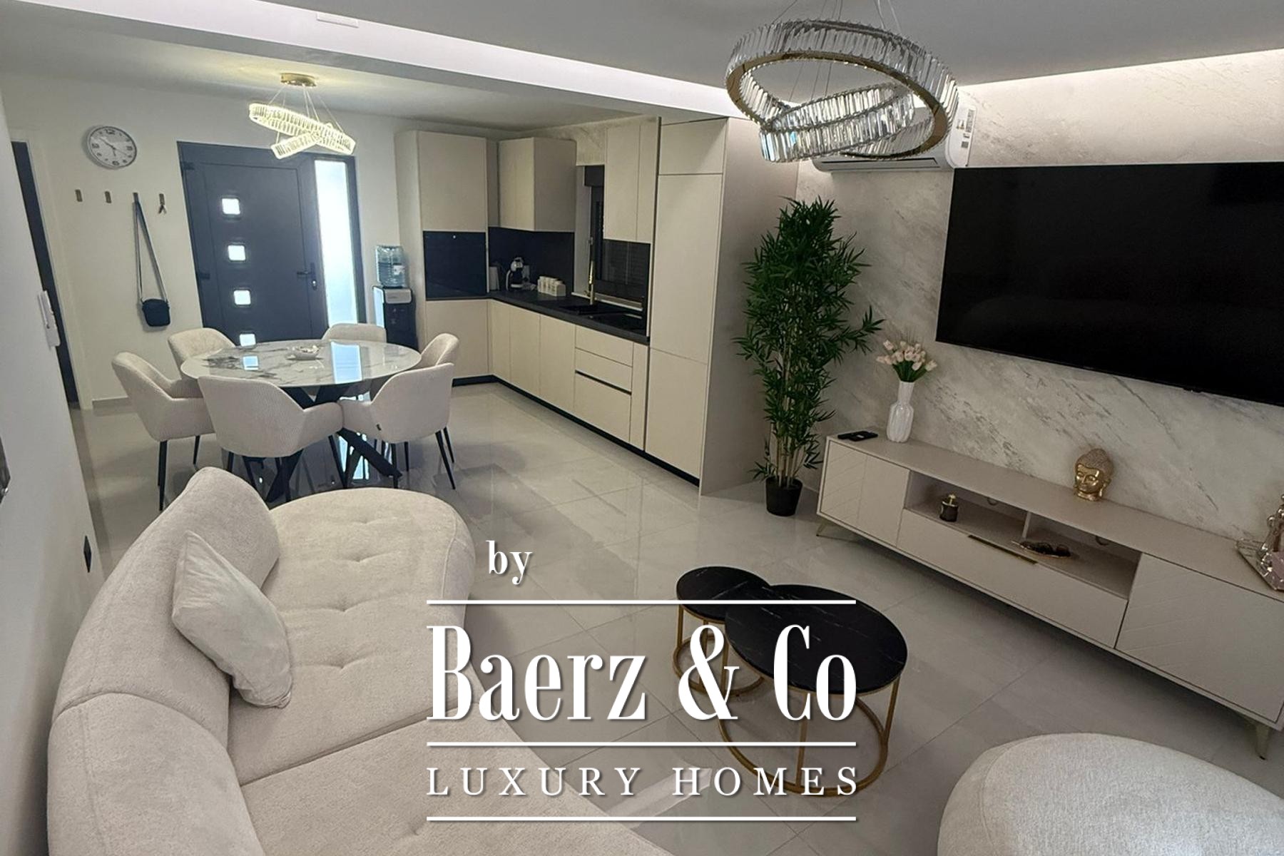 The main residence comprises a 72 m² ground floor apartment with an enclosed 36 m² terrace and a practical 4 m² outdoor storage, totaling 112 m² of thoughtfully arranged space. Above, the first floor apartment mirrors this with 72 m² of interior living, opening to a 22 m² covered terrace, bringing the floor's total to 94 m². Each apartment is distinguished by contemporary furnishings, high-grade appliances, and full air conditioning, complemented by designer details that lend a quiet discernment to everyday life.