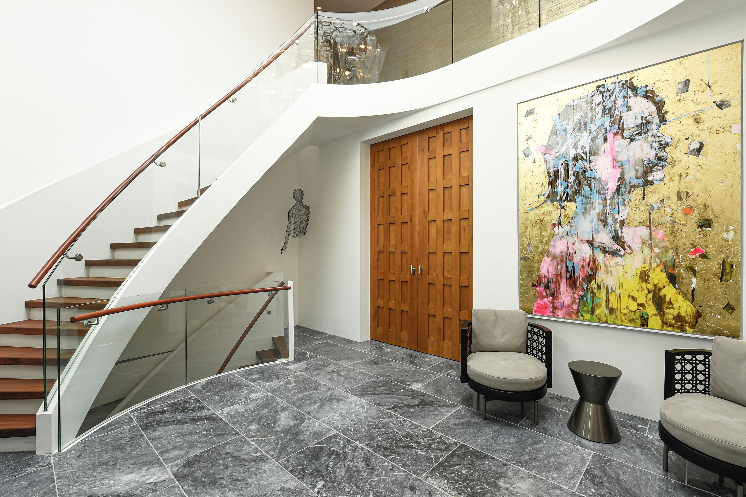 The grand entrance hall with sweeping staircase and high double doors immediately conveys a sense of openness and calm.