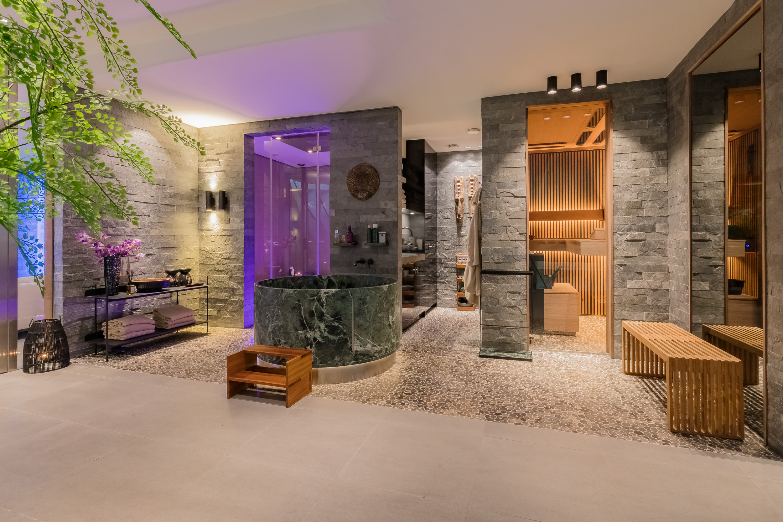 At its centre lies the 13-metre heated indoor pool, an architectural showpiece where sculpted walls ripple like mountain waves.