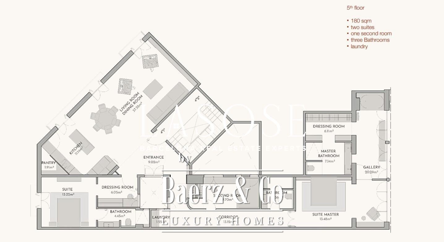 Flat Barcelona incarne une sérénité toute contemporaine au cœur de la ville, occupant 184 m² au cinquième étage d’un immeuble entièrement réhabilité en 2021. Cet appartement d’exception offre trois chambres et trois salles de bains, sublimées par un parquet en bois naturel et un double vitrage haute performance préservant quiétude et confort. La climatisation gainable et le chauffage par pompe à chaleur assurent un contrôle optimal de la température en toute saison.
