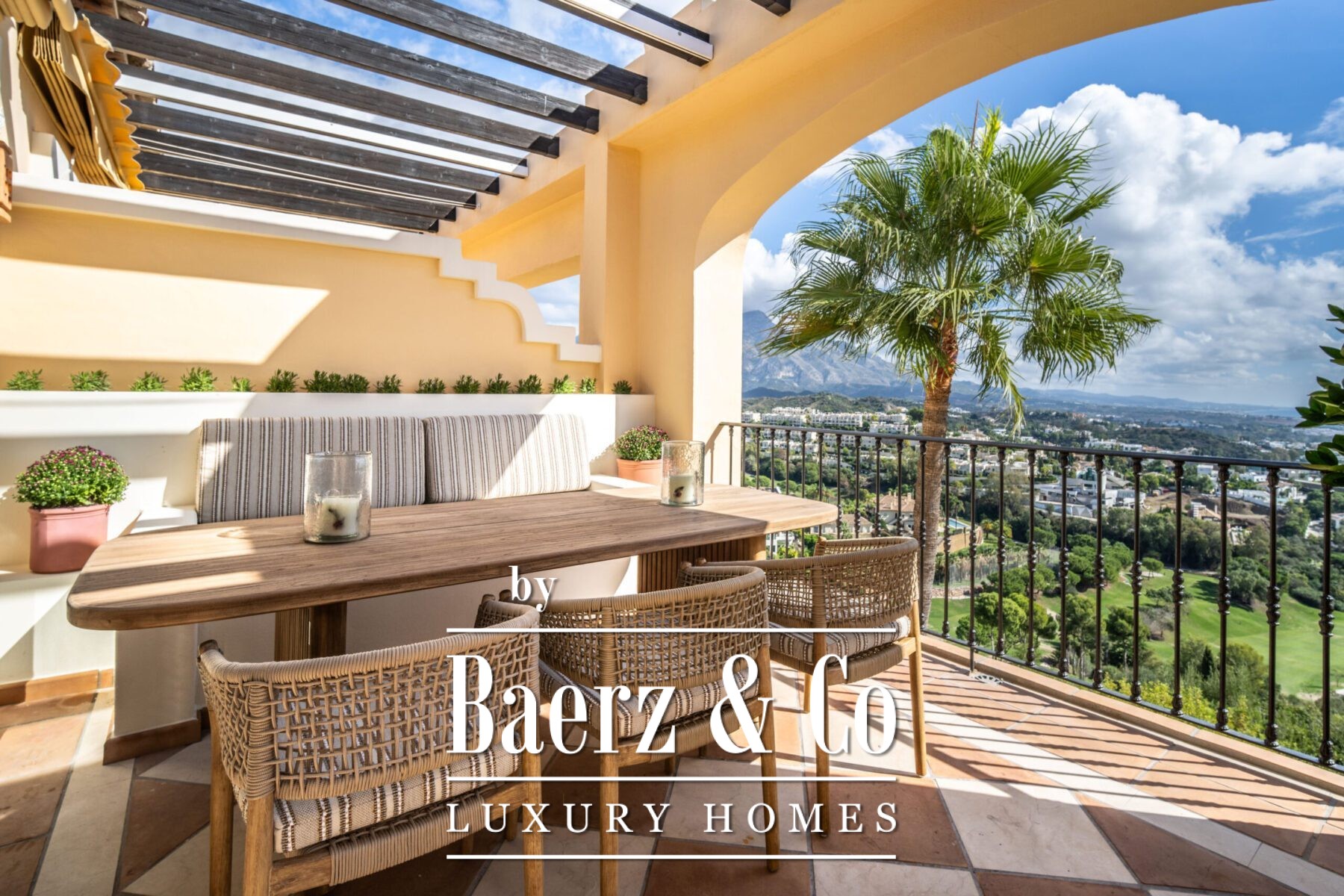 Ce penthouse à Marbella La Quinta surplombe le paysage avec des vues dégagées sur la mer, les montagnes et les verts émeraude du golf. Les terrasses invitent à vivre toute l’année, orientées pour saisir la douceur de l’aube comme la lumière apaisante du soir, parfaites pour des dîners privés ou des moments de quiétude.