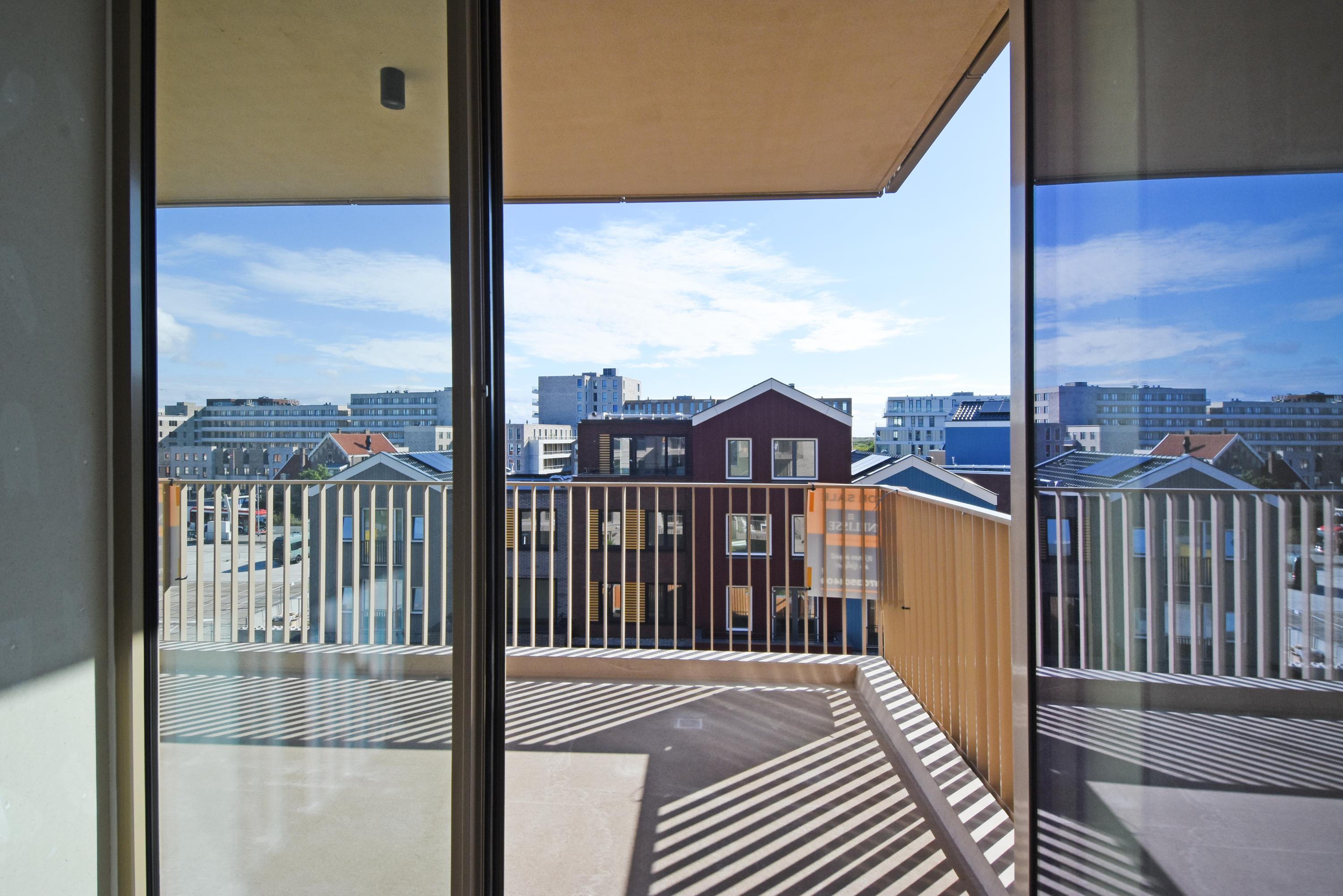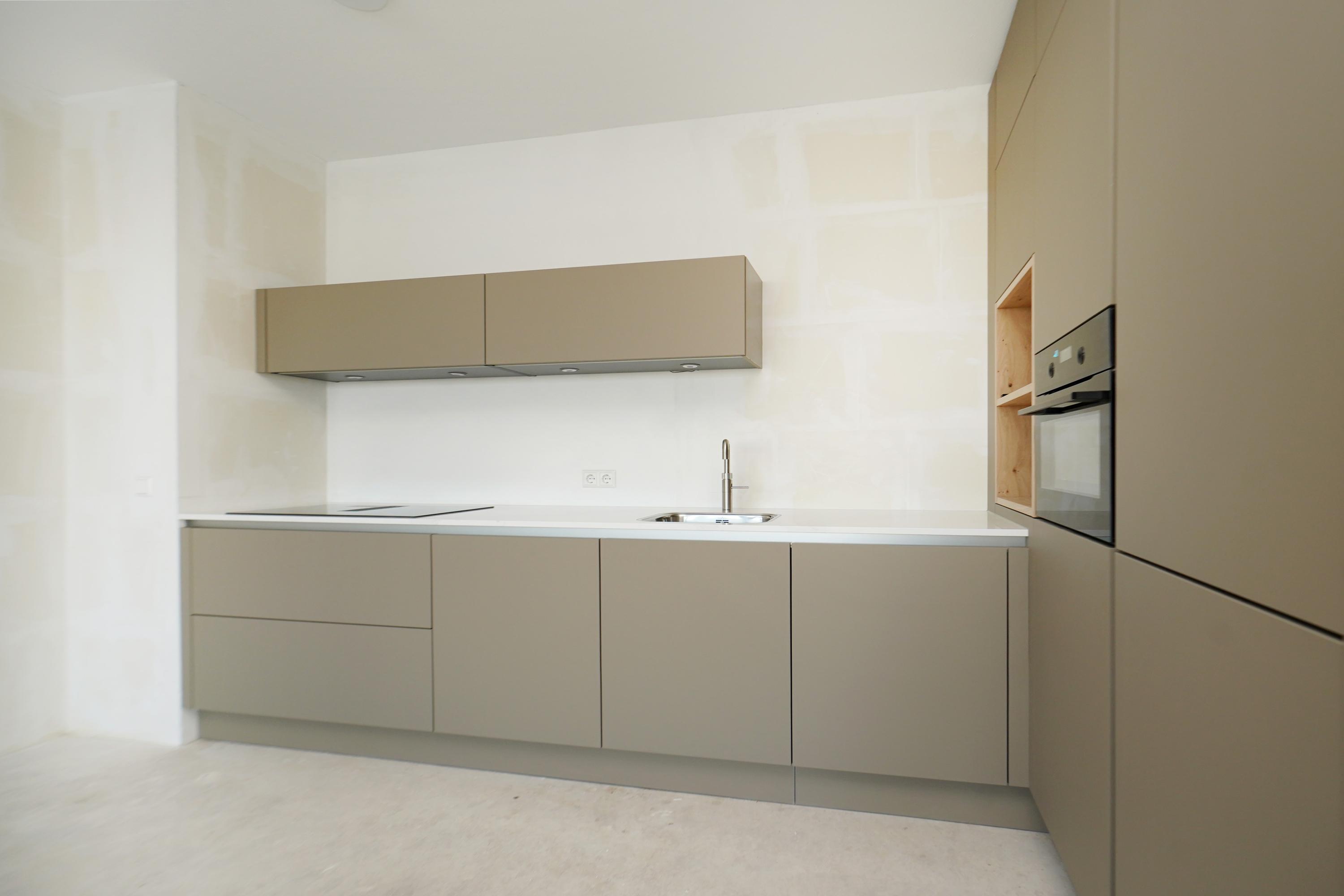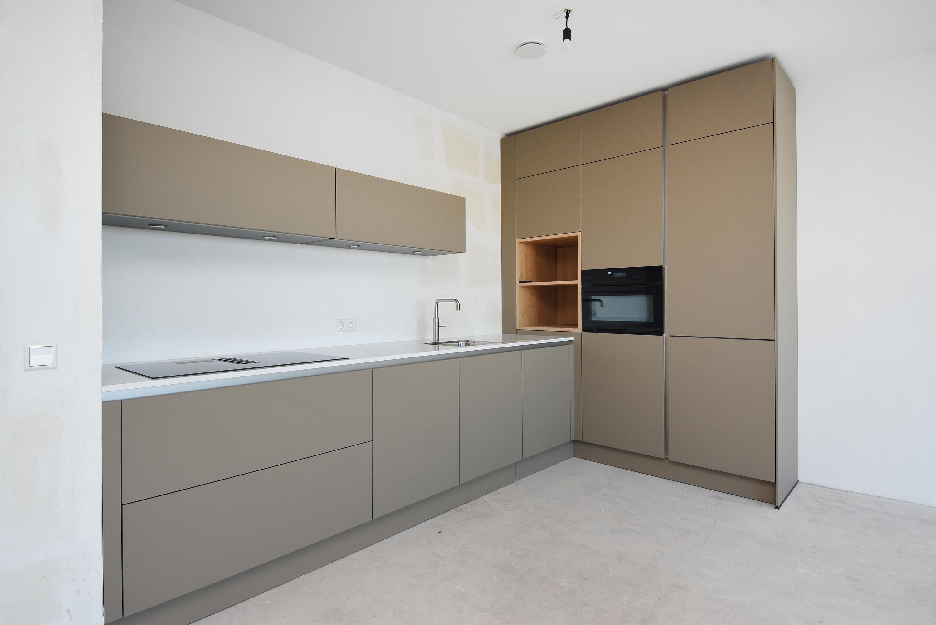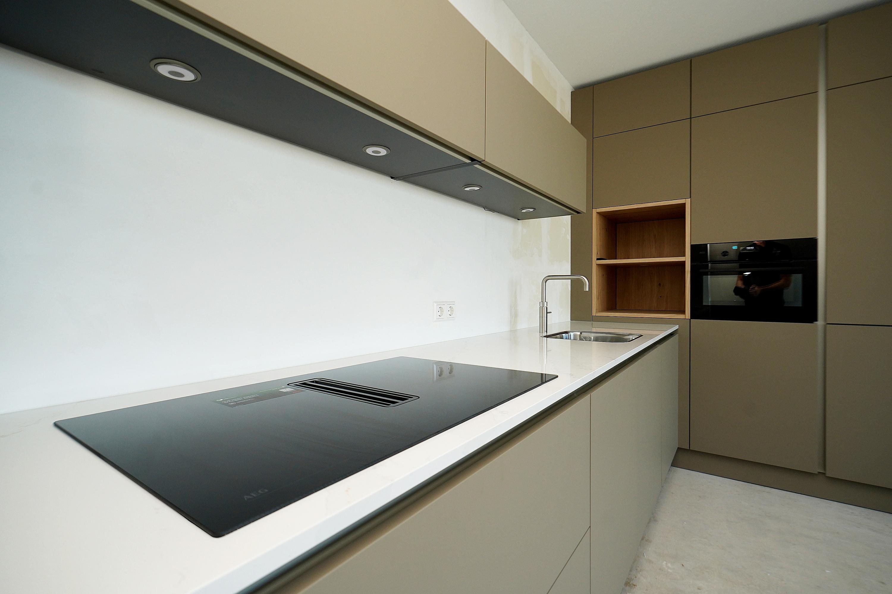 De open NEXT-125 keuken met een hoekopstelling is voorzien van een composiet aanrechtblad en inbouwapparatuur: inductiekookplaat met geïntegreerde afzuiging, vaatwasser, koel-/vriescombinatie Quooker en combi-oven. Aan de achterzijde van het appartement bevinden zich 2 slaapkamers, welke beide toegang geven tot het riante zonnebalkon op het zuiden met zicht op de gezamenlijke binnentuin.