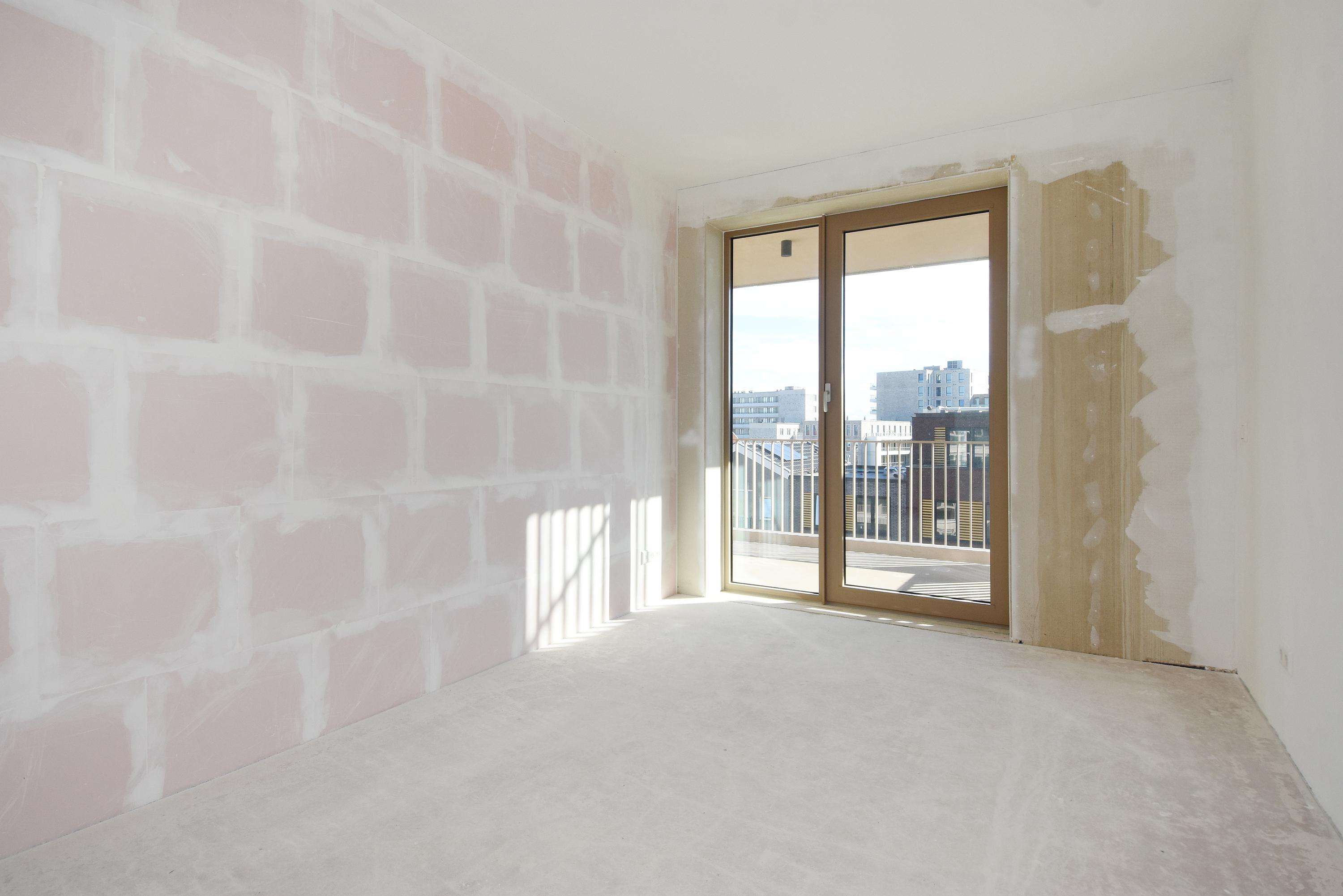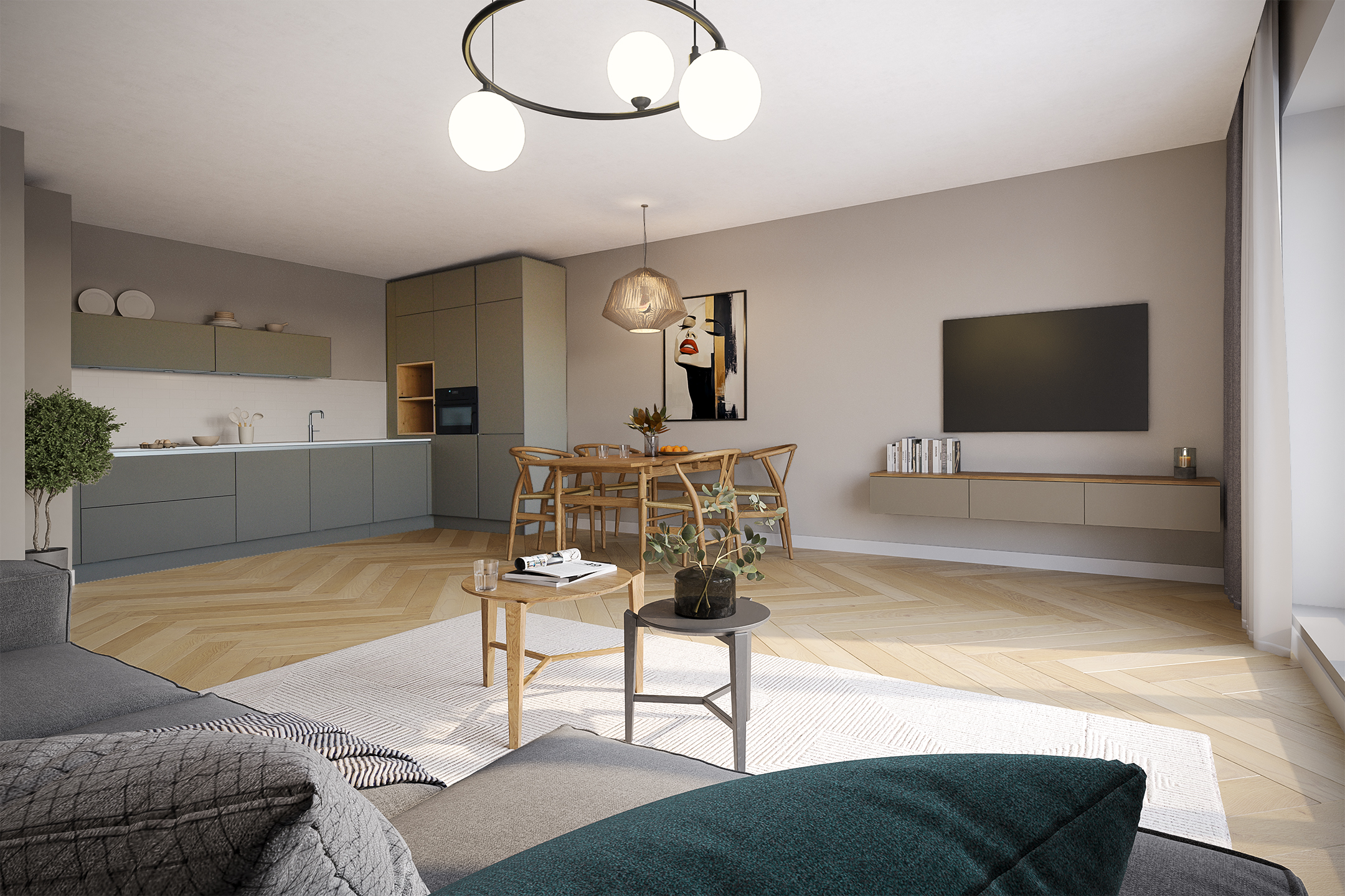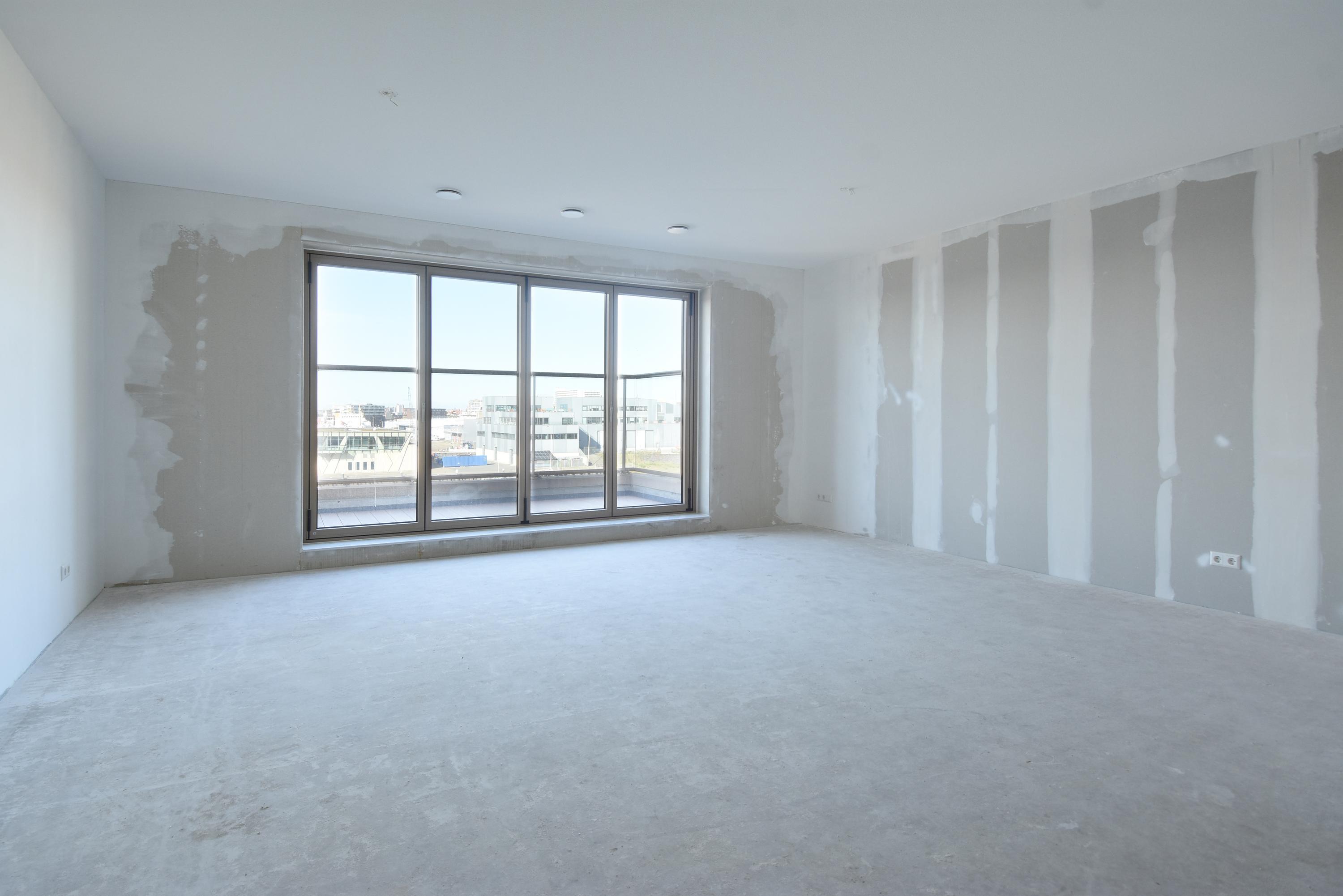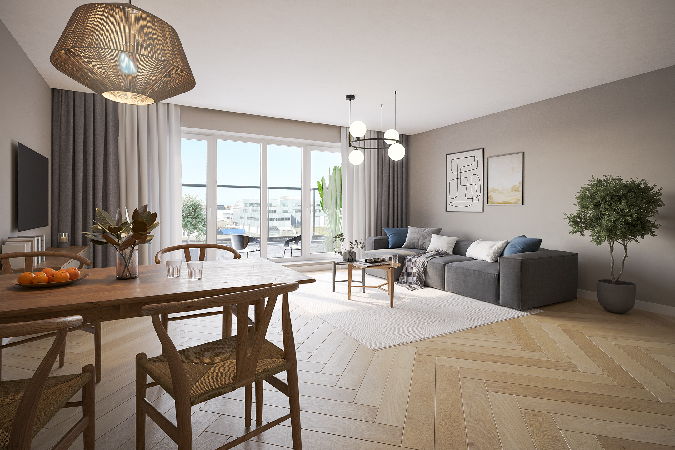 De open NEXT-125 keuken met een hoekopstelling is voorzien van een composiet aanrechtblad en inbouwapparatuur: inductiekookplaat met geïntegreerde afzuiging, vaatwasser, koel-/vriescombinatie Quooker en combi-oven. Aan de achterzijde van het appartement bevinden zich 2 slaapkamers, welke beide toegang geven tot het riante zonnebalkon op het zuiden met zicht op de gezamenlijke binnentuin.