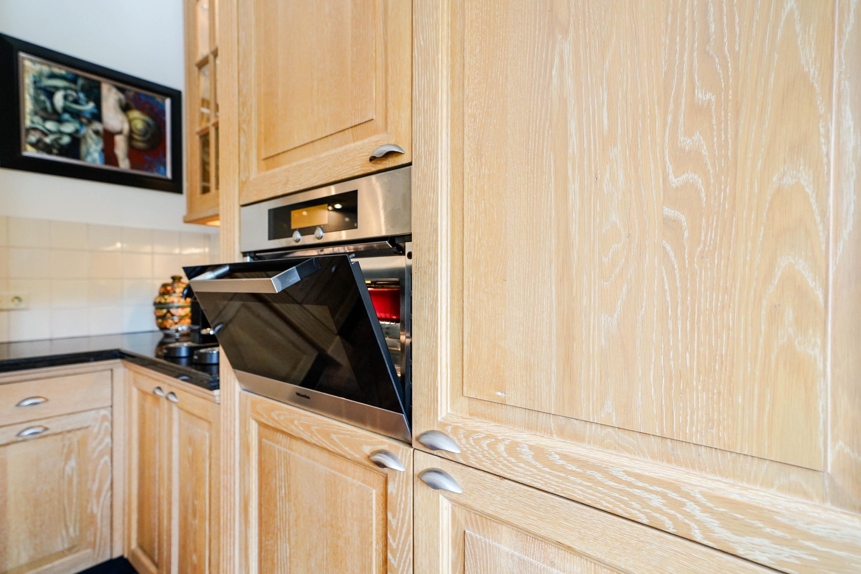 The garden-facing kitchen—accessible via an open passage from the living room—is equipped with Miele appliances and a Quooker boiling water tap. The handcrafted mantelpiece, fluted columns, polished stone countertops, and antique French floor tiles lend a rustic yet refined atmosphere.