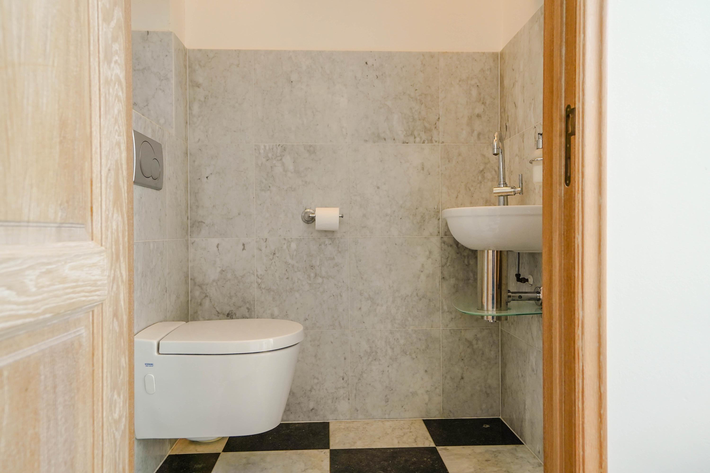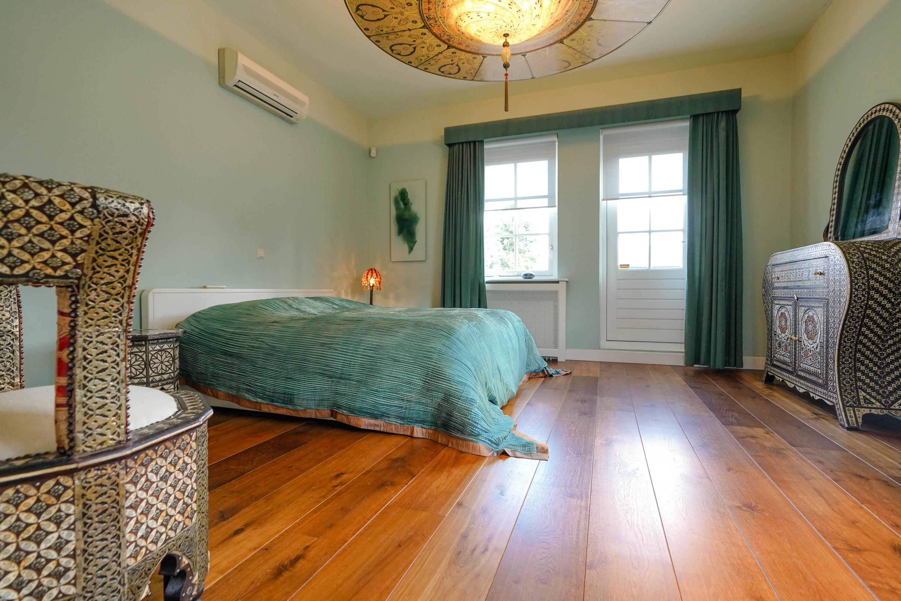 A spacious landing gives access to all rooms. The ceiling height is 2.9 meters throughout. Solid wood flooring (except in bathroom and toilet) is laid over the concrete subfloor across all rooms.