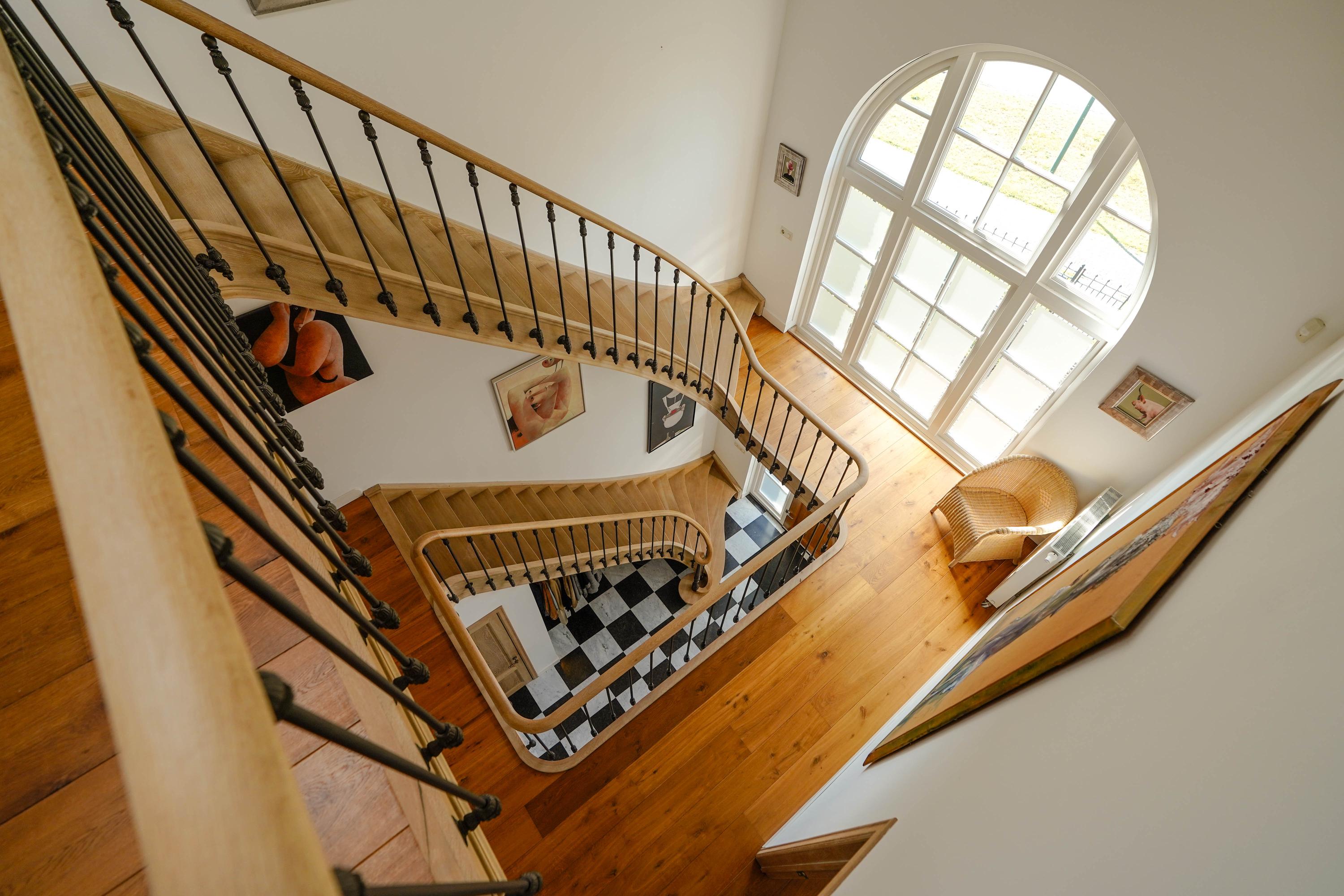 Inside, the entrance hall features a beautifully sculpted oak staircase. The solid oak handrail runs in a single, uninterrupted piece all the way to the top floor, supported by 87 patinated cast iron balusters—a masterpiece by renowned Belgian staircase maker Luc Steels, who also crafted all the panel doors and frames throughout the home. The hall includes a guest toilet and the meter cupboard. A skylight above the stairwell, combined with the large glass facade, brings natural light to all floors.