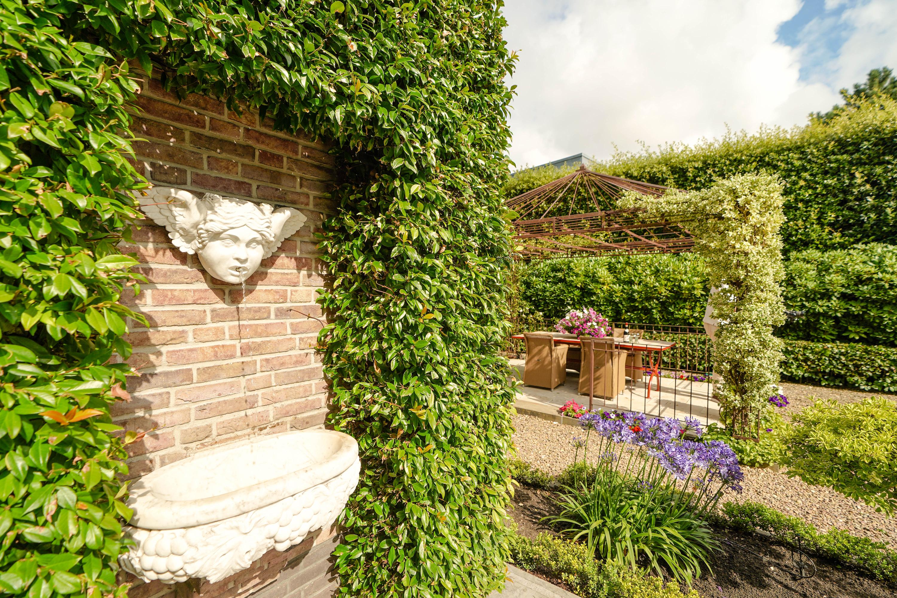 The 46 m² terrace is perfect for sunbathing or entertaining. In summer, the iron gazebo becomes a floral paradise with climbing roses and hanging baskets, ideal for alfresco dining. Two fountains—a French one to the right and a smaller Italian one by the terrace—add a refreshing touch. Bronze sculptures are available separately for purchase.