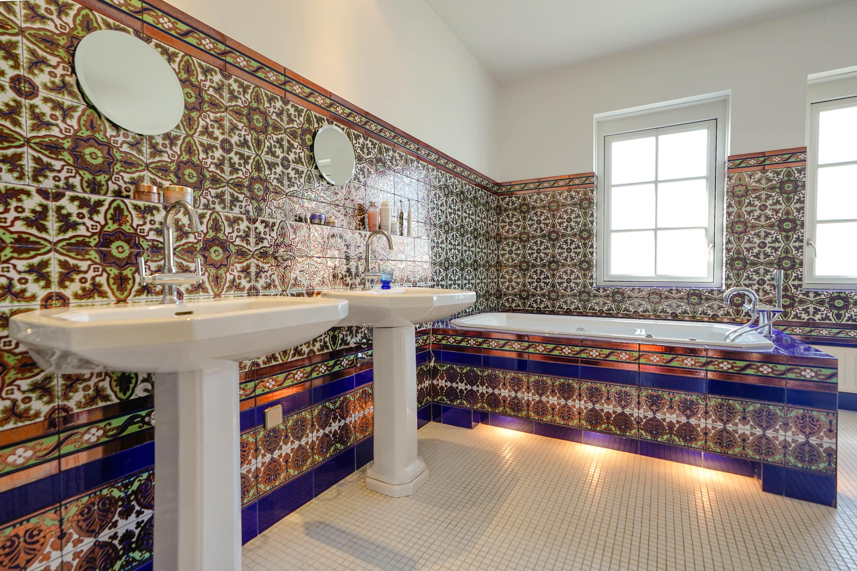 The luxurious bathroom is designed in Andalusian style and features a walk-in shower, jacuzzi bathtub, designer radiator, two Sphinx sinks, toilet, and matching Sphinx wall cabinets. The Andalusian wall tiles—meticulously laid in a patterned design—were imported from Mensaque Rodrigues, Triana/Seville, Spain.