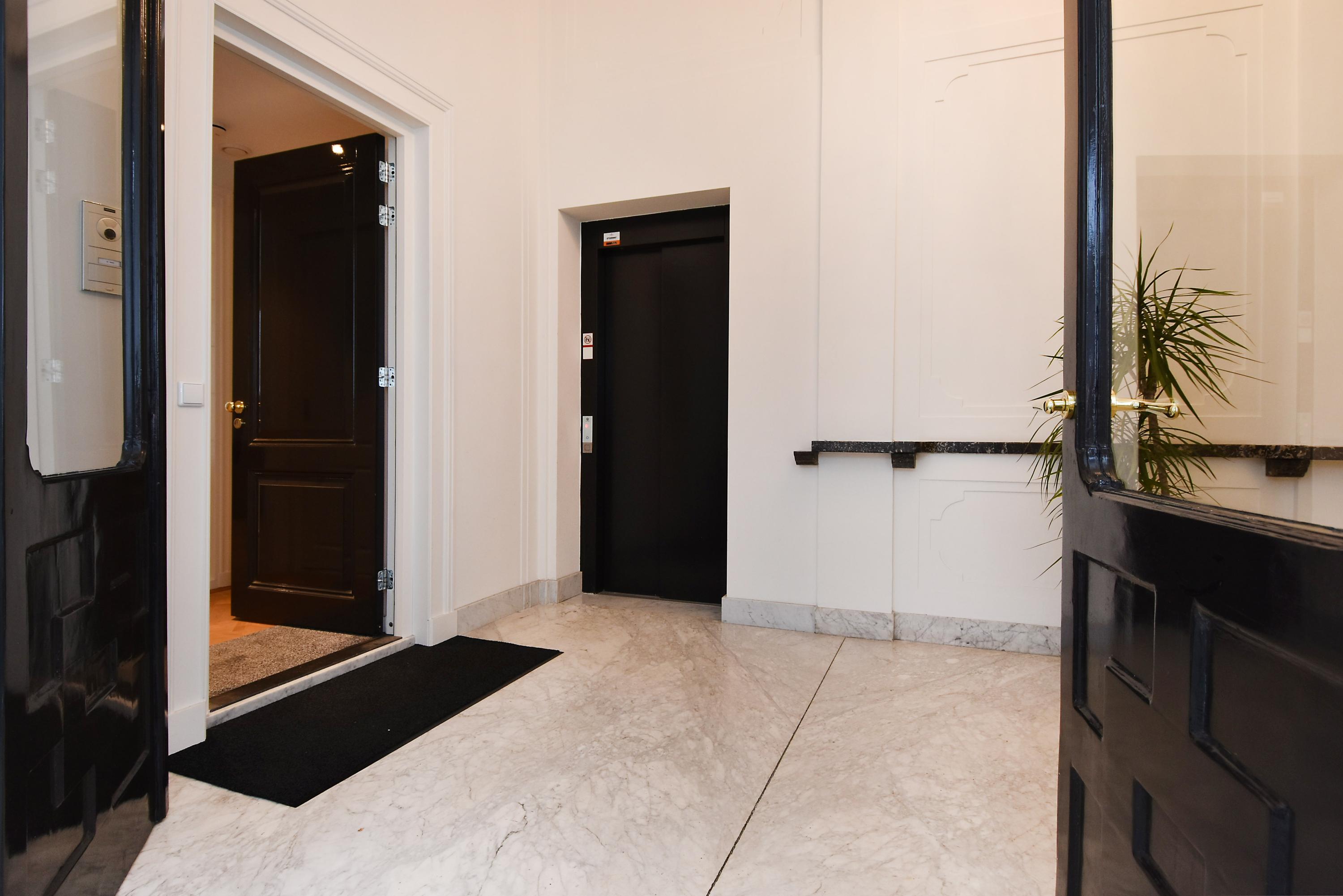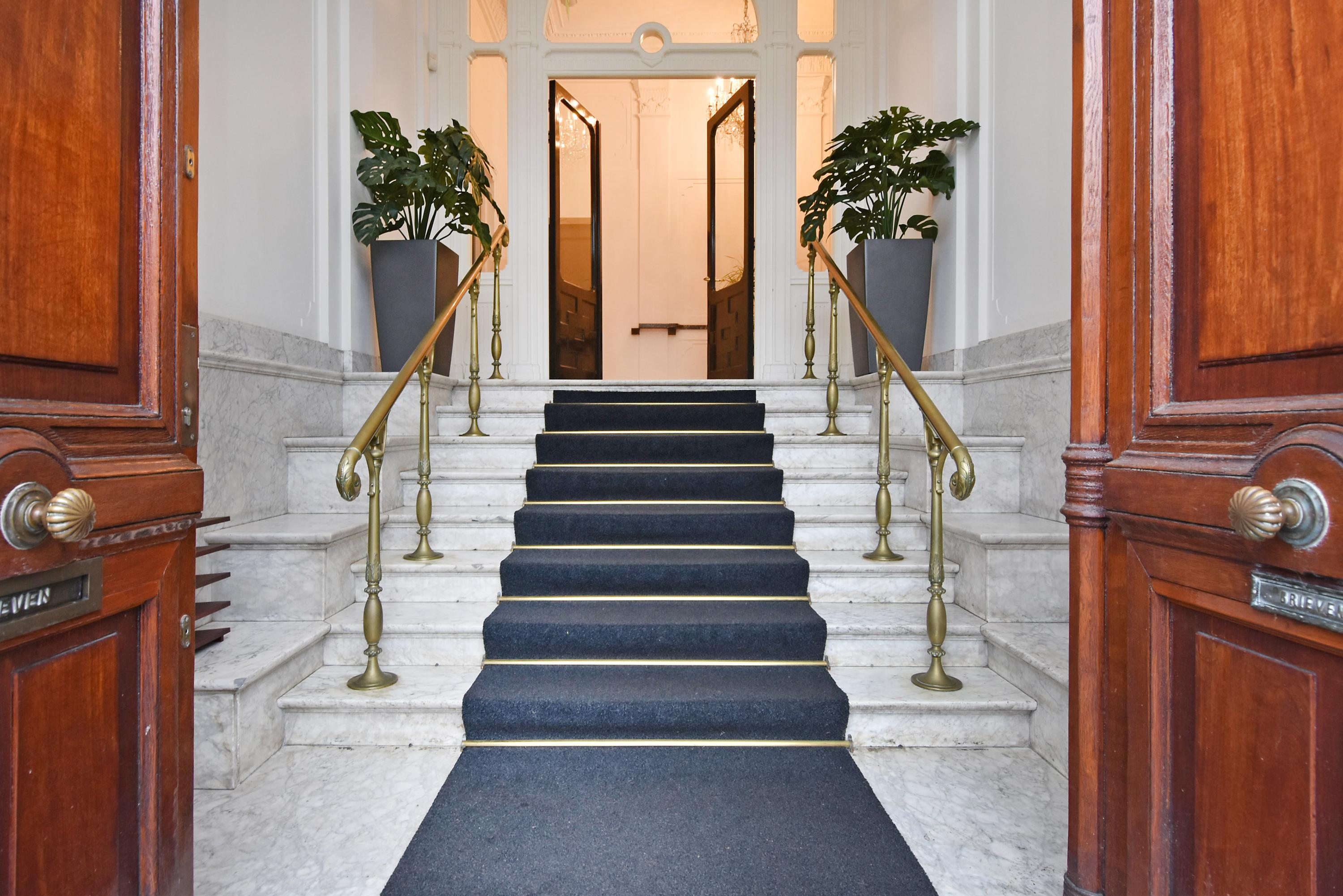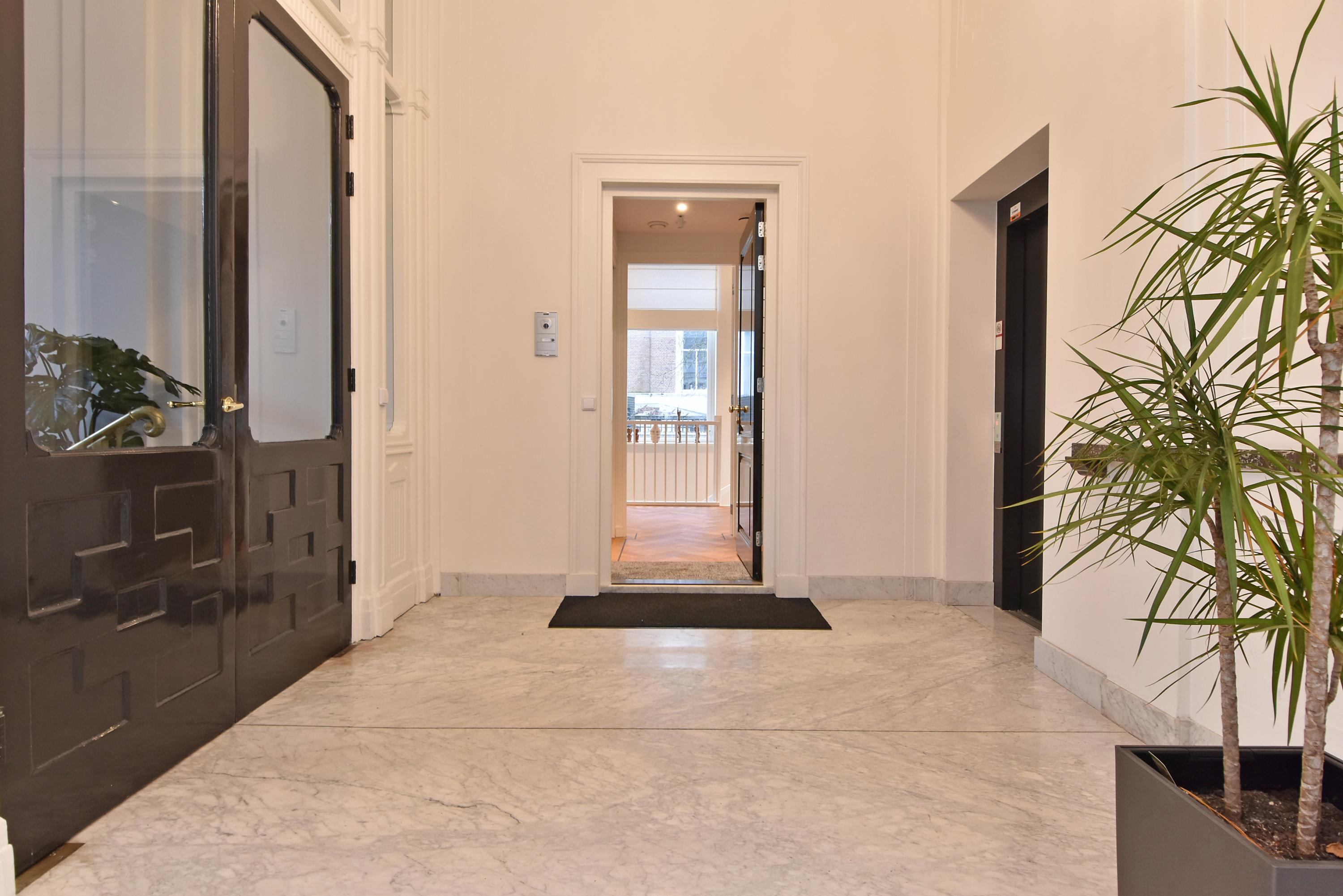 Via een fraaie dubbele entreedeur komt u in de prachtige entree van het kleinschalige appartementencomplex. Deze entree ademt luxe en grandeur uit door de fraaie marmeren trap en lambrisering, de fraaie kroonluchter en het ornamentenplafond. Met een trap komt u op de 1e woonlaag waar de entree van het appartement is.