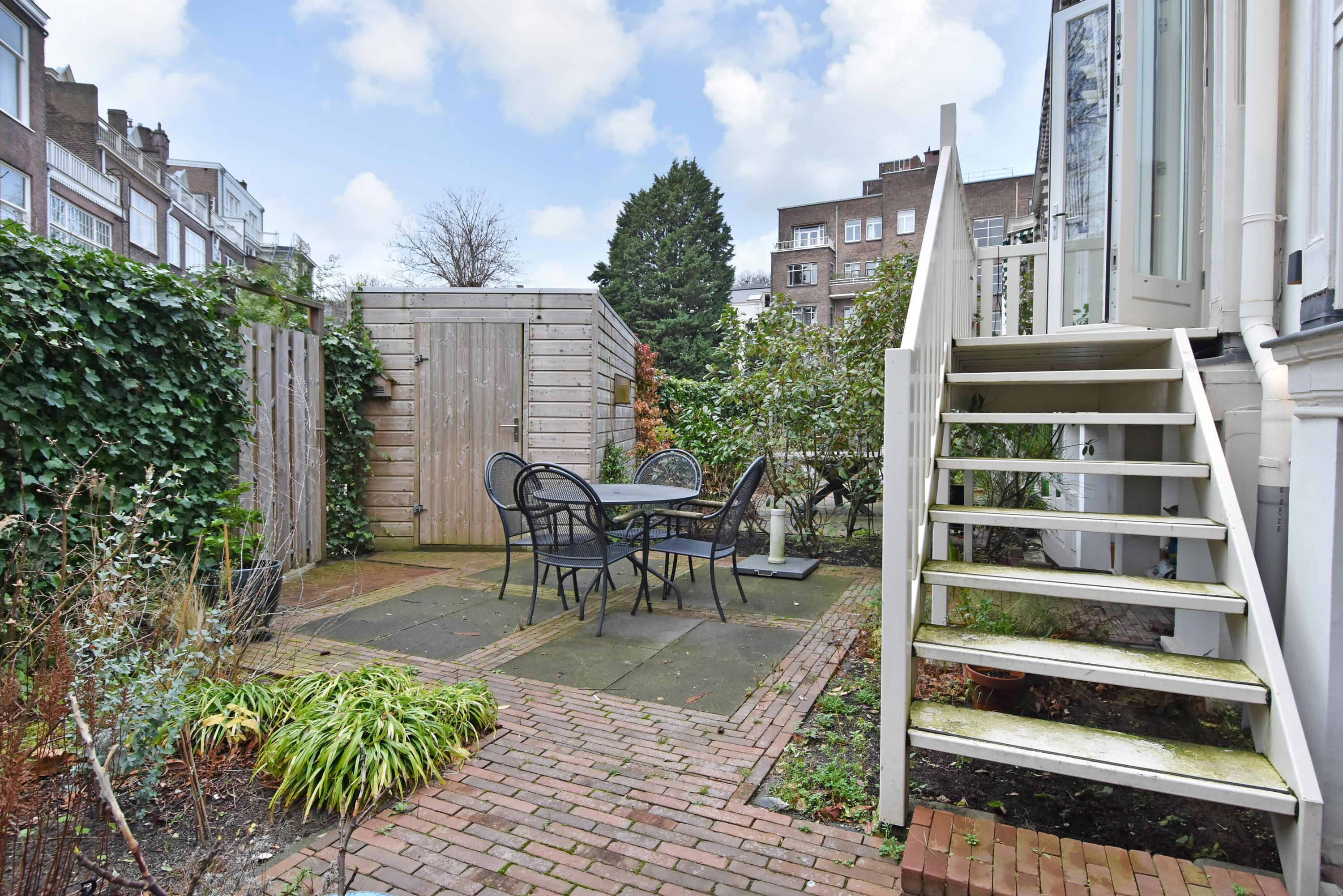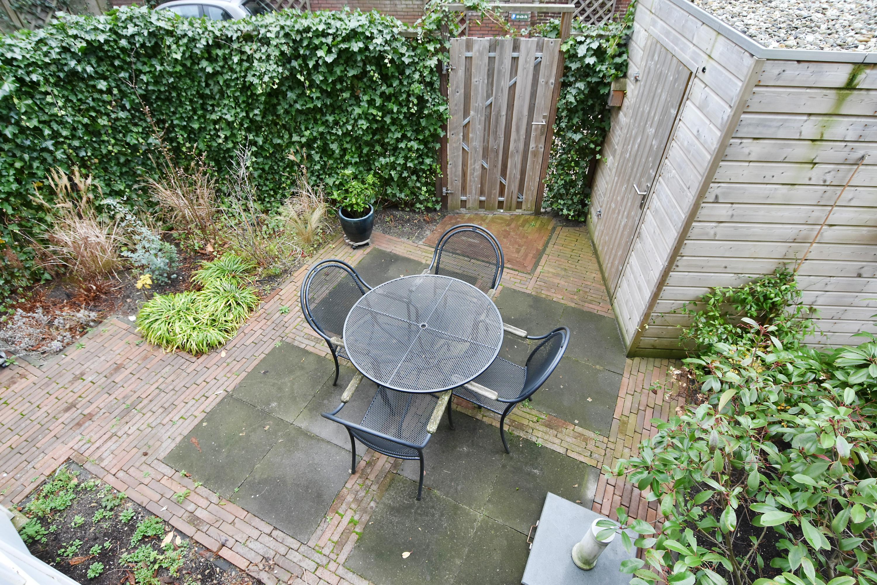 Aan de achterzijde van de woon-/eetkamer is de toegang tot het balkon en met een trap komt u in de stadstuin met berging en achteringang. De tuin is gelegen op het zuiden.