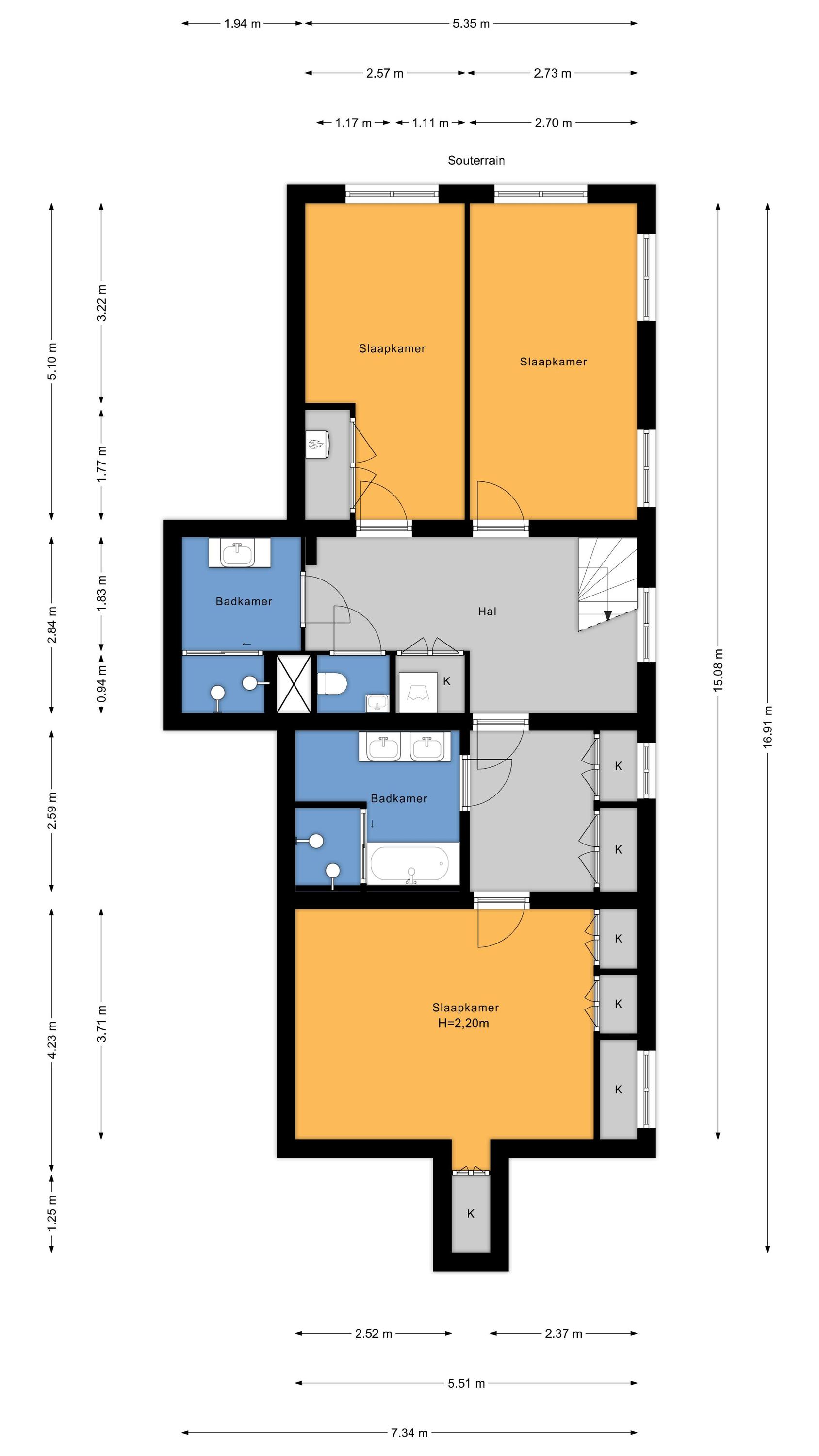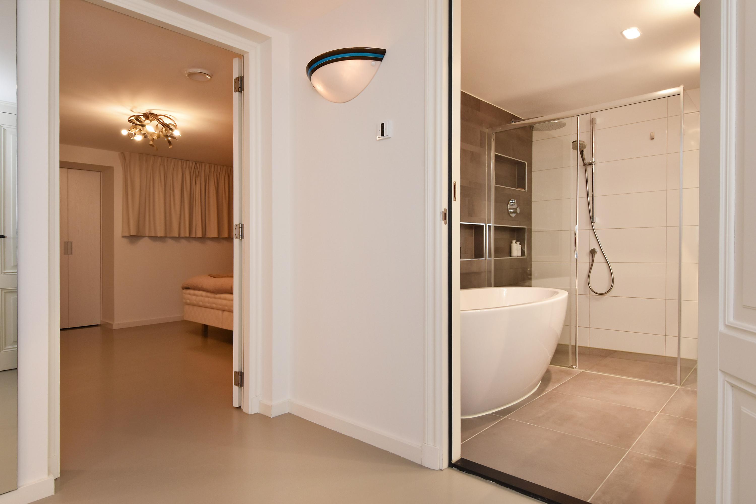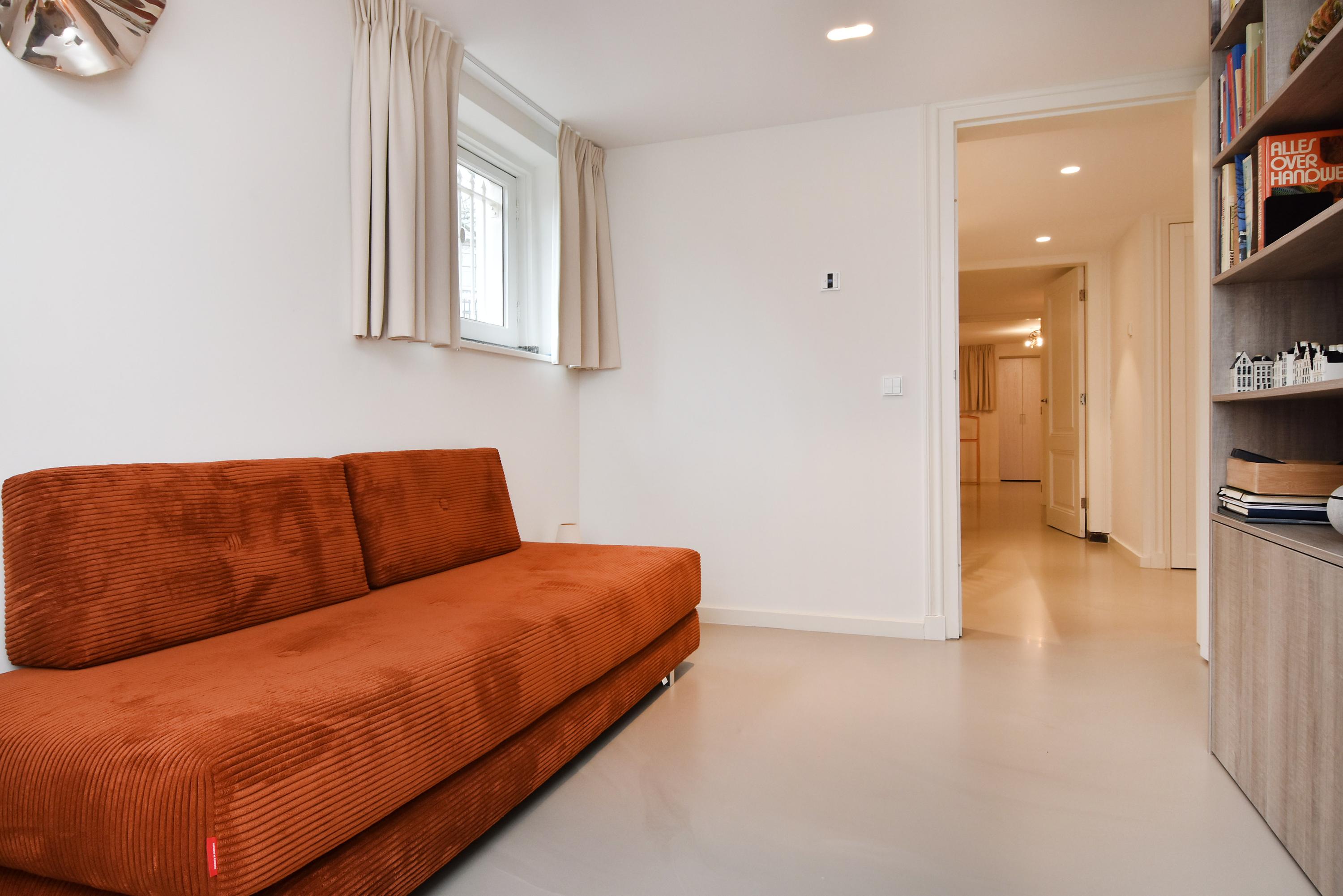 Via de woonkamer komt men via een trap in het centrale gedeelte van het souterrain. Daar zijn o.a. een ingebouwde kast met aansluiting voor wasmachine/droger en een separaat modern toilet met fonteintje. Het souterrain beschikt over 2 ruime slaapkamers aan de voorzijde die beide voorzien zijn door fraaie luiken en originele deuren. De tussengelegen badkamer is voorzien van een ruime inloopdouche met regendouche, wastafel met ladekast, design handdoekradiator en vloerverwarming. Aan de achterzijde is een kledingkamer met ingebouwde kasten en toegang tot 2e badkamer voorzien van een luxe vrijstaand ligbad, een ruime inloopdouche met regendouche, een dubbele wastafel met ladekasten en vloerverwarming. Via de kledingkamer komt men in de hoofdslaapkamer aan de achterzijde van het appartement die voorzien is van op maat gemaakte inbouwkasten. Het gehele souterrain is voorzien van een gietvloer met vloerverwarming.