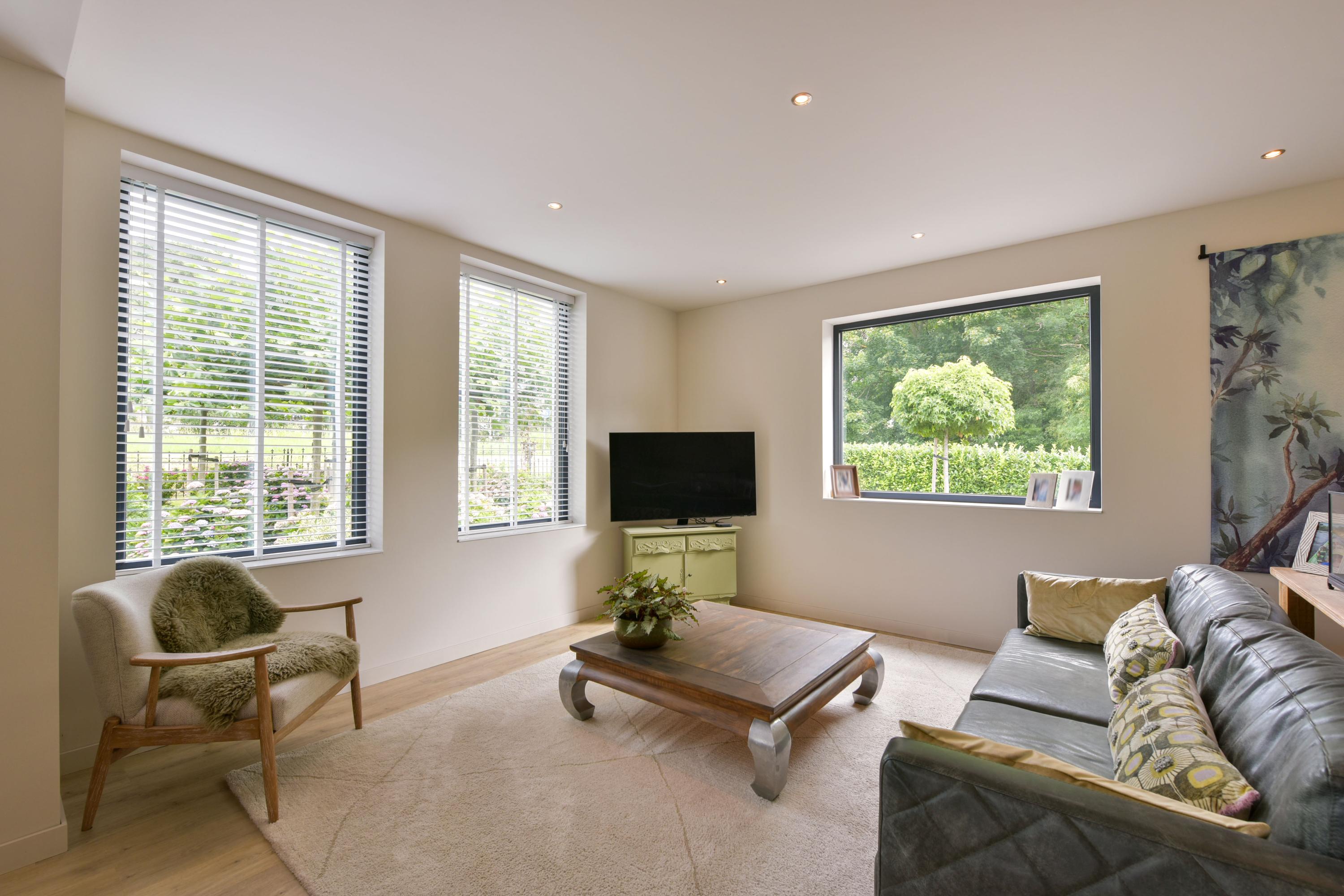 De woonkamer is een oase van licht en ruimte, dankzij de grote raampartijen rondom. Elke hoek van de kamer staat in verbinding met het buitenleven. Via dubbele openslaande deuren loop je zó de tuin in — perfect op zomerse dagen of voor een frisse start in de ochtend. De ruimte voelt open en tegelijk warm aan, een ideale plek om te ontspannen of gasten te ontvangen.