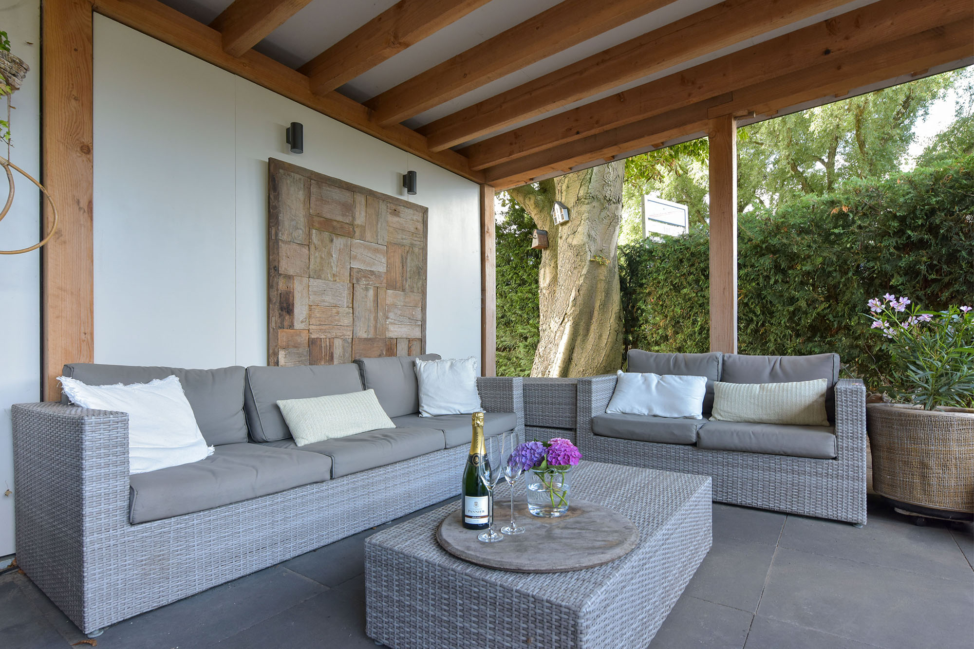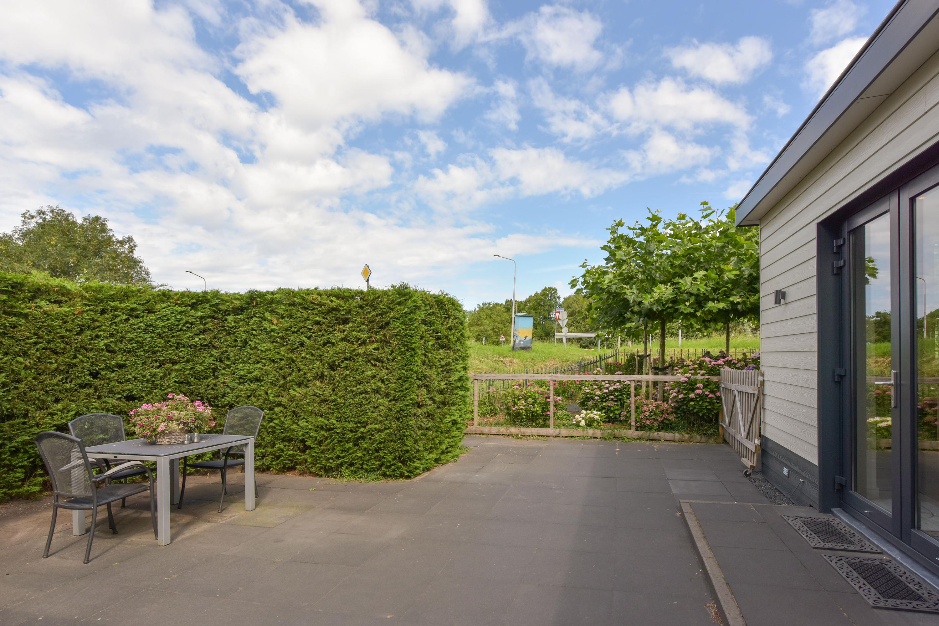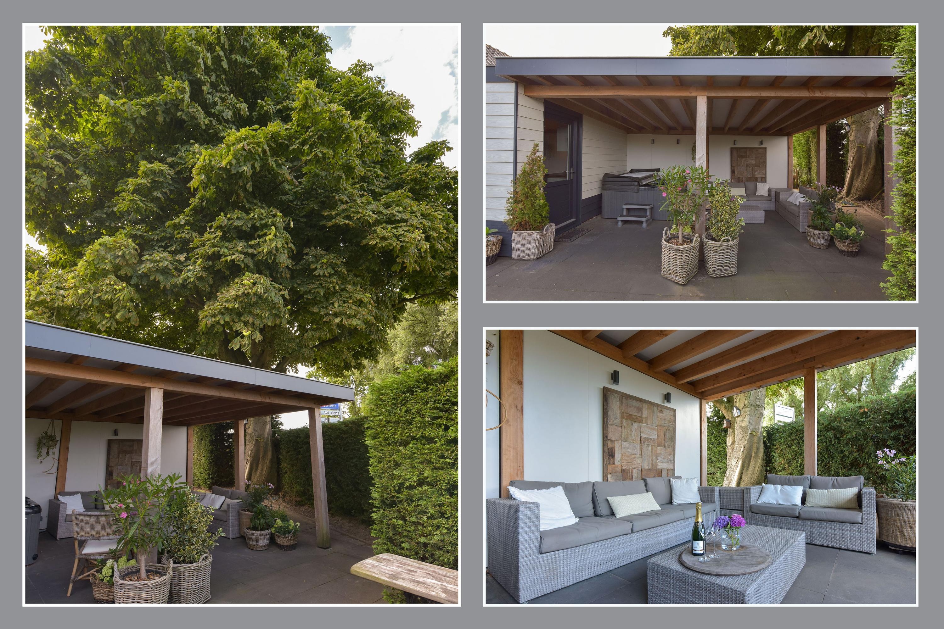 De woonkamer van de woning grenst aan een royaal terras. Dit gedeelte is volledig betegeld en biedt volop ruimte voor een grote eettafel, een loungeset of meerdere zitjes. Dankzij de ligging en de open ruimte geniet je hier van zon én privacy — perfect voor lange zomeravonden of een rustige ochtend met koffie en uitzicht op het groen. Grenzend aan dit terras bevindt zich een sfeervolle veranda, ingericht als comfortabele loungehoek. Hier is het ook bij minder mooi weer heerlijk toeven: overdekt, beschut en voorzien van elektra en sfeervolle verlichting. Er is bovendien een aparte aansluiting aanwezig voor een jacuzzi, die eventueel ter overname is. Het geheel voelt als een privé spa in je eigen achtertuin — luxe en ontspanning binnen handbereik.