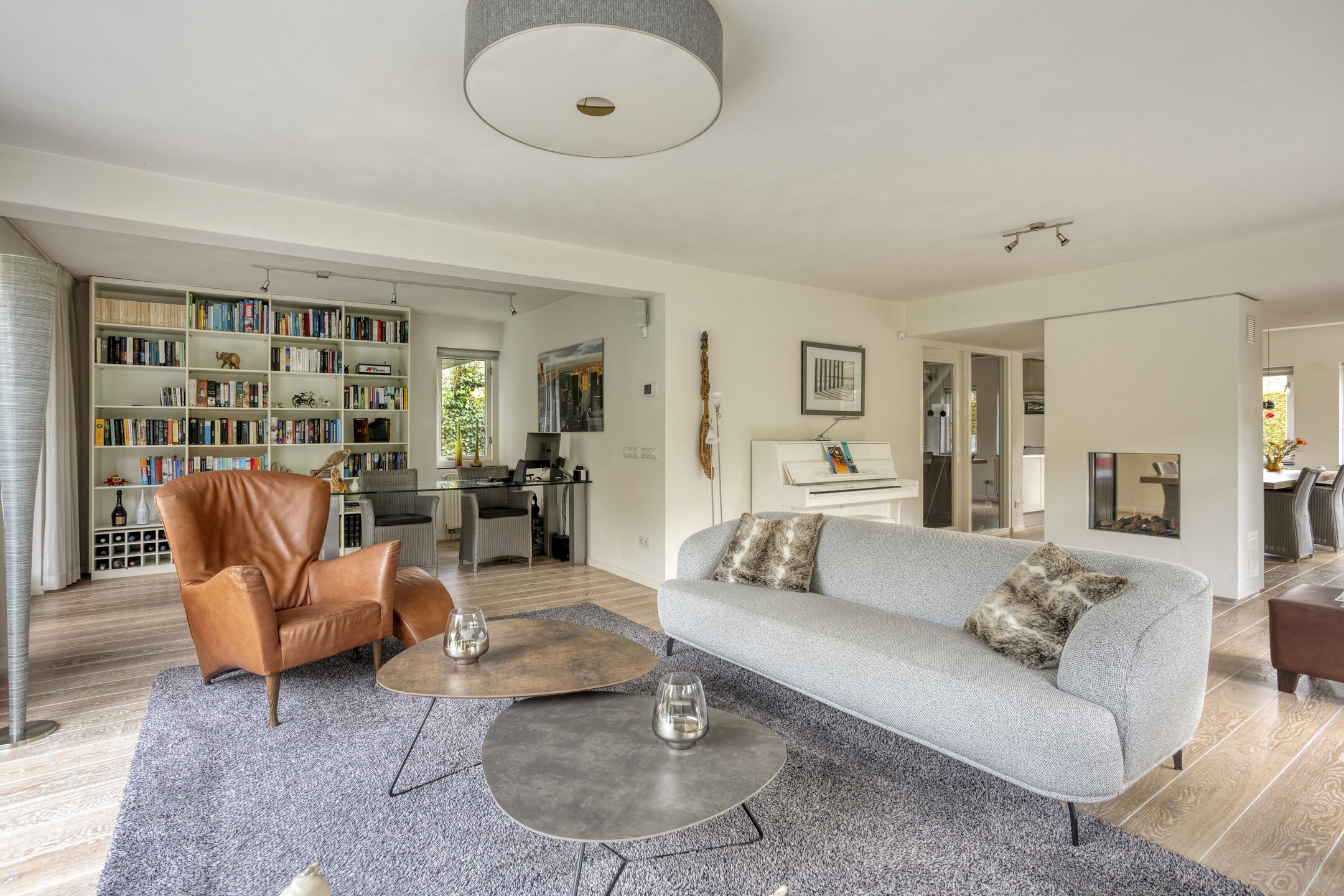 Zodra u binnenstapt, valt meteen de hoge hal met vide en prachtige houten open trap op. De hal biedt toegang tot het nette toilet met fontein, de meterkast en een handige bergkast achter de garderobe. Vanuit de hal loopt u via de glazen door naar de woonkamer en de woonkeuken. De massief eiken vloer geeft warmte, de strakke wanden en plafonds zorgen voor rust, en de Bellfire doorkijk gashaard verbindt de twee ruimtes op een heel stijlvolle manier.