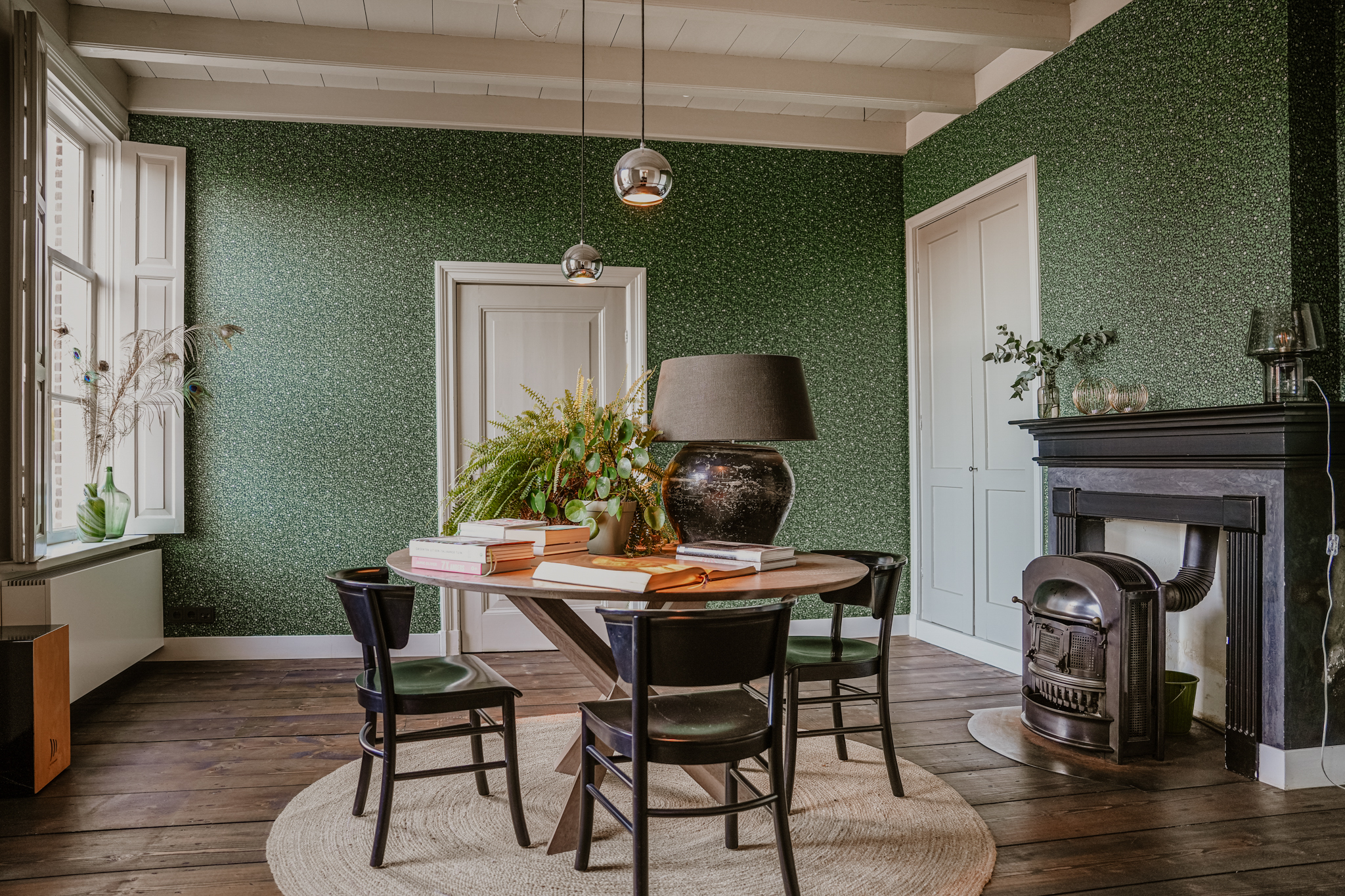 Centrale hal met aan de rechterzijde de voormalige gelagkamer. De antieke toogkast is een stille getuige van een ver verleden. De kamer is momenteel in gebruik als woonkamer, maar leent zich goed als werkruimte, atelier of studio. Er is een hoog balkenplafond, brede vloerdelen en hoge 6-ruits vensters zijn voorzien van Ruysdael monumentenglas, geflankeerd door binnenluiken. Er zijn tijdloze Jaga convectoren toegepast en een luxe Stuv haard zorgt voor maximaal comfort. Antieke paneeldeuren leiden naar de aangrenzende tuinkamer.