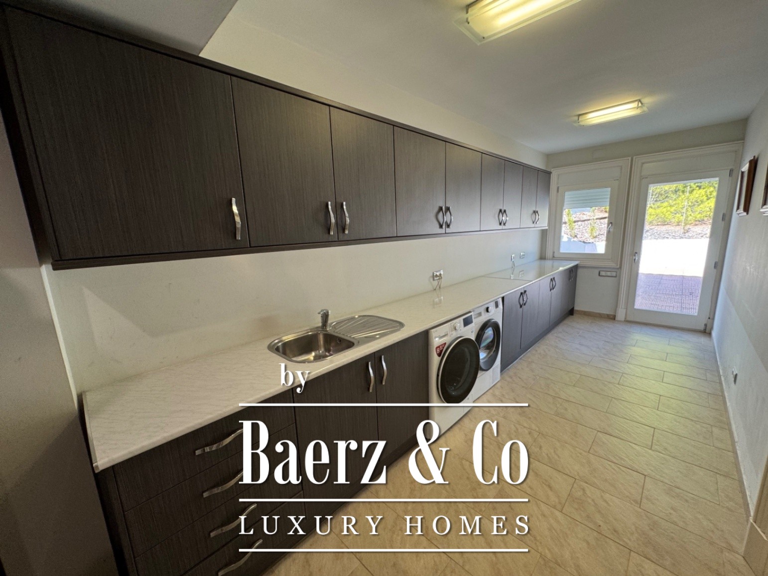 Op de begane grond beschikt de villa over een wasruimte, een privébioscoop, een complete spa-zone, een gym, een garage met ruimte voor 3 auto's en bovendien een onafhankelijk gastenappartement met 3 slaapkamers en een volledig uitgeruste keuken.