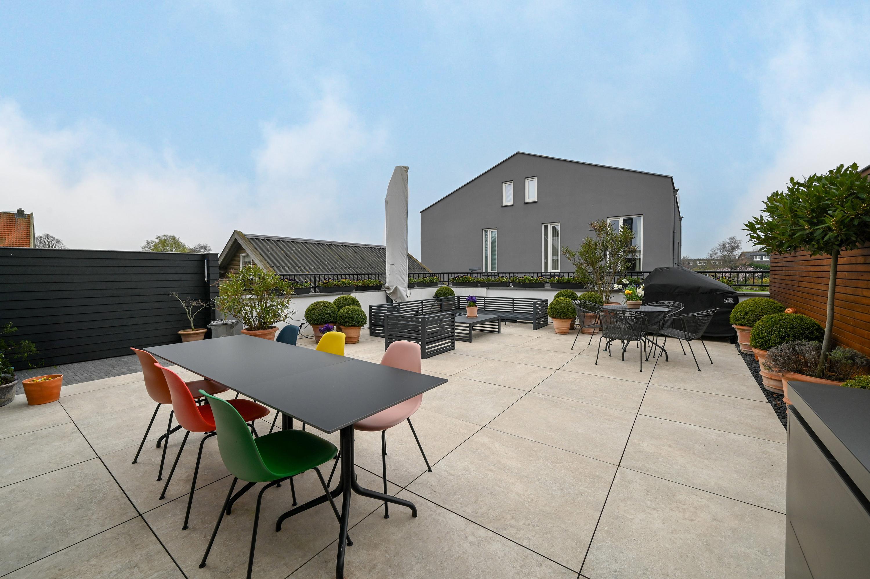 Het terras is volledig betegeld met grote, lichte tegels en omlijst met verzorgde beplanting langs de randen. Dankzij subtiele tuinverlichting ontstaat hier een stijlvolle en uitnodigende buitenruimte, waar u zowel overdag als ’s-avonds van het buitenleven kunt genieten. Het elektrische zonnescherm zorgt voor schaduw wanneer nodig.