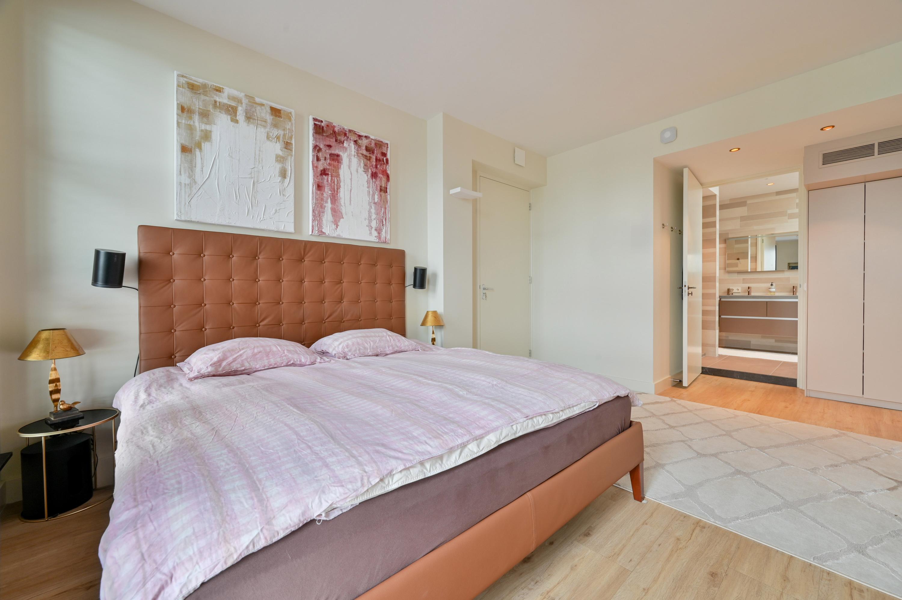 Aan de voorzijde bevinden zich nog twee kamers: momenteel is één kamer in gebruik als stijlvolle kantoorruimte terwijl de andere dienstdoet als riante master-bedroom. Deze master is uitgerust met een op maat gemaakte kastenwand en een luxe ensuite badkamer. De badkamer straalt elegantie uit met lichte designtegels, een inloopdouche met dubbele stort- en handdouche, een lichtstraat die daglicht overvloedig naar binnen laat, een dubbele wastafel met Hotbath kranen en voorzien van lades, een strak wandmeubel en een automatisch toilet met afstandsbediening.