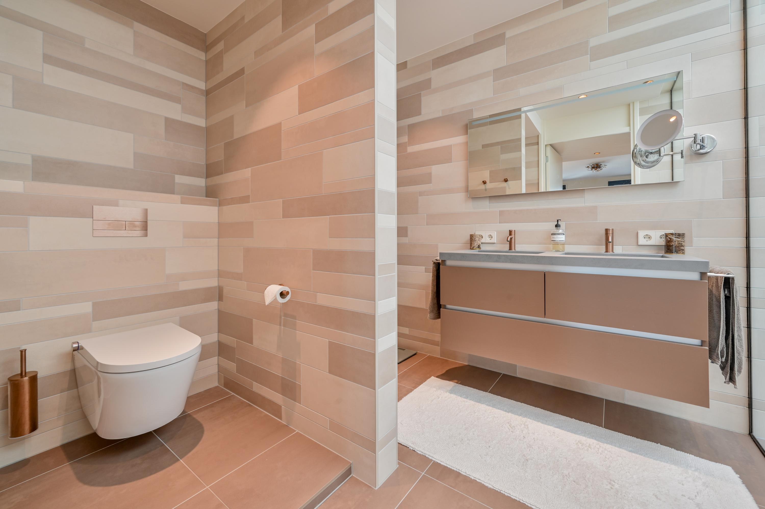Via de trap in de hal bereikt u de eerste verdieping, waar vier royale slaapkamers zijn gesitueerd. De twee slaapkamers aan de achterzijde zijn met elkaar verbonden door een open doorgang en beschikken over een eigen badkamer met toilet, een ruime wastafel, een moderne douche en handdoekenradiator. Net als in de rest van de woning is hier ook airconditioning aanwezig, voor optimaal comfort het hele jaar door.